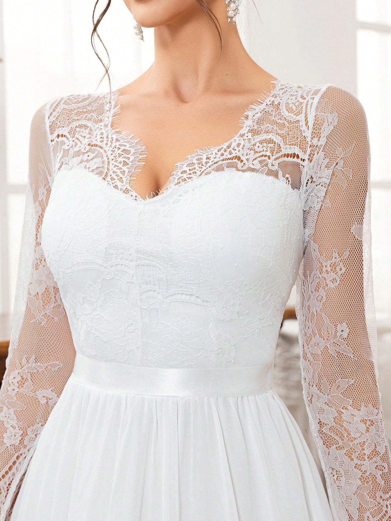 Deep V Neck Long Sleeve Lace & Mesh Hemline Elegant Wedding Gown