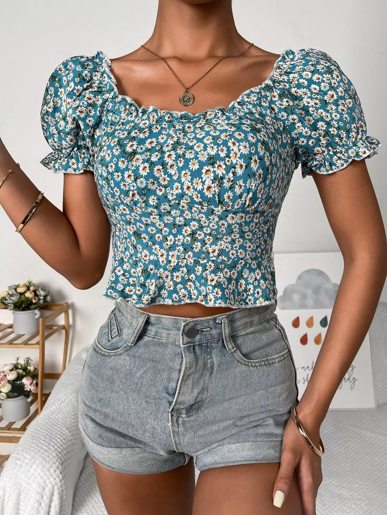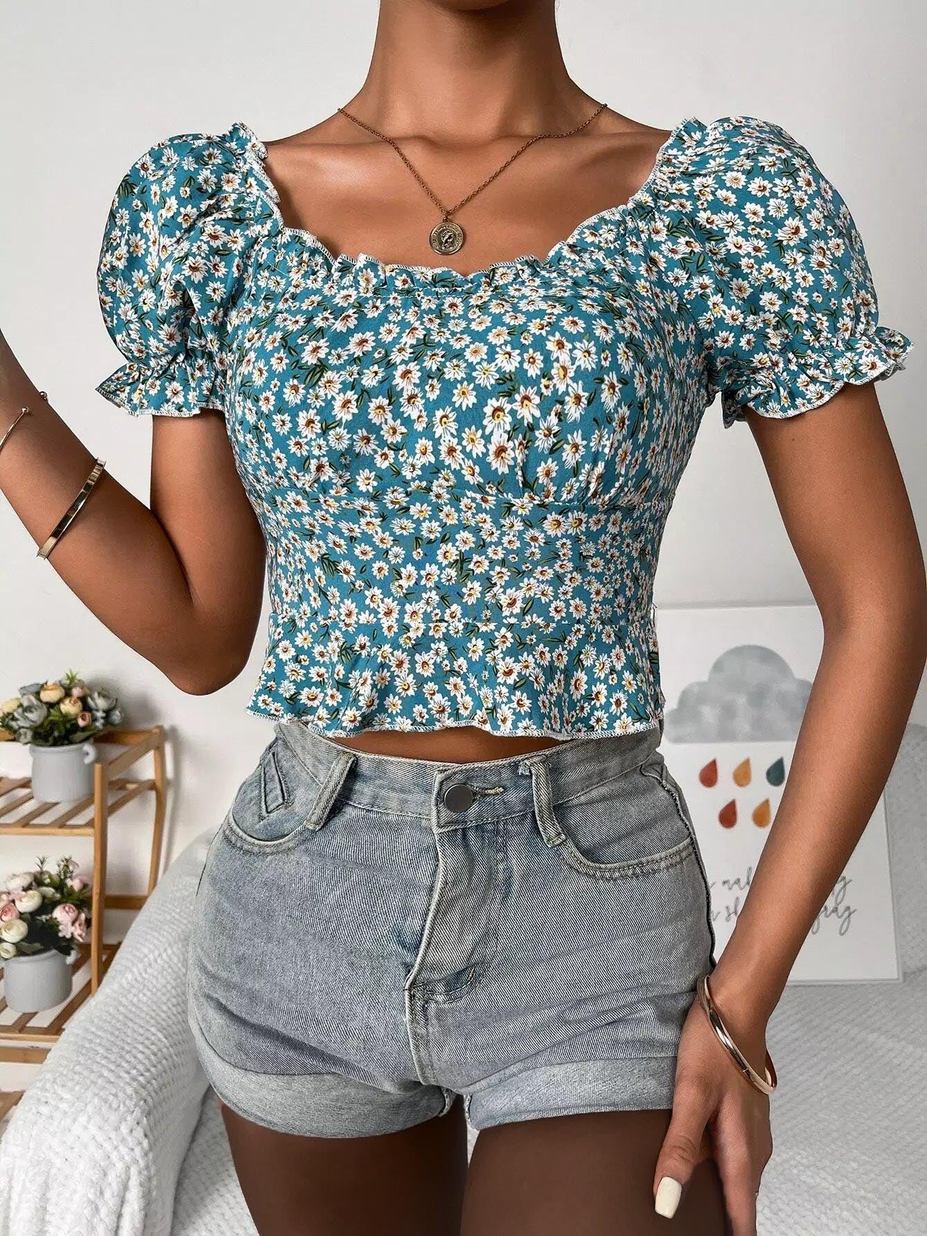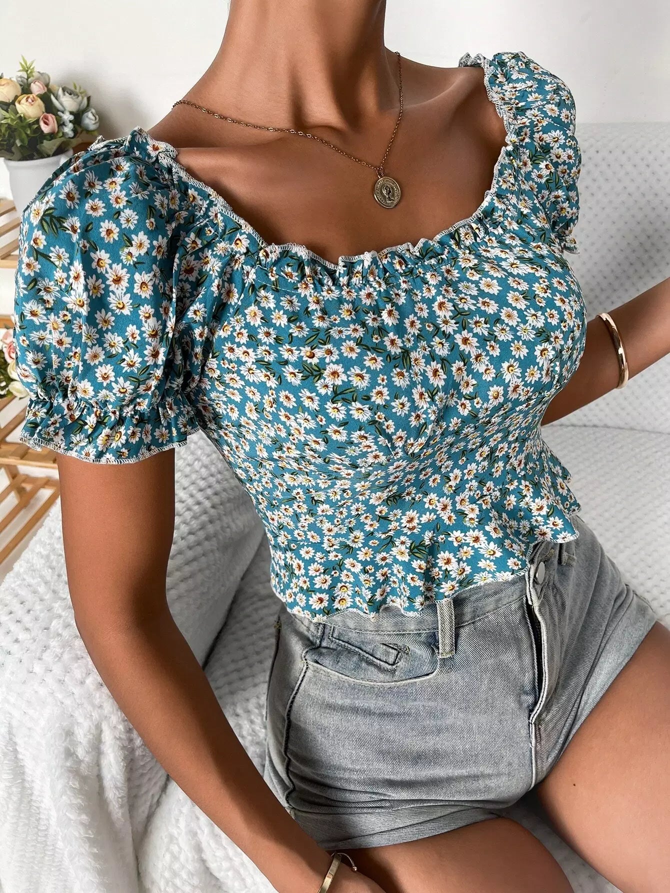 Ditsy Floral Frill Trim Peplum Top