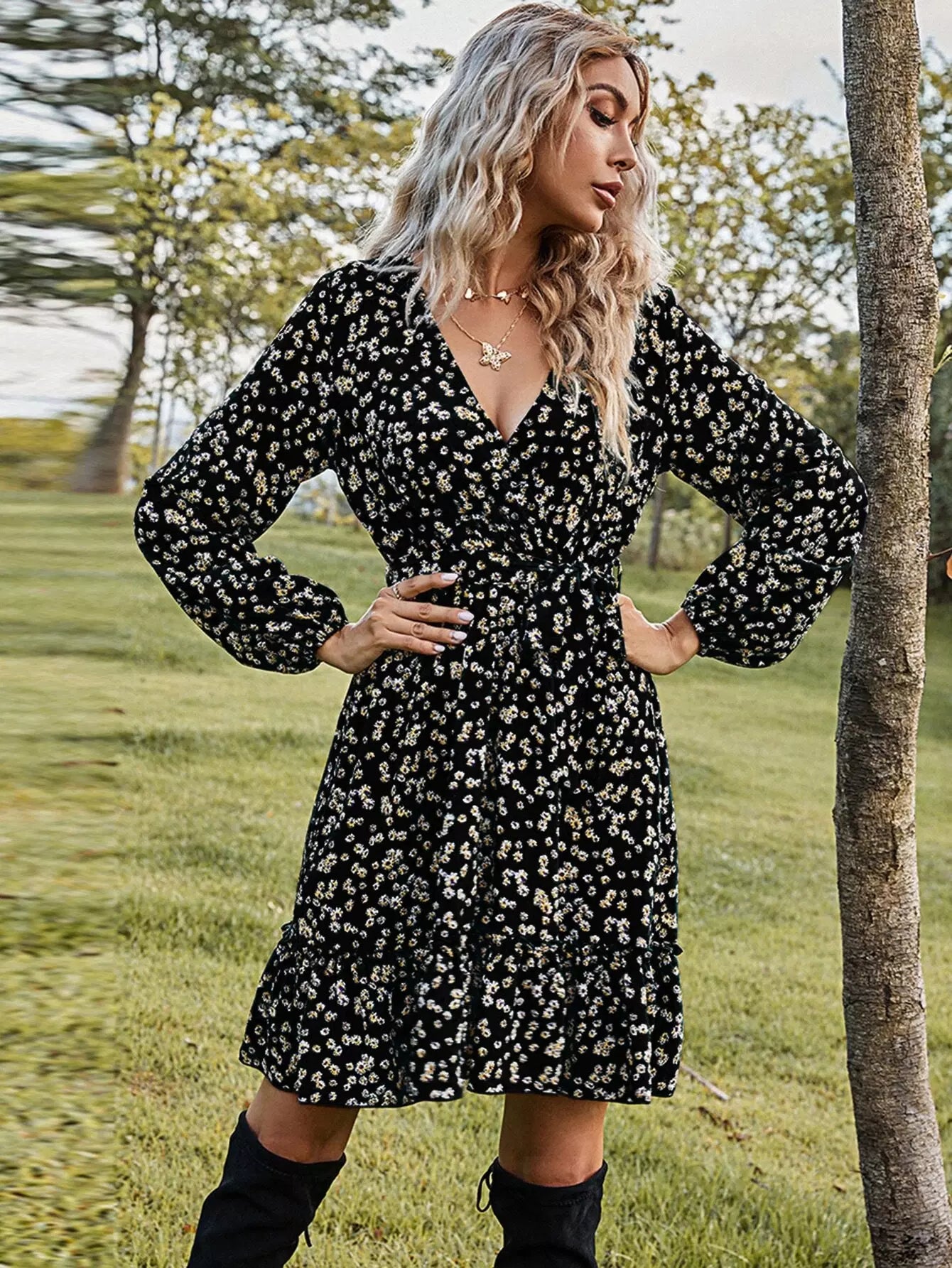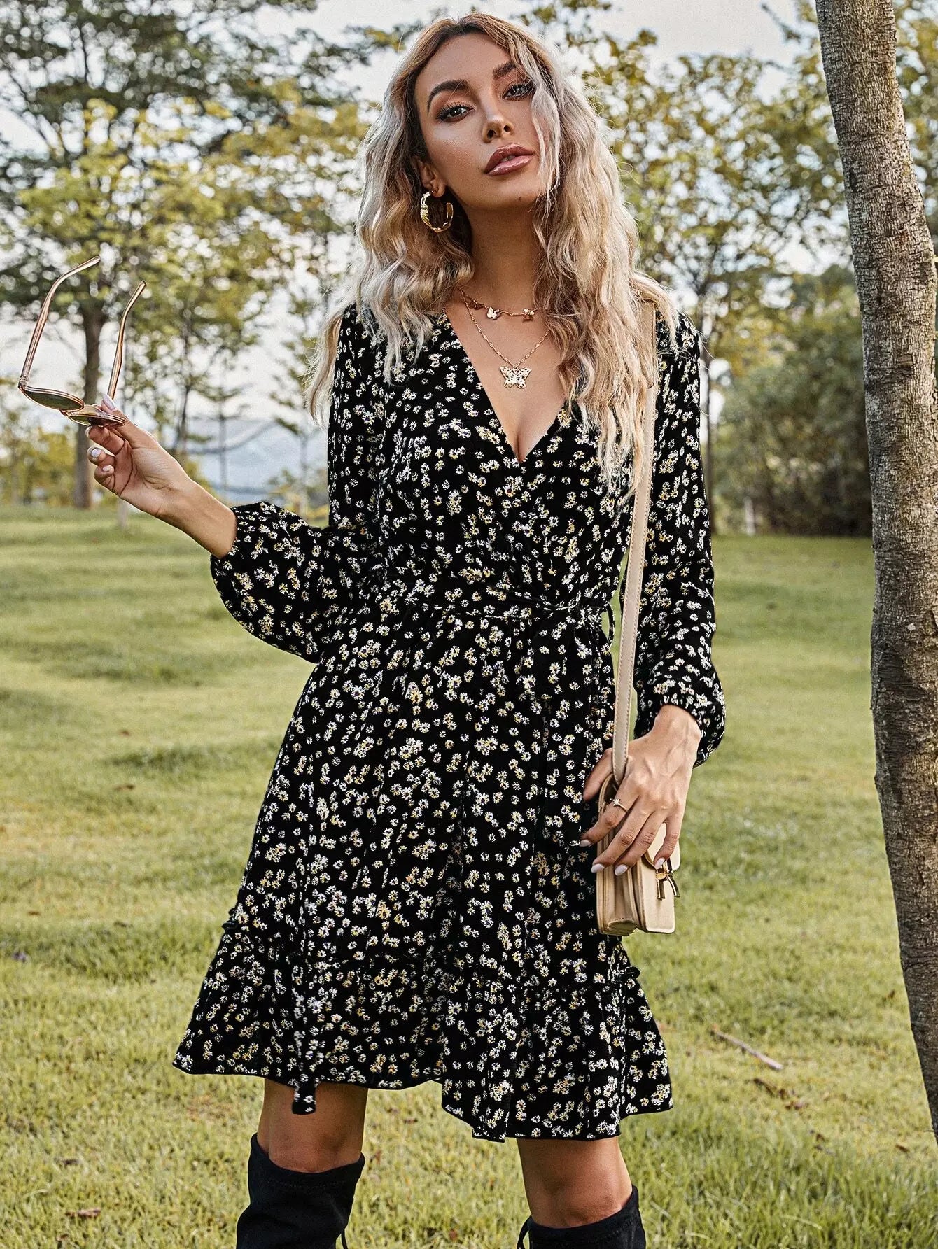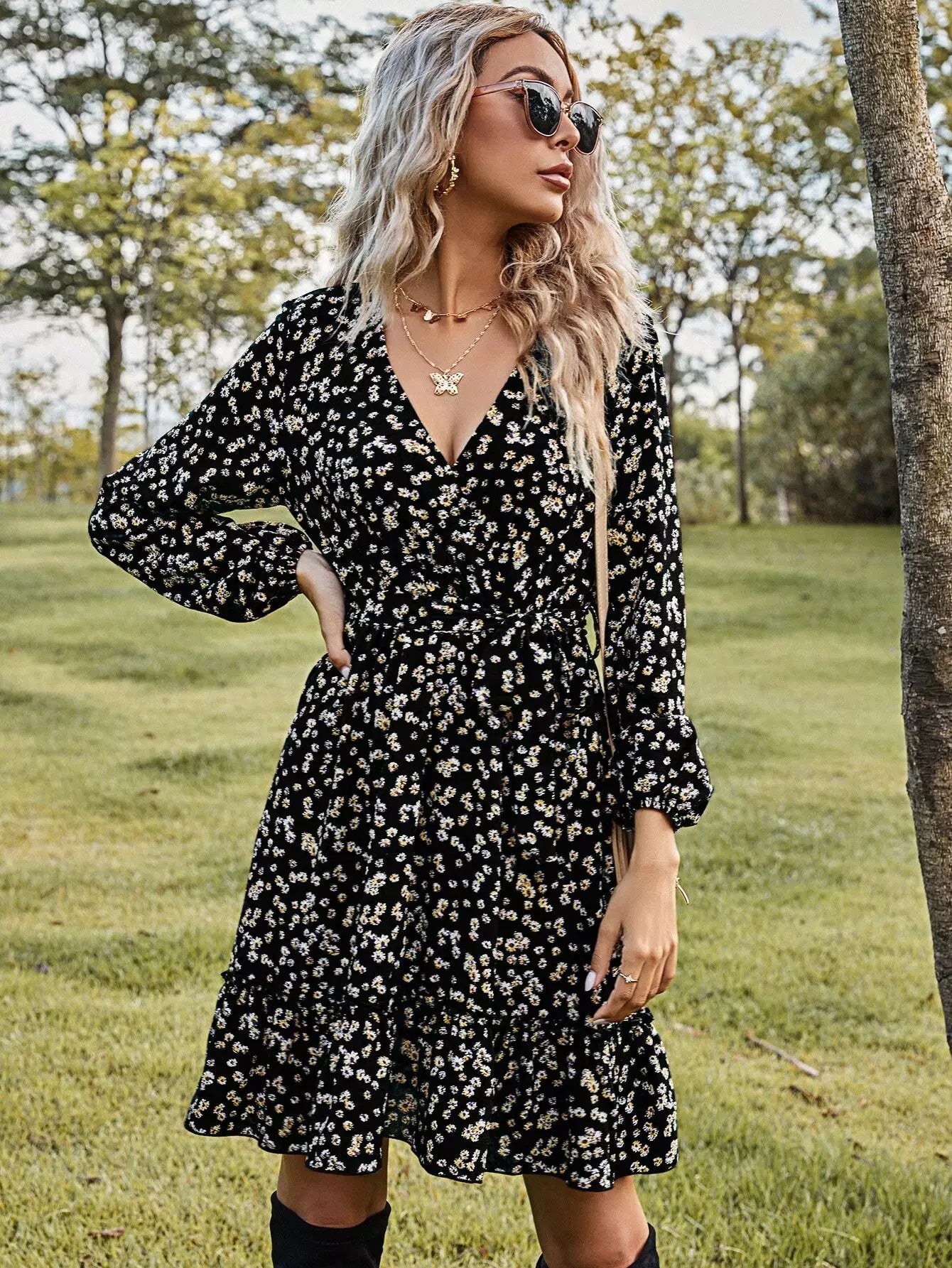 Ditsy Floral Print Ruffle Hem Dress Without Belt