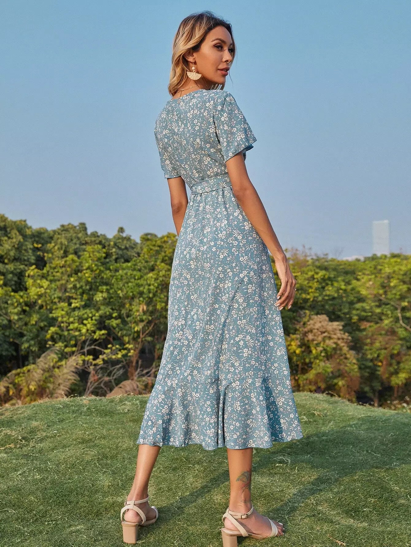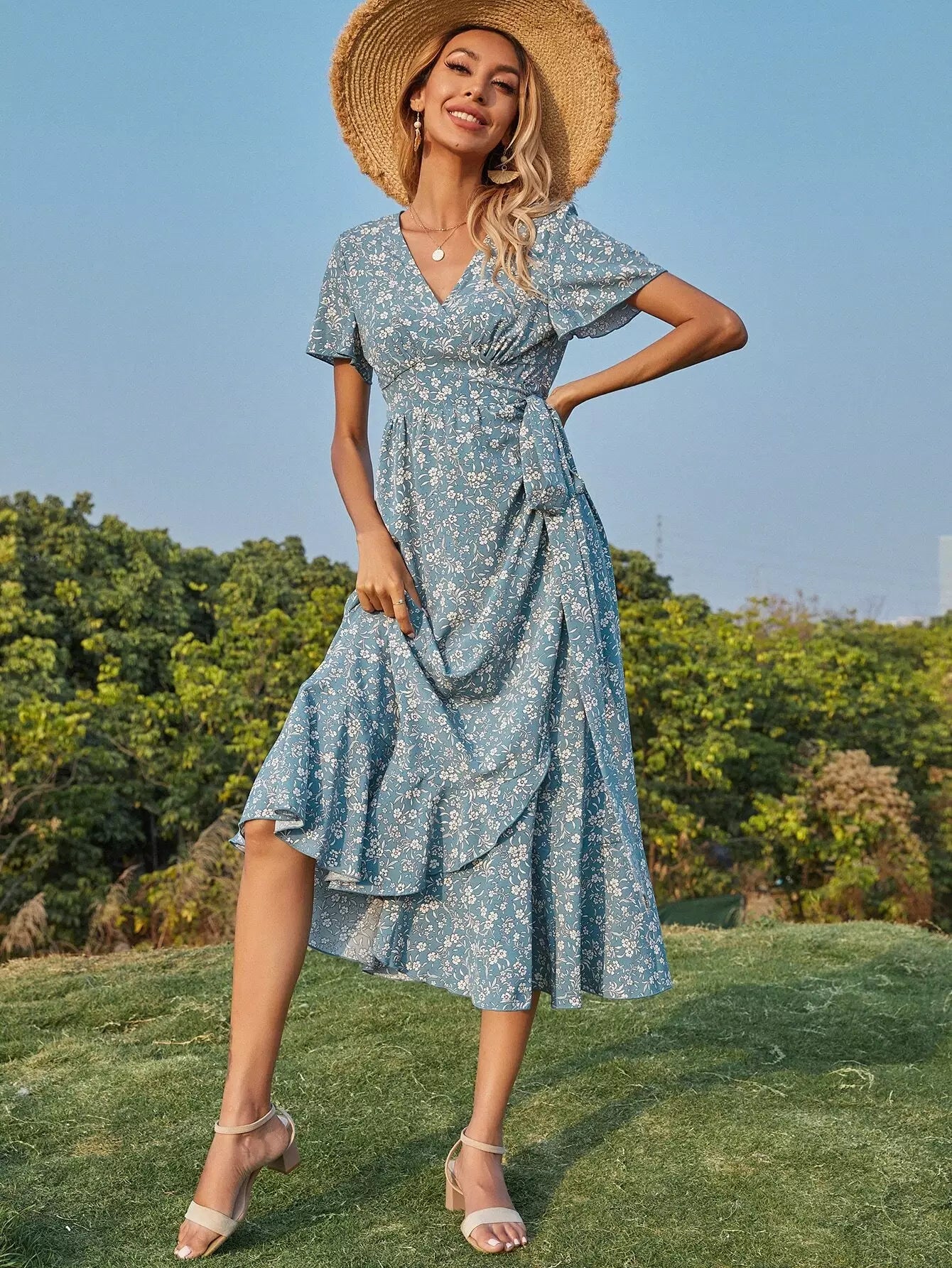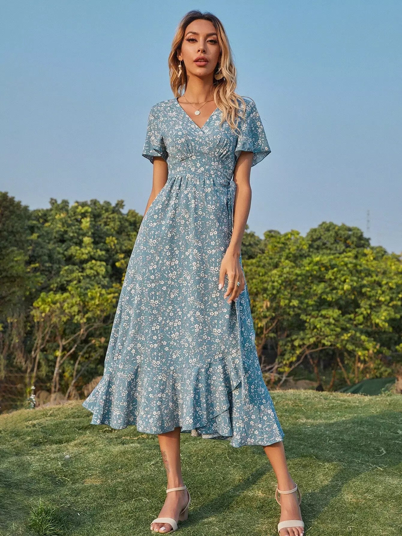 Ditsy Floral Print V-neck Ruffle Hem Dress