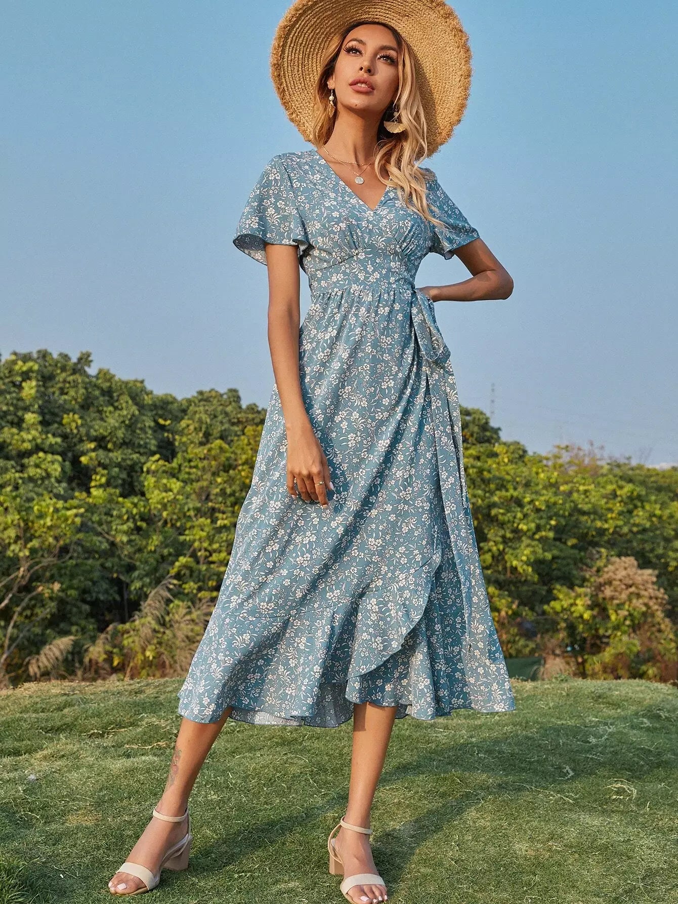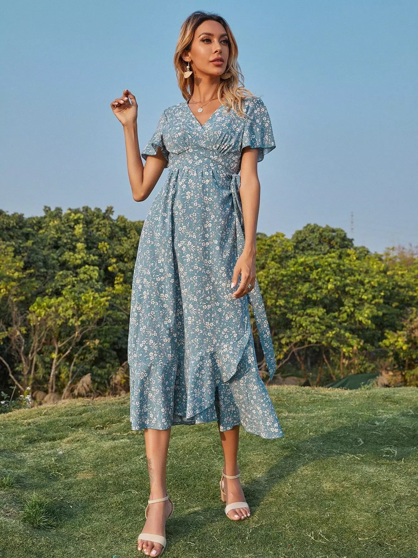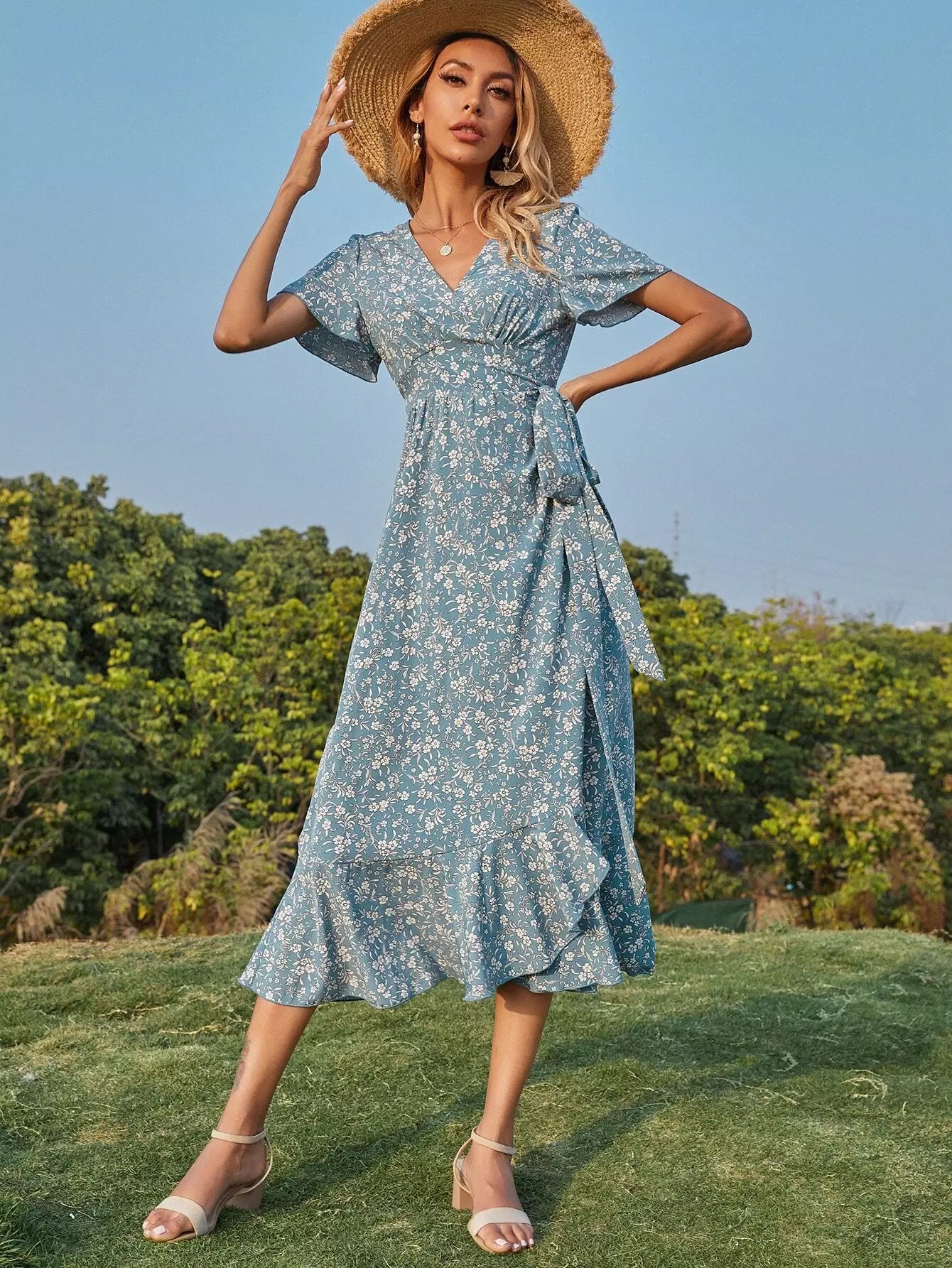 Ditsy Floral Print V-neck Ruffle Hem Dress