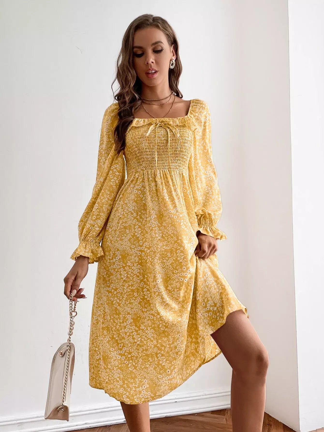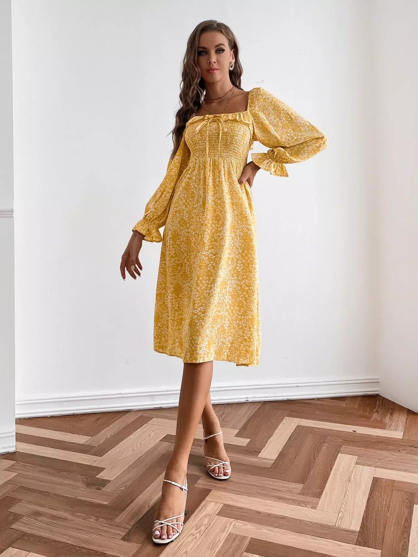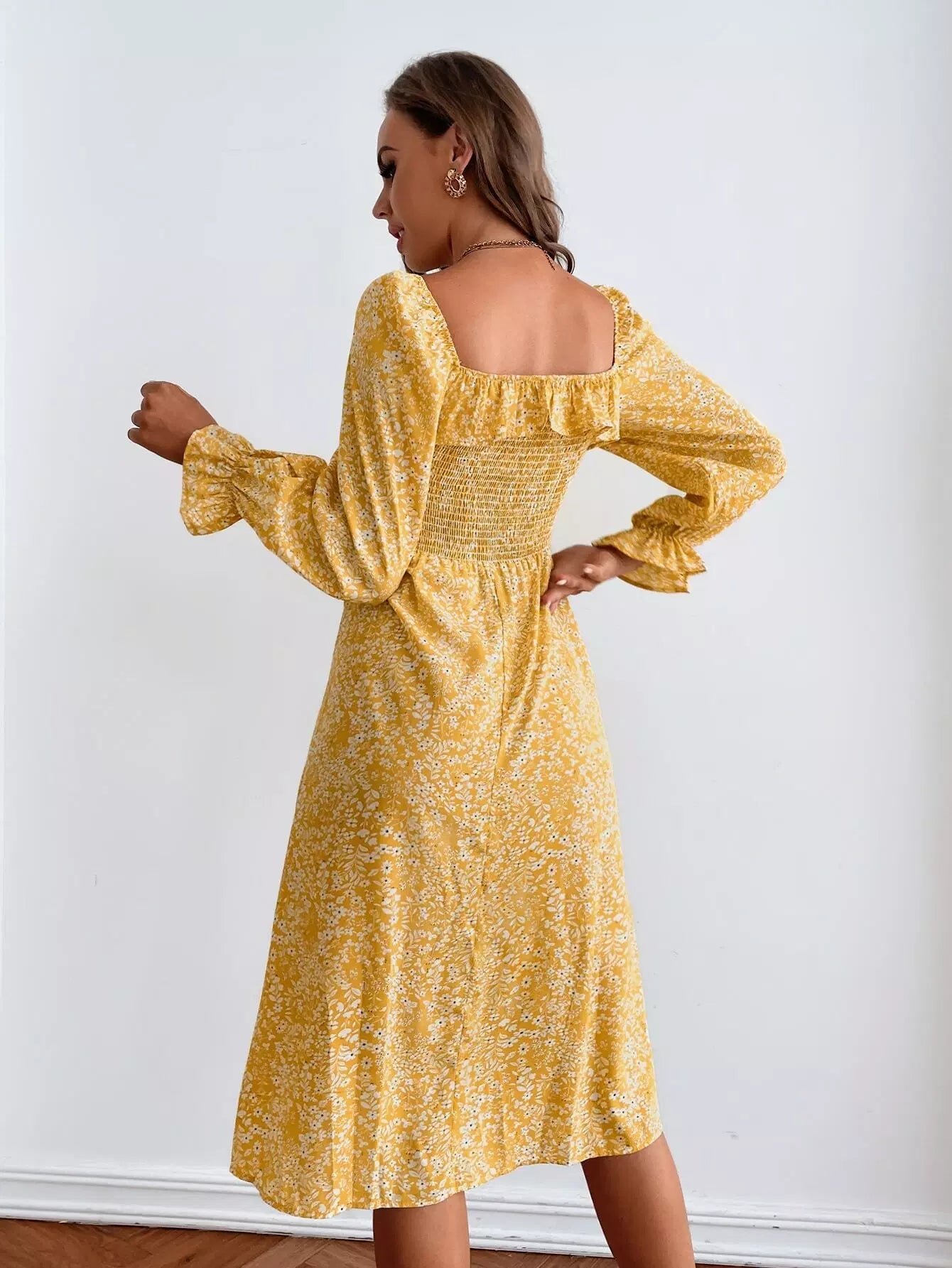 Ditsy Floral Shirred Ruffle Trim A-line Dress