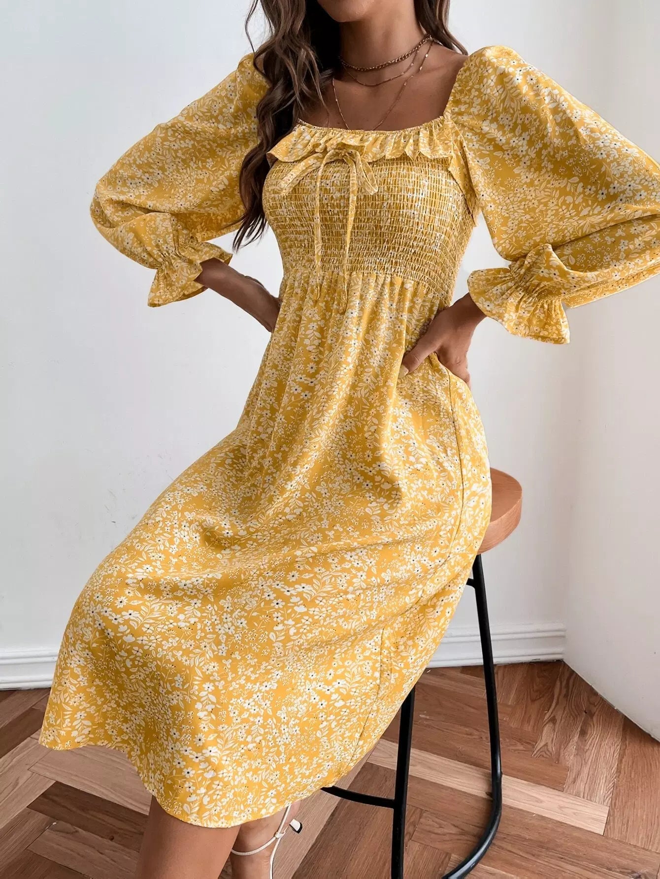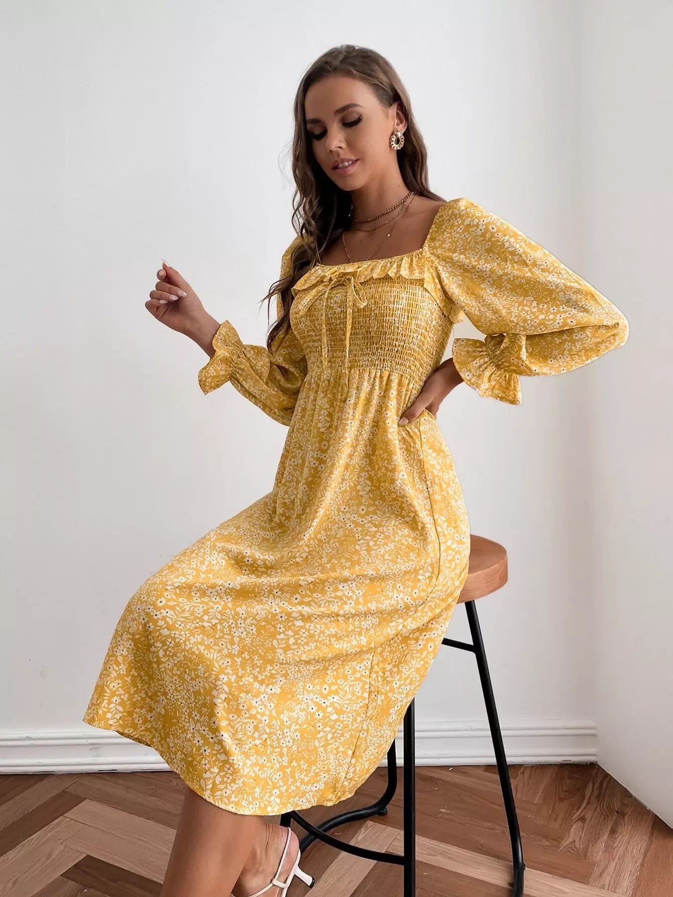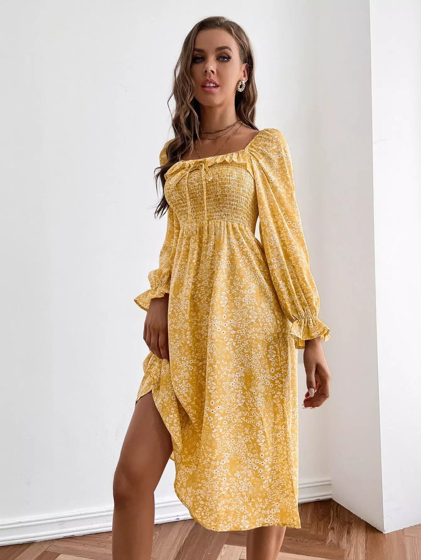 Ditsy Floral Shirred Ruffle Trim A-line Dress