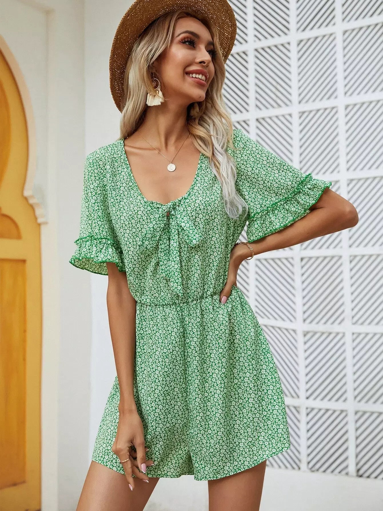 Ditsy Floral Tie Front Flounce Sleeve Romper