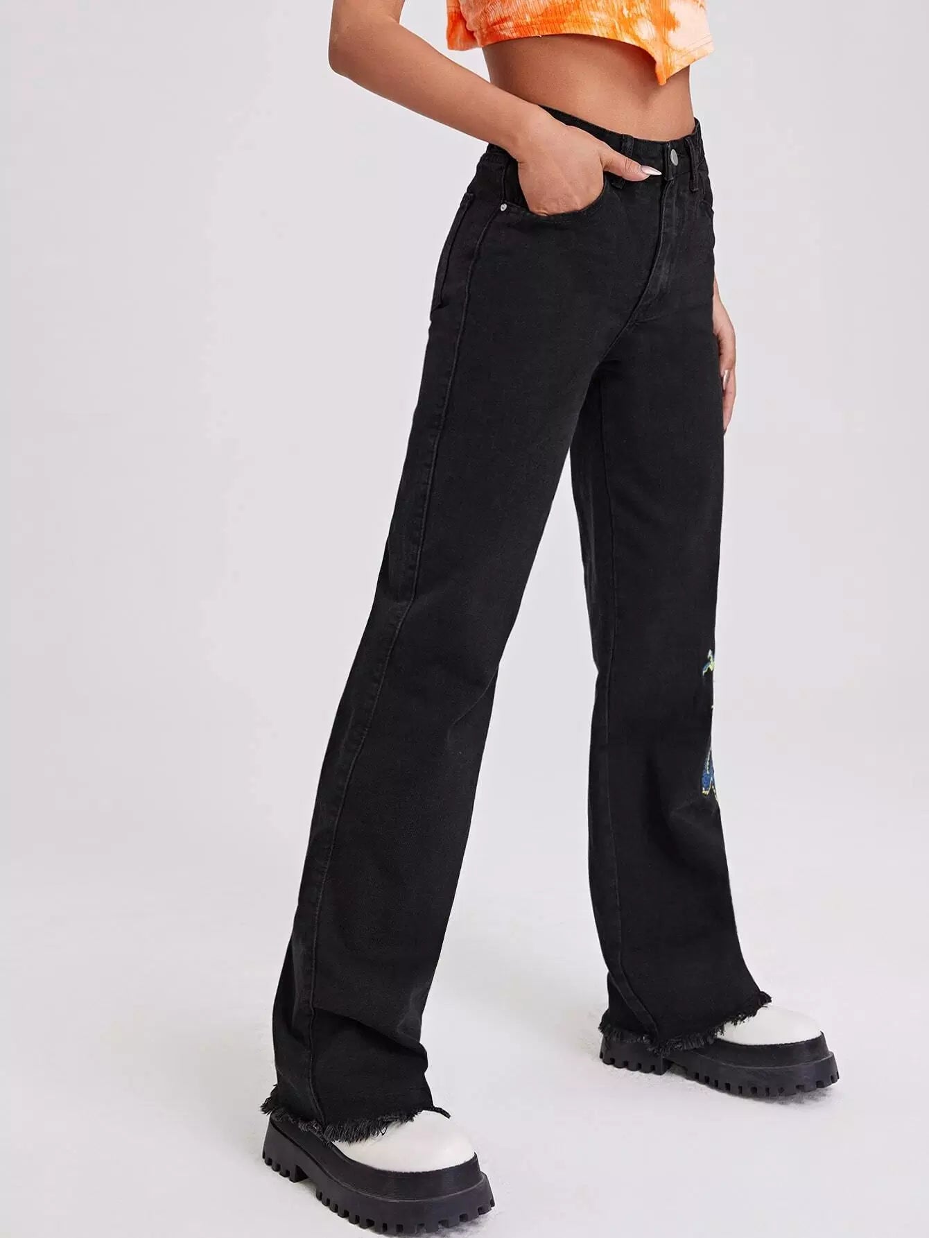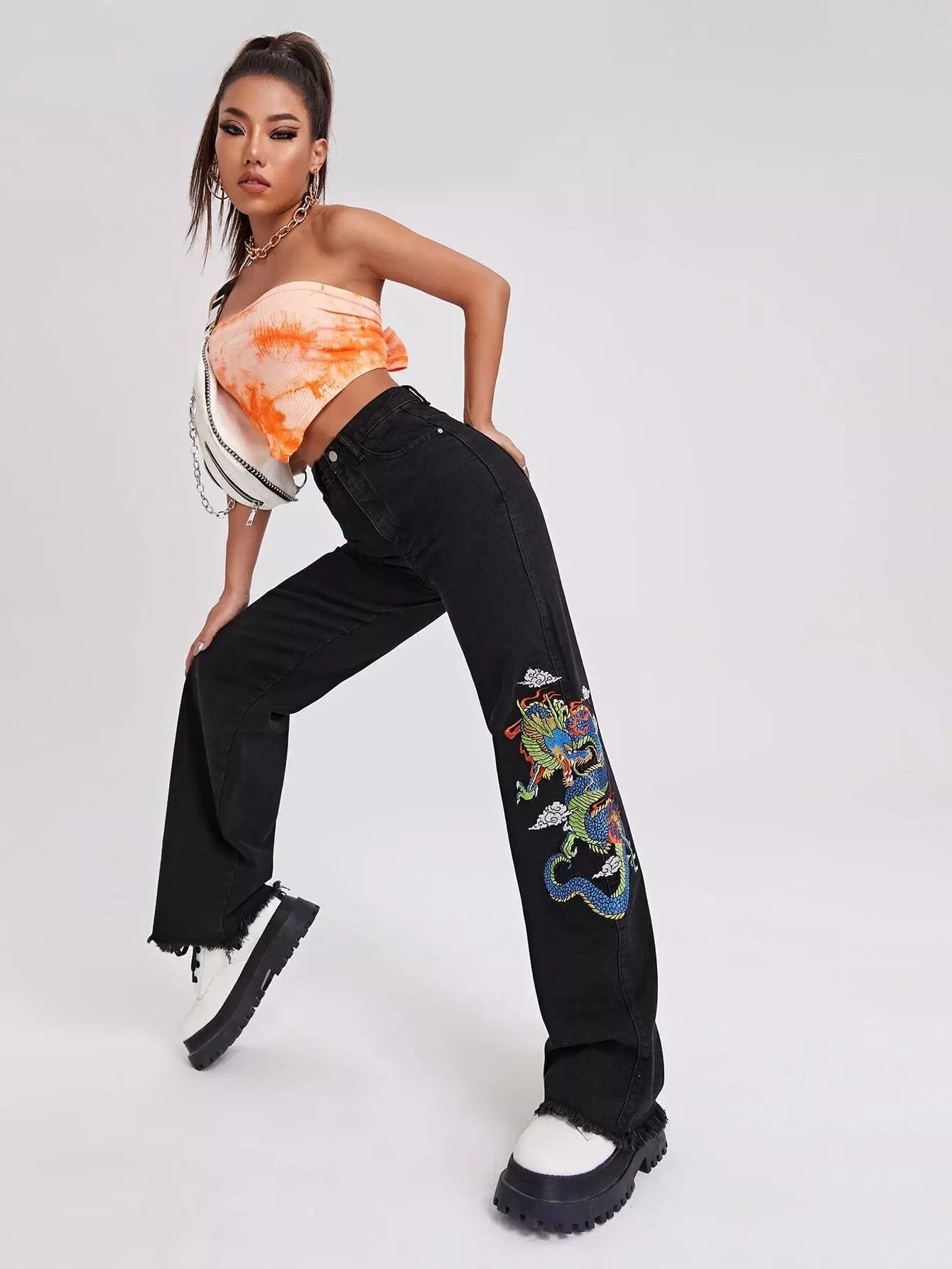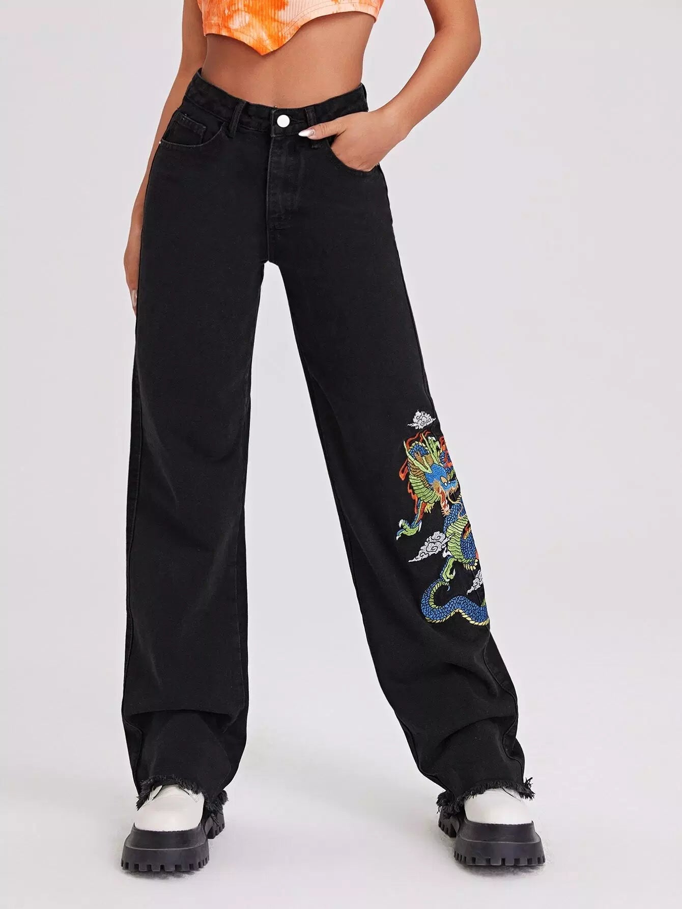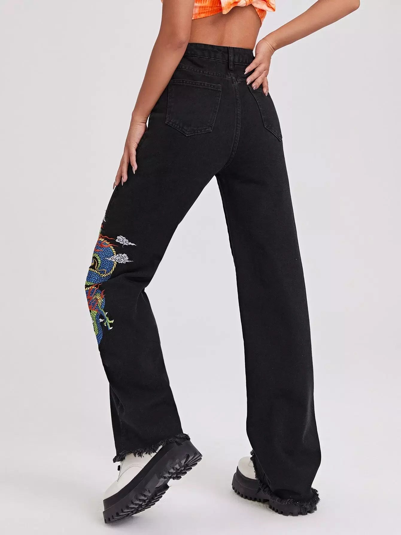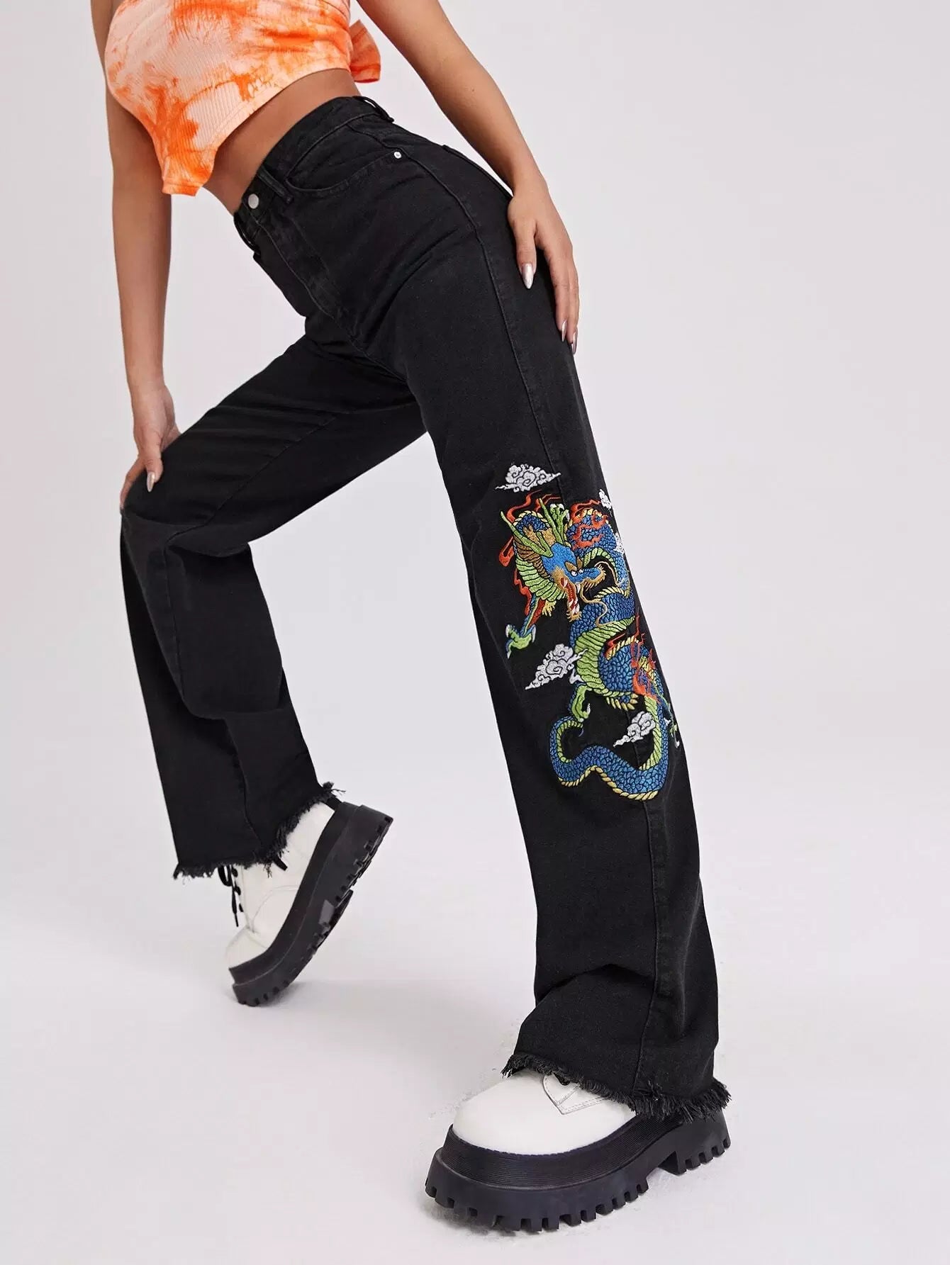 Dragon Embroidered Raw Hem Boyfriend Jeans