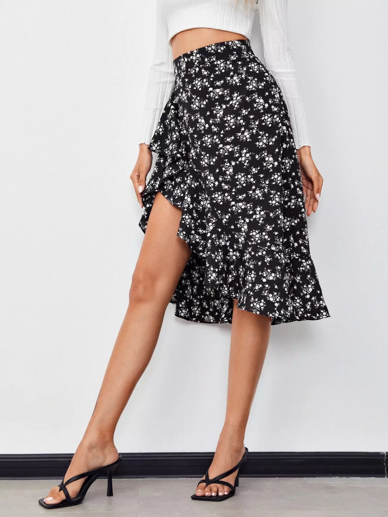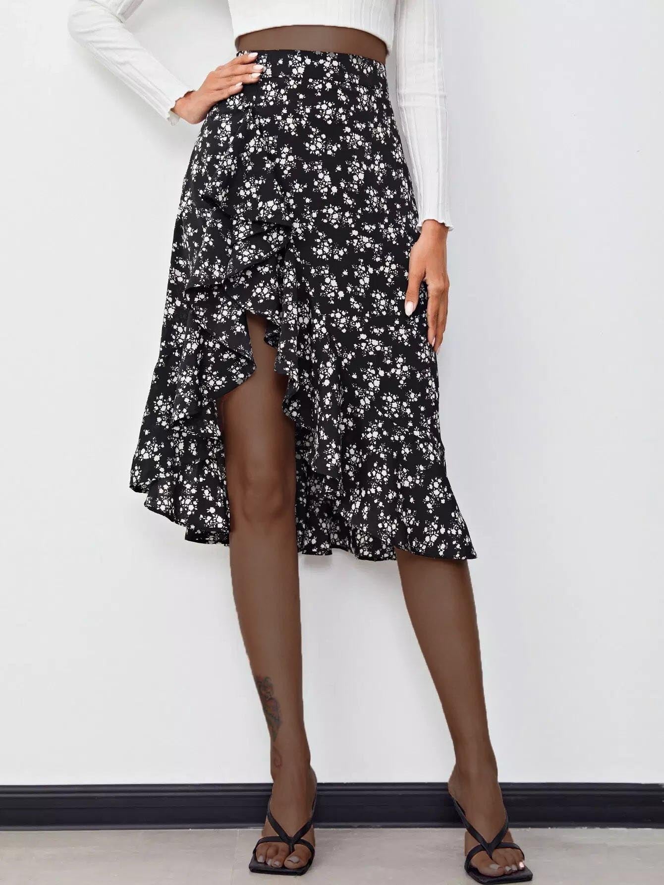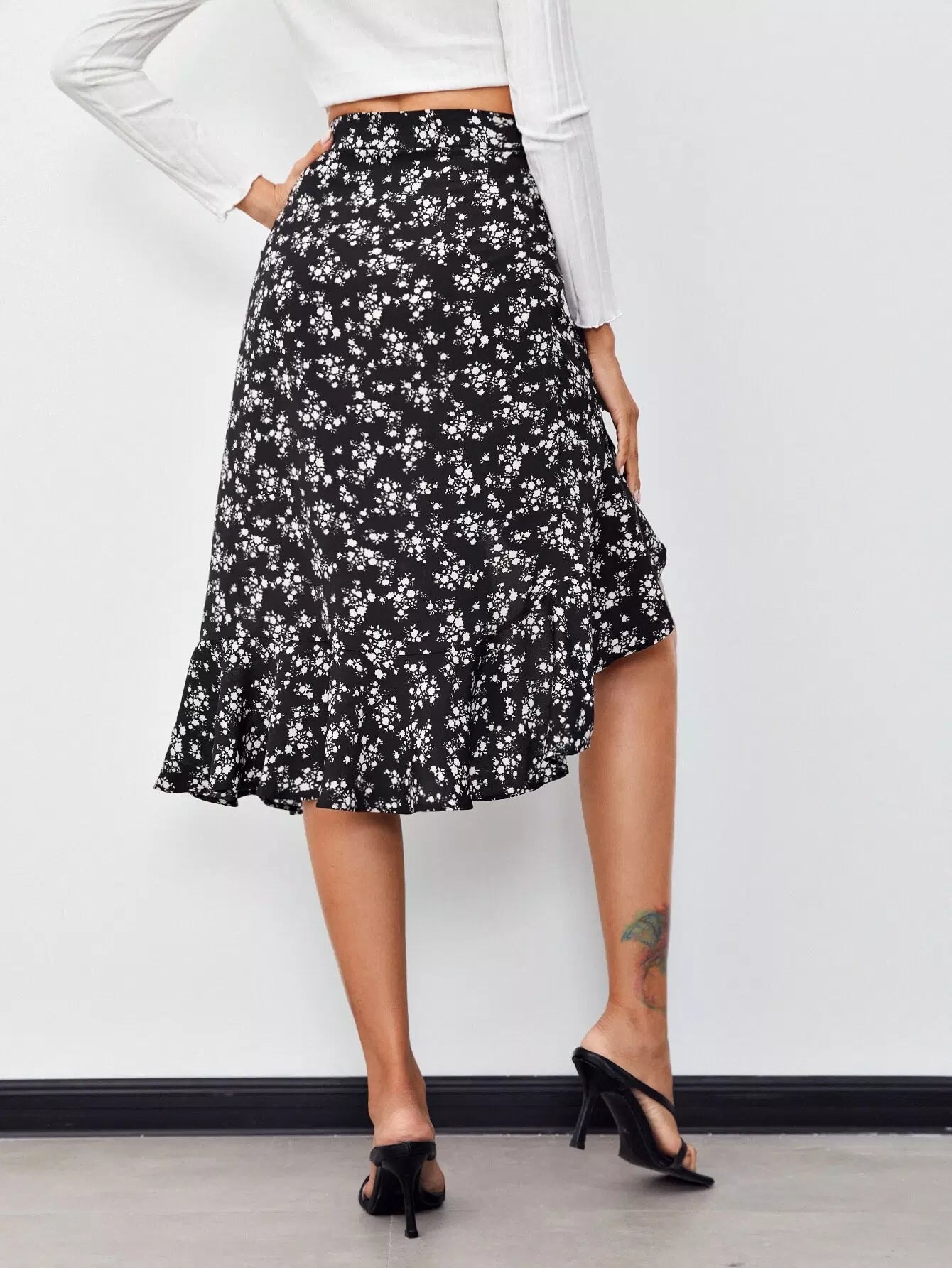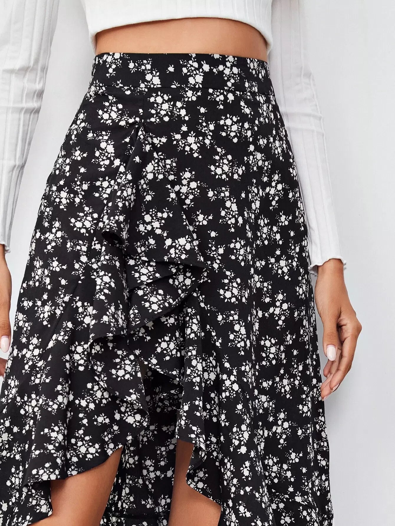 Draped Front Asymmetrical Ruffle Trim Allover Print Skirt