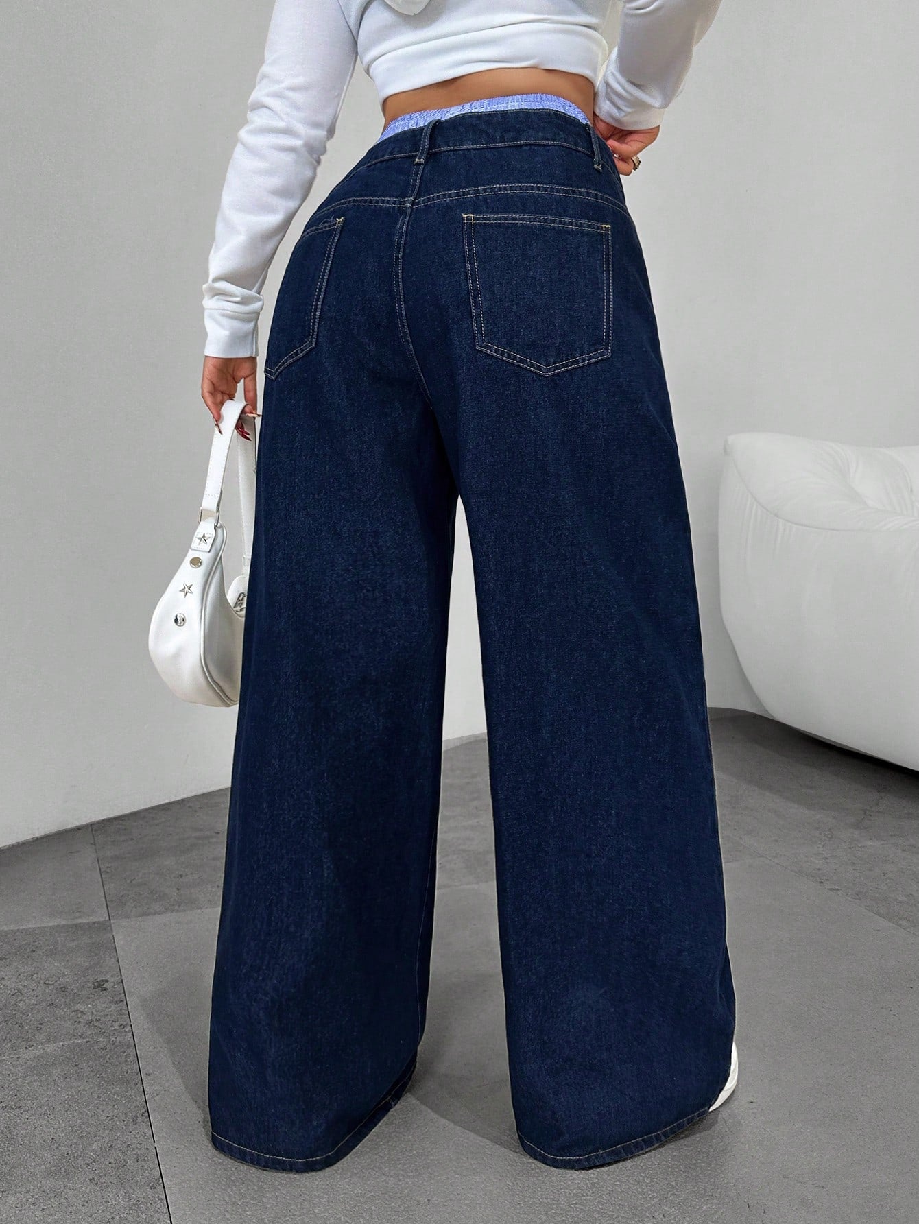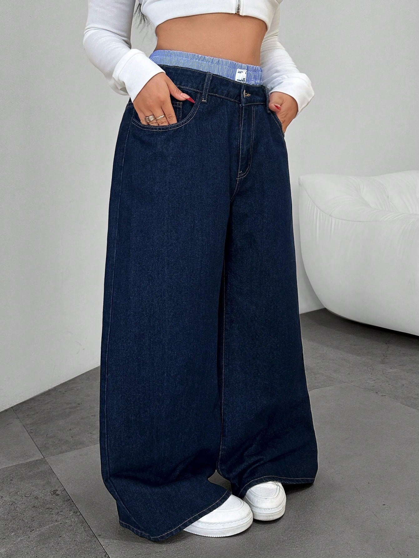 Dripcurv Plus-Size Women's Blue Patchwork Y2K Straight Leg Jeans