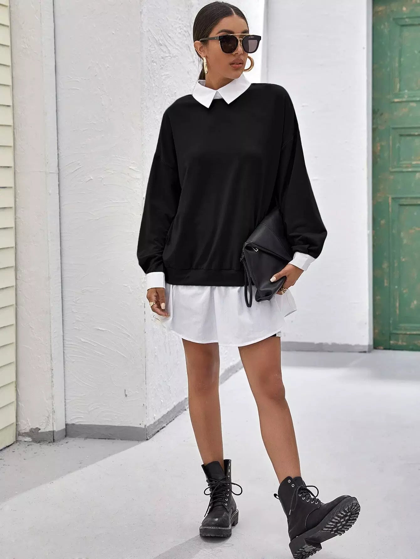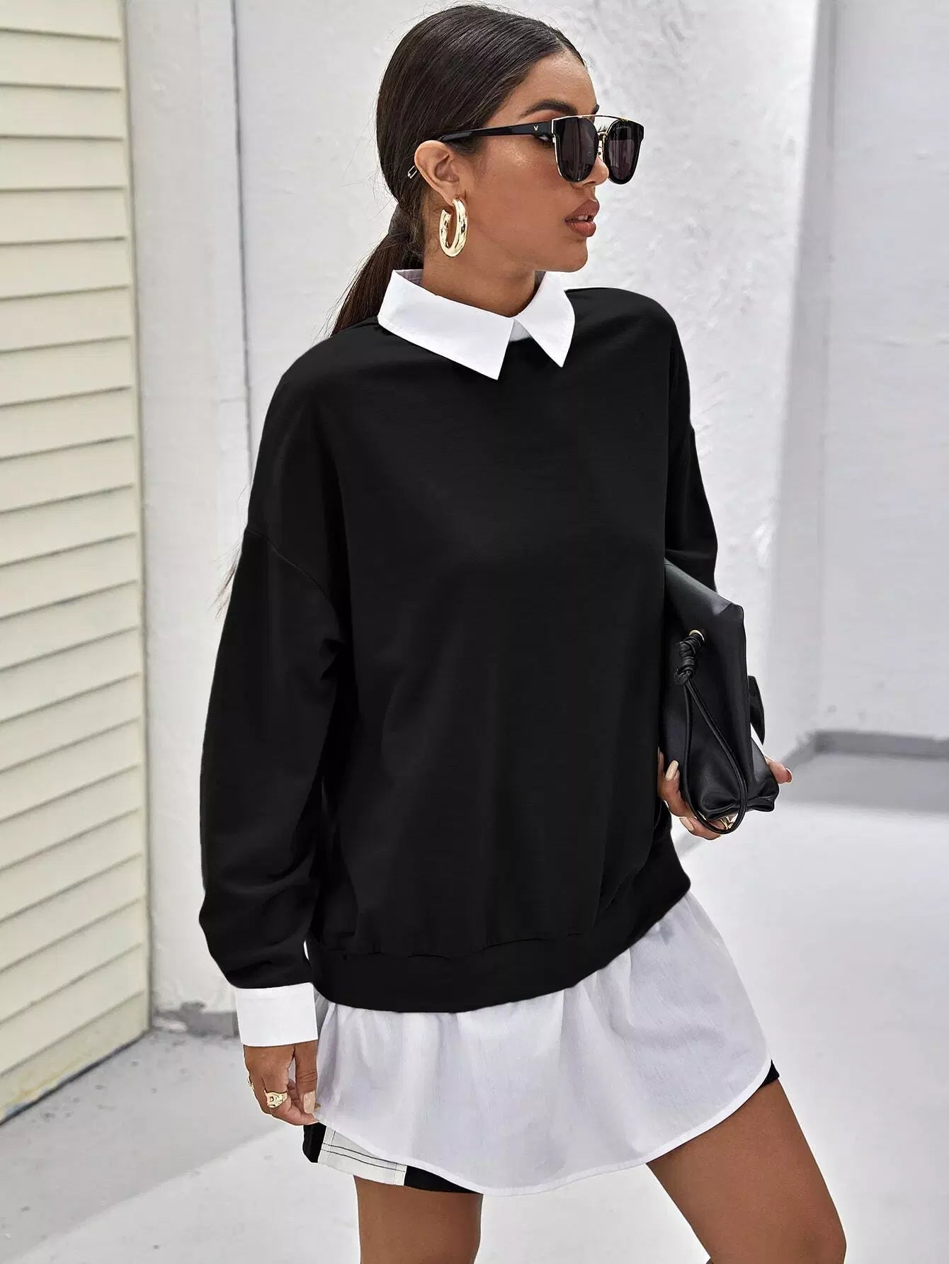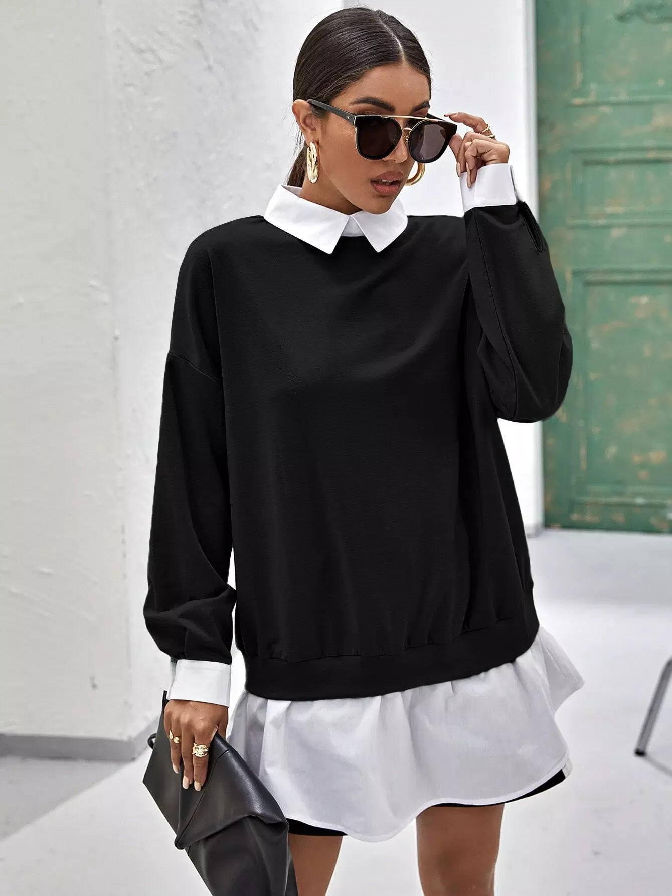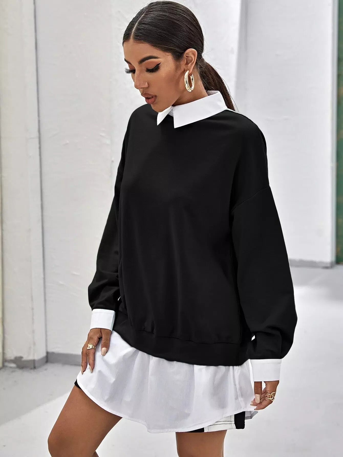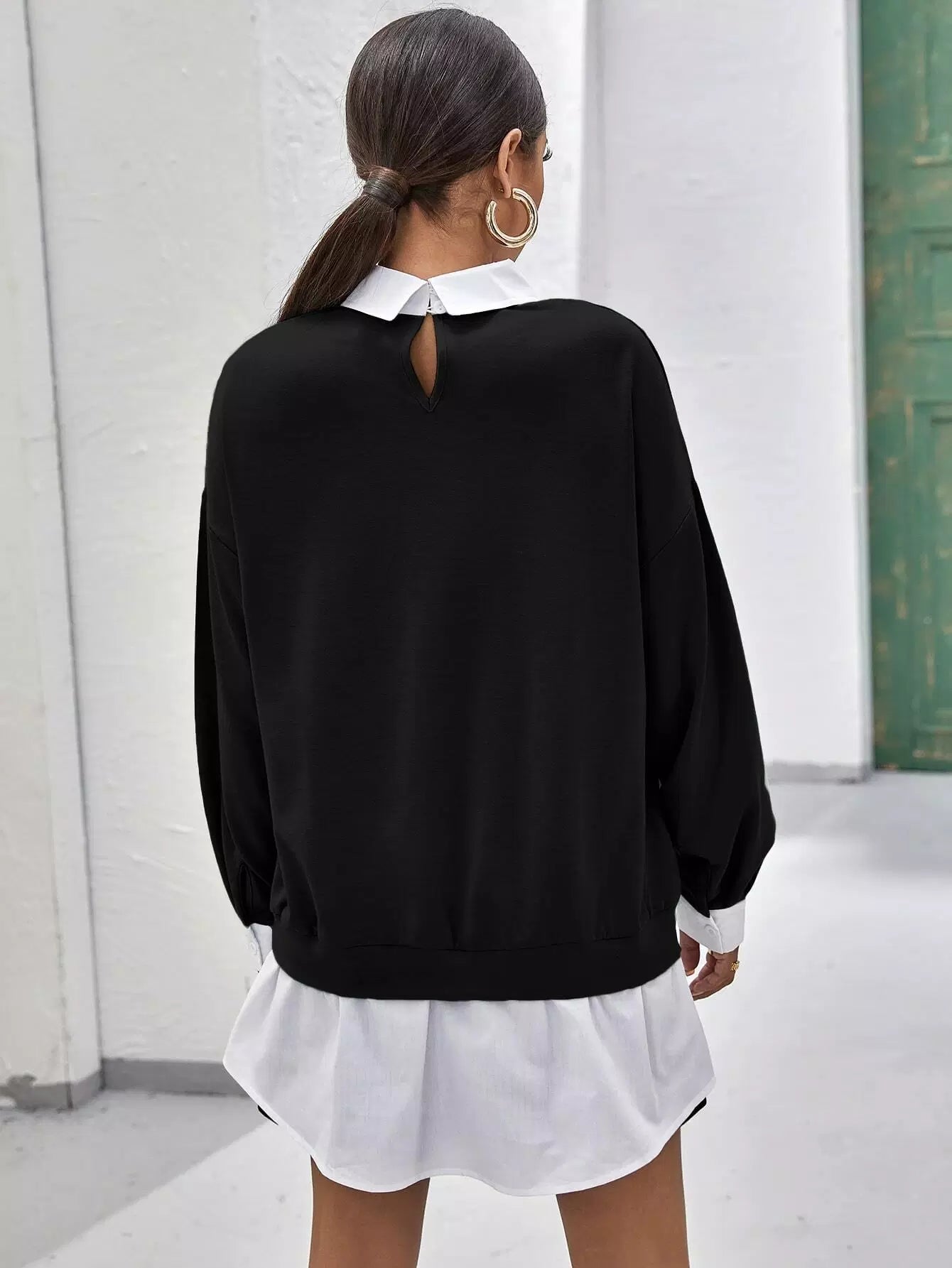 Drop Shoulder Contrast Collar Ruffle Hem 2 In 1 Pullover