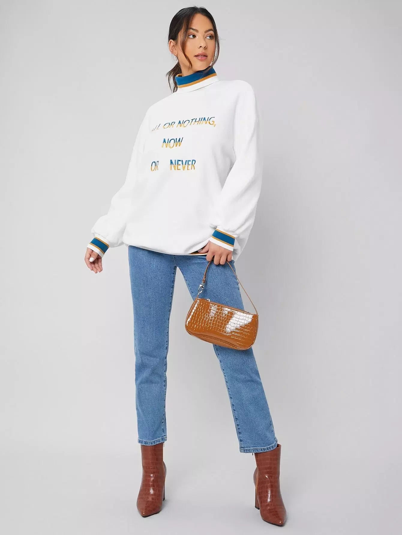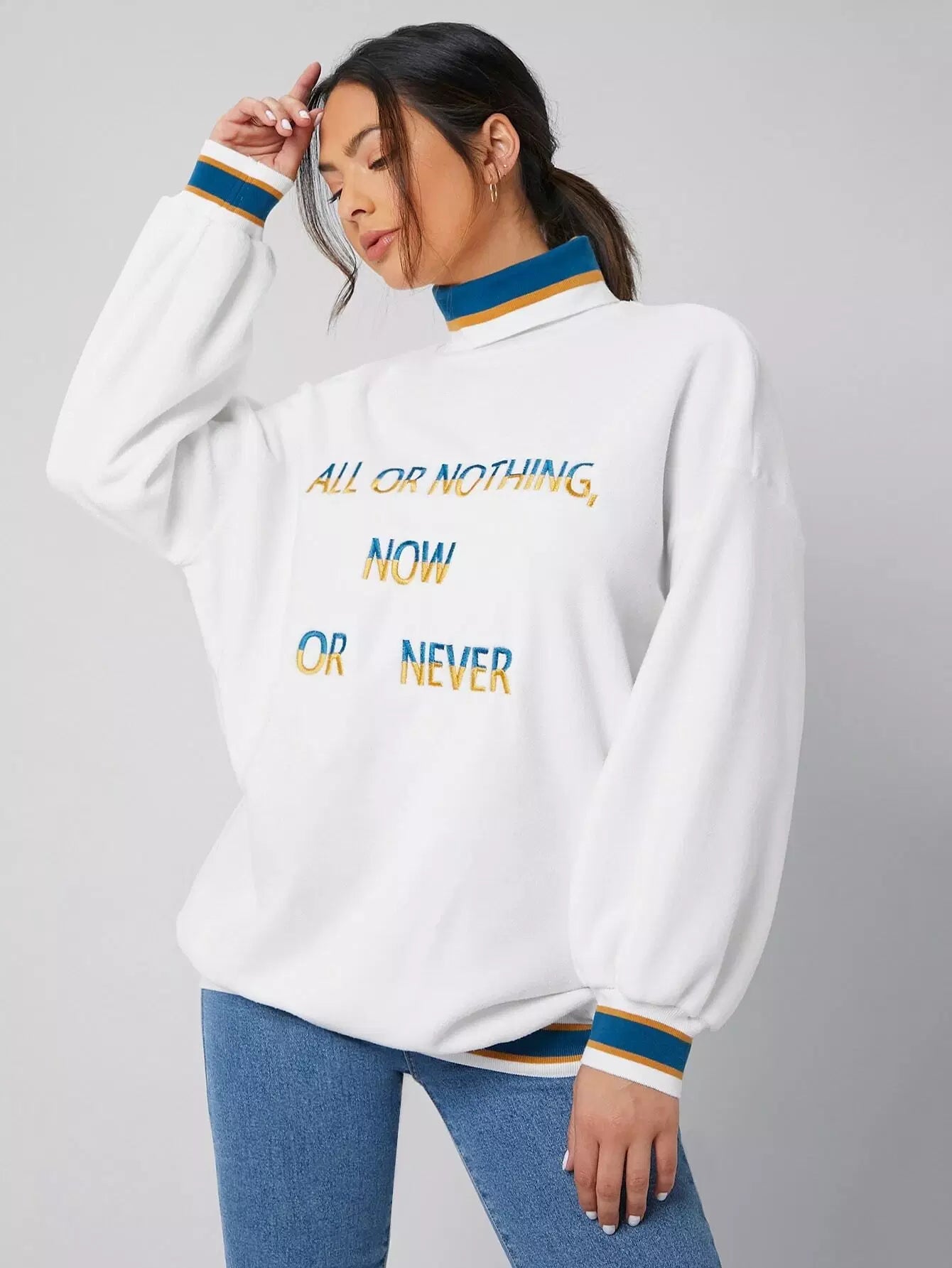 Drop Shoulder High Neck Slogan Embroidery Striped Trim Pullover
