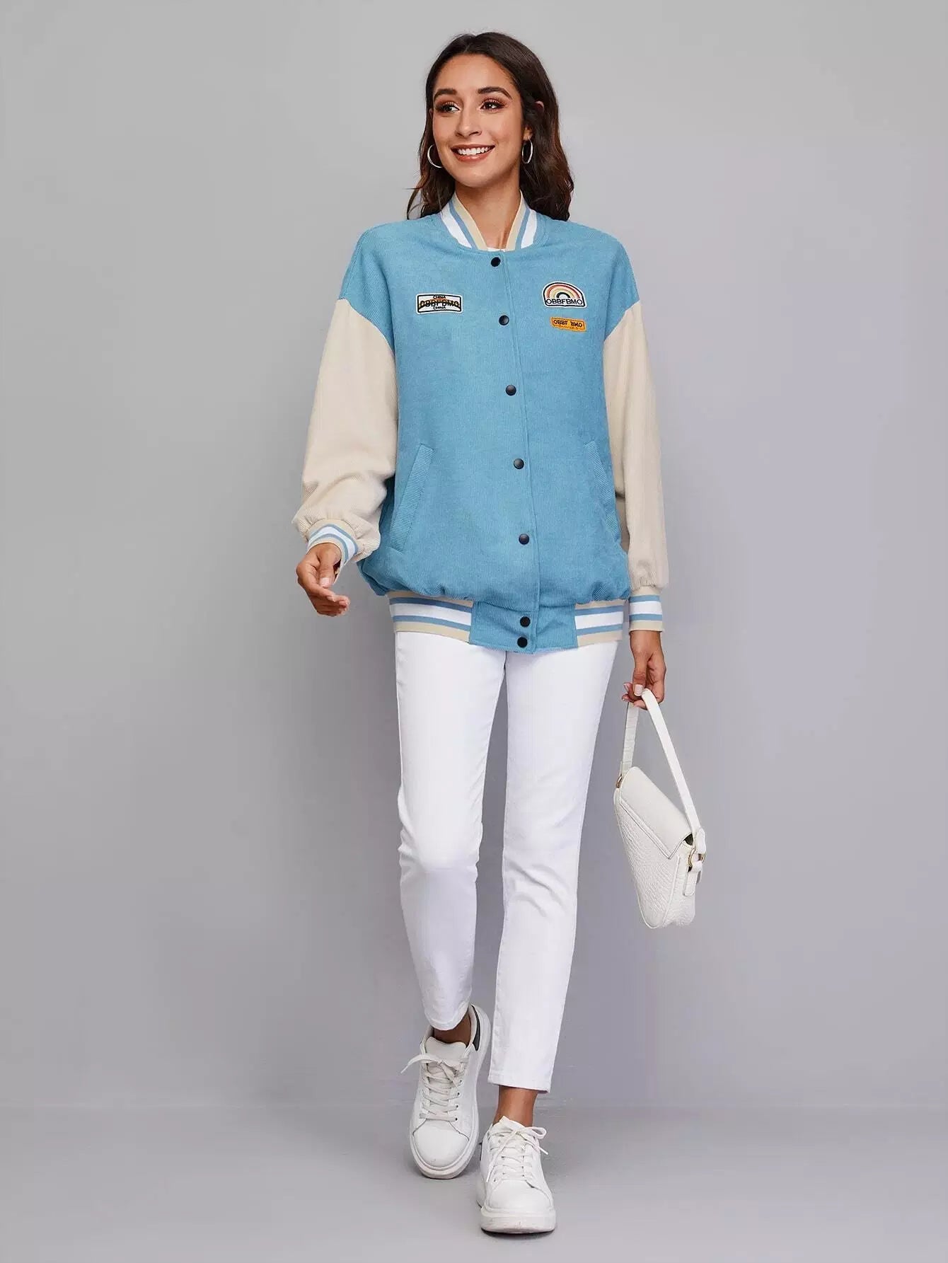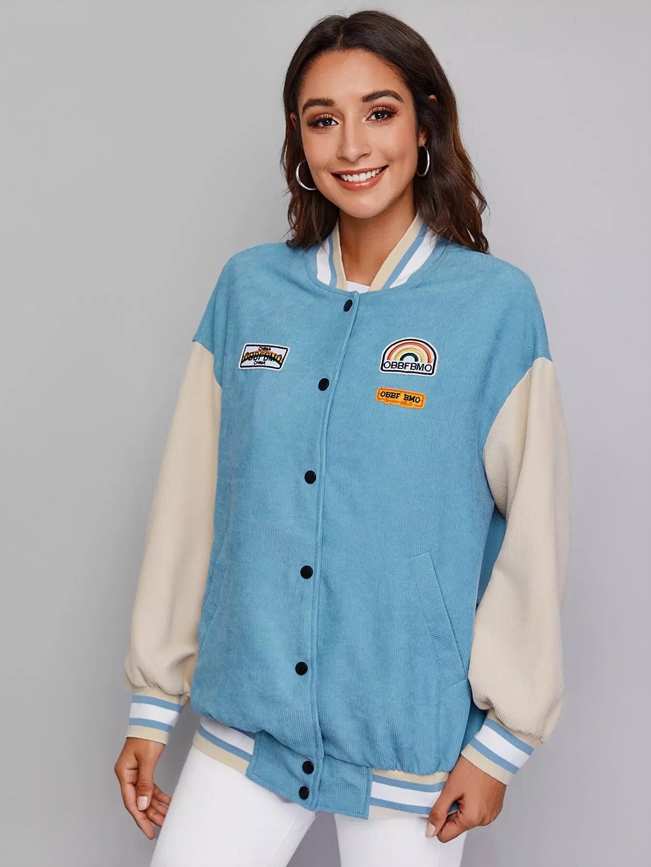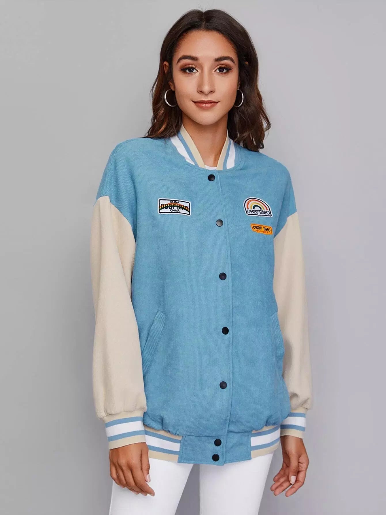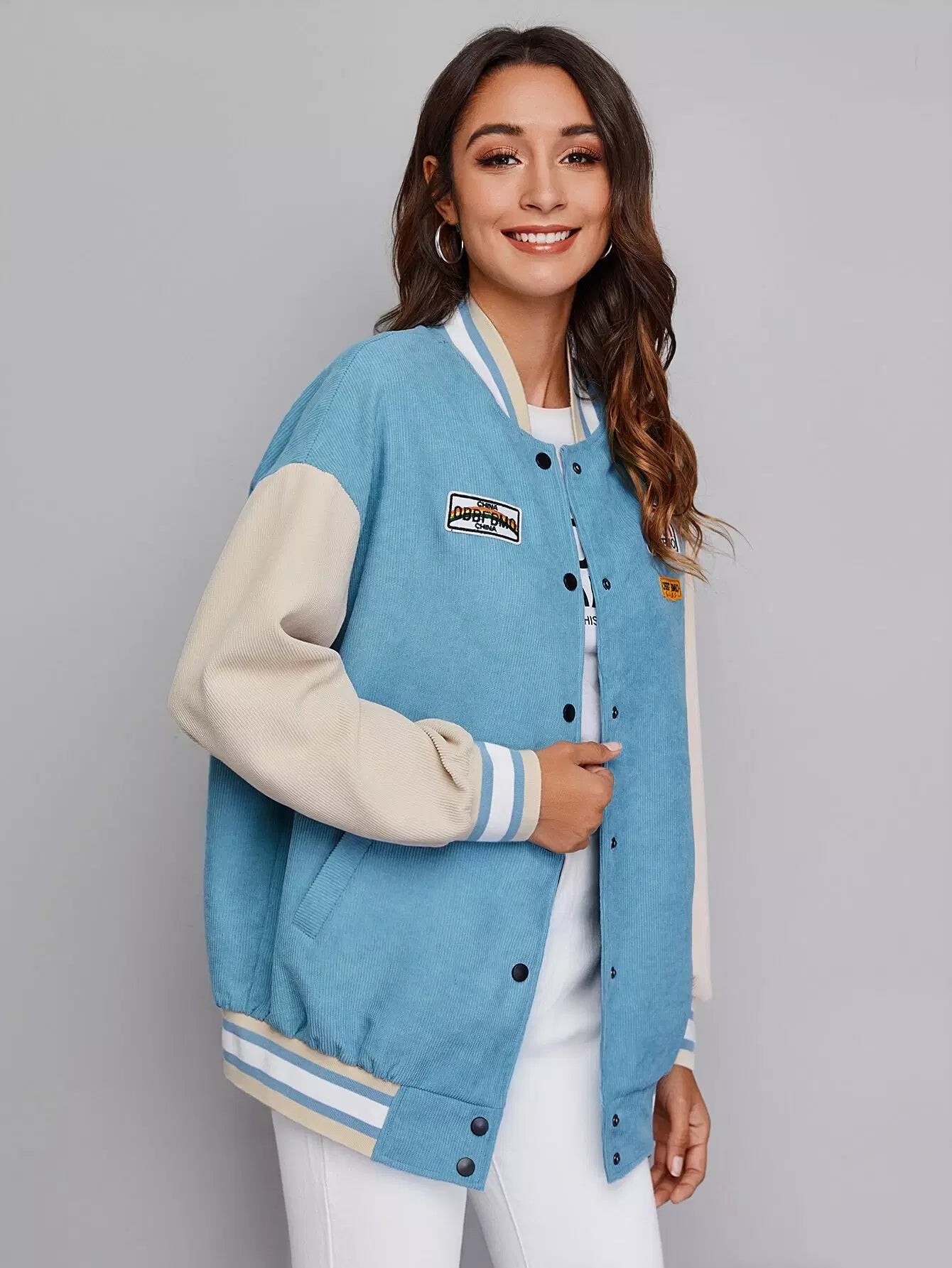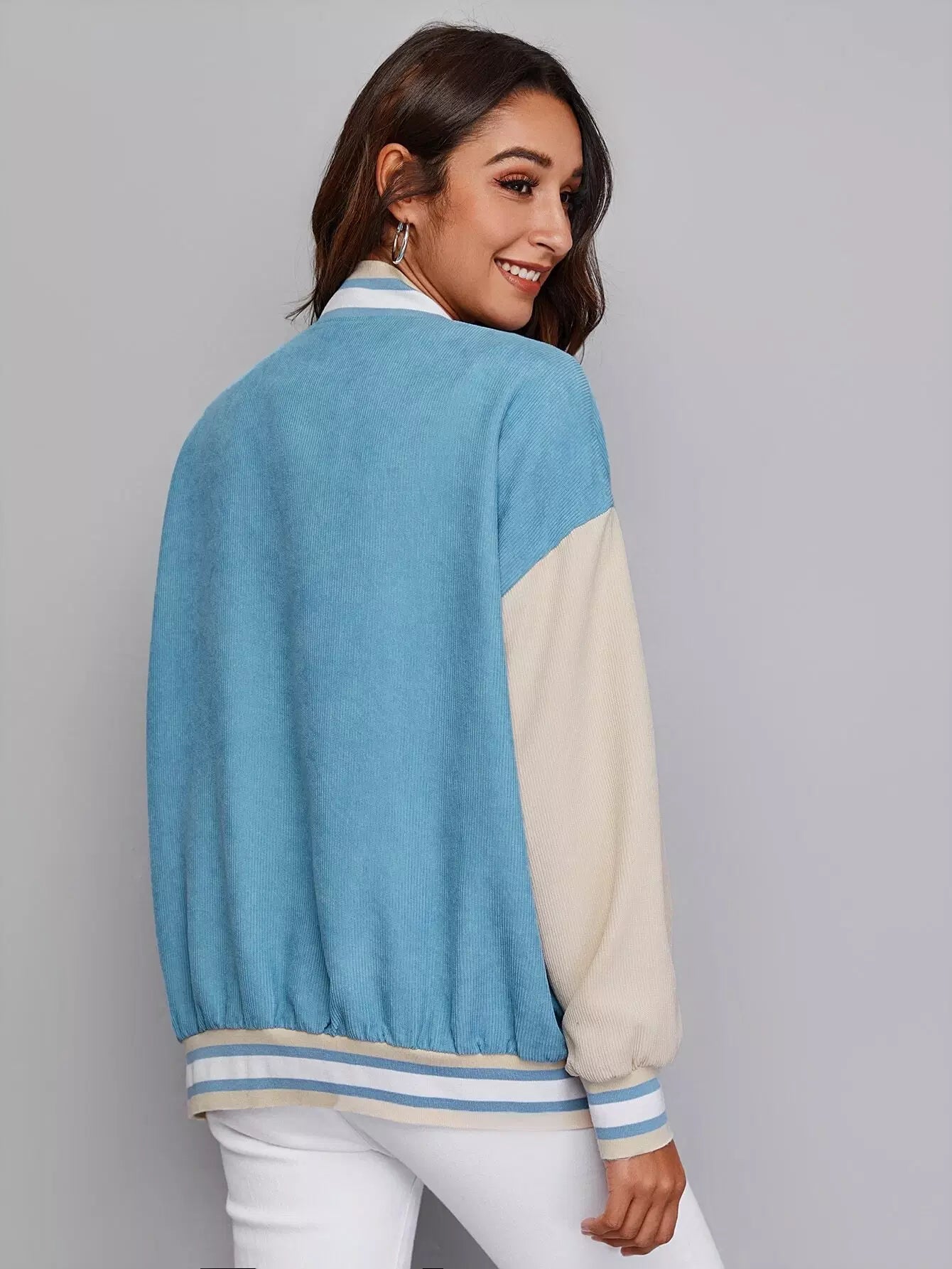 Drop Shoulder Patched Detail Colorblock Striped Trim Cord Varsity Jacket