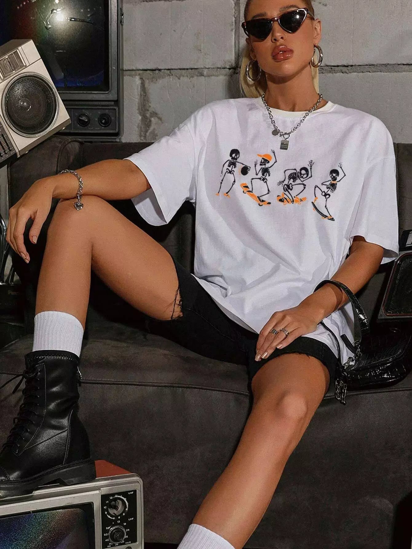 Drop Shoulder Skeleton Print Tee