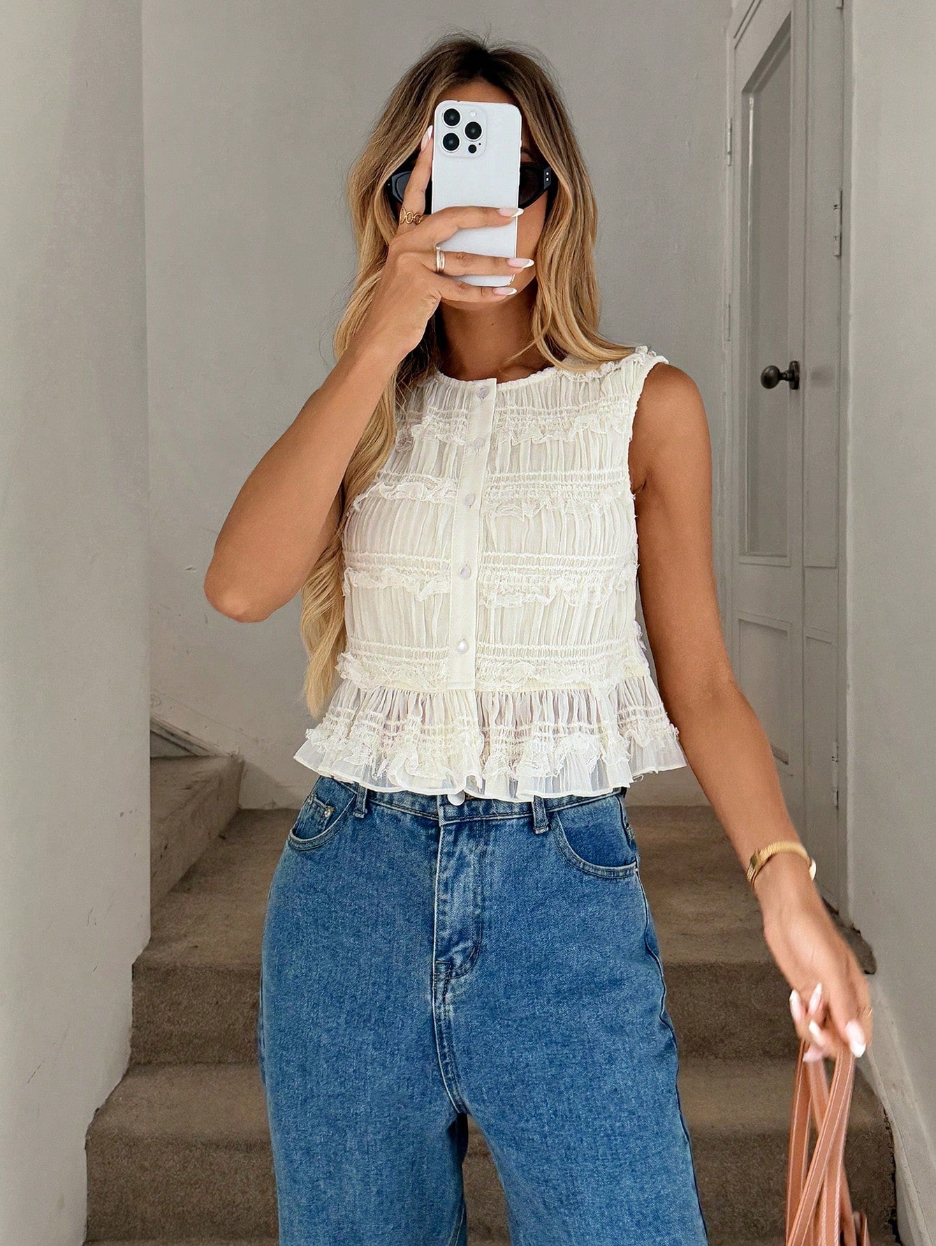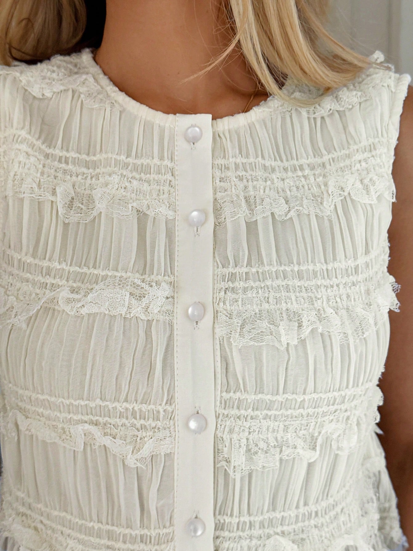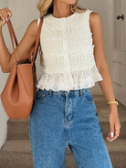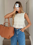 Easowa Round Neck Button Front Pleated Chiffon Textured Fabric Ruffle Hem Sleeveless Casual Vacation Elegant Women Blouse