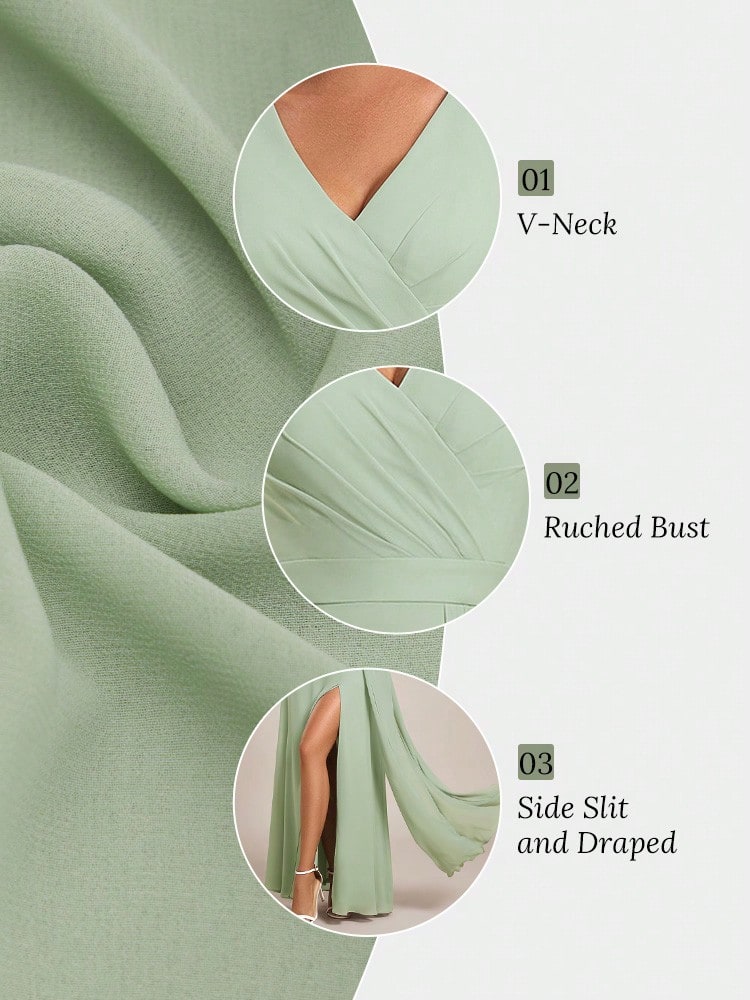 Elegant Solid Color V-Neck Ruched Draped High Slit Maxi Bridesmaid Dress