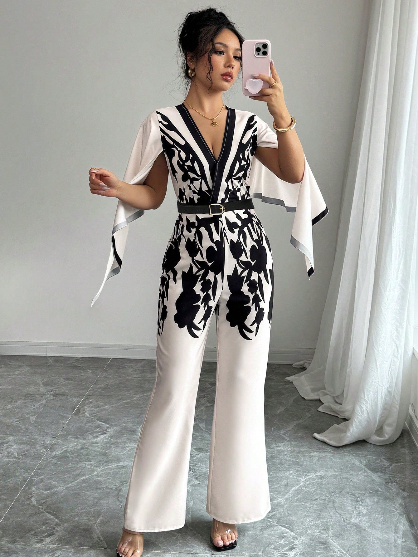 Elenzga Ladies' Elegant V-Neck Asymmetric Sleeve Jumpsuit