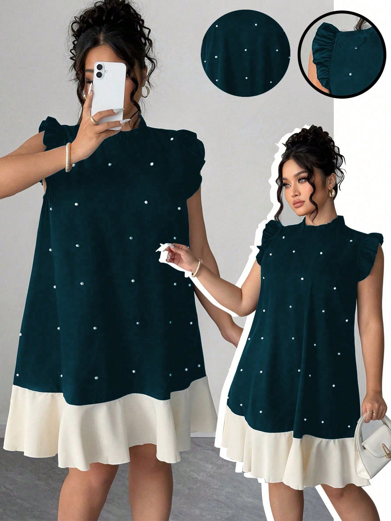 Elenzga Plus Size Fashion Casual Retro Round Neck Ruffle Cap Sleeve Faux Pearl Patchwork Dress Women