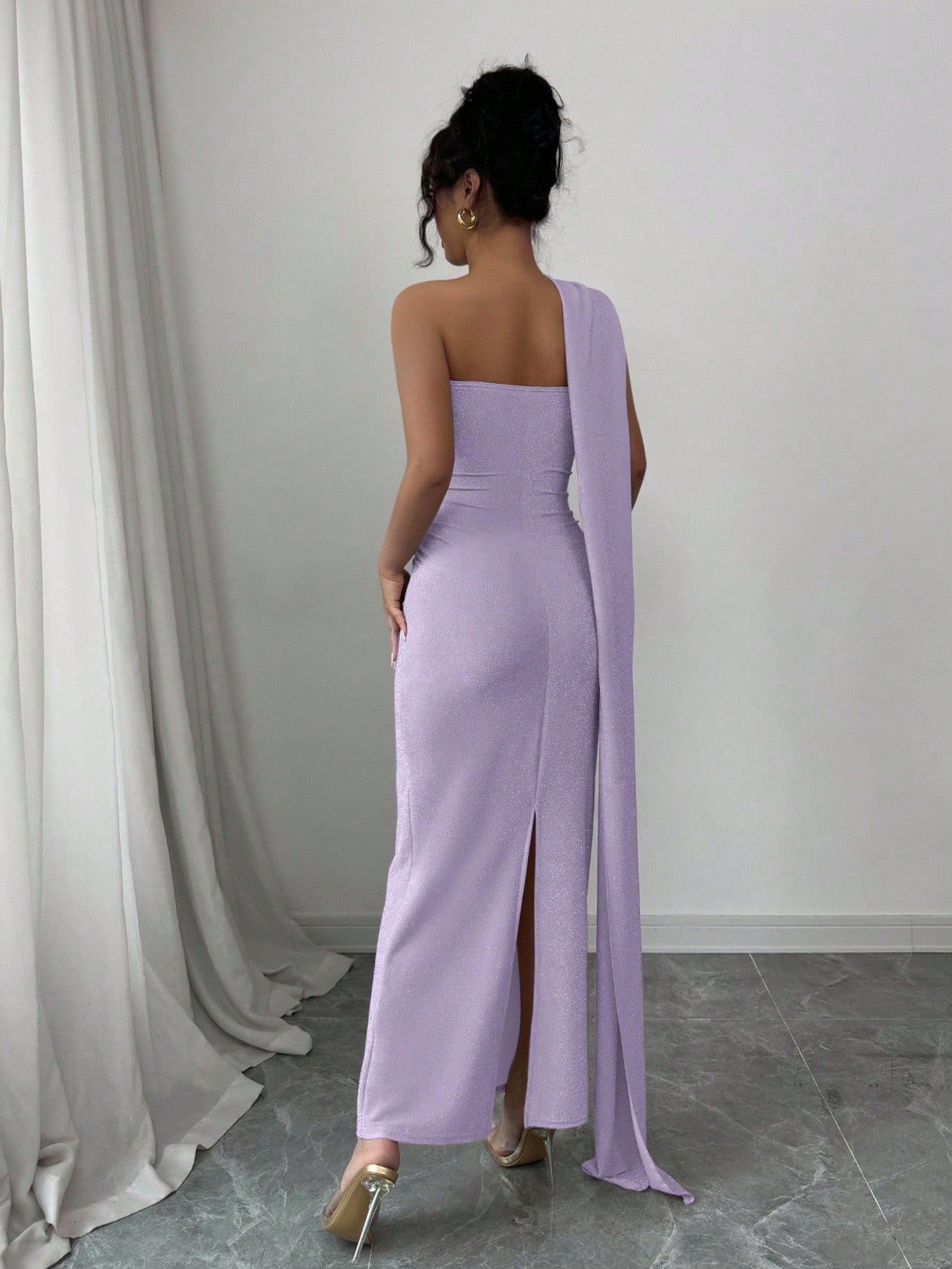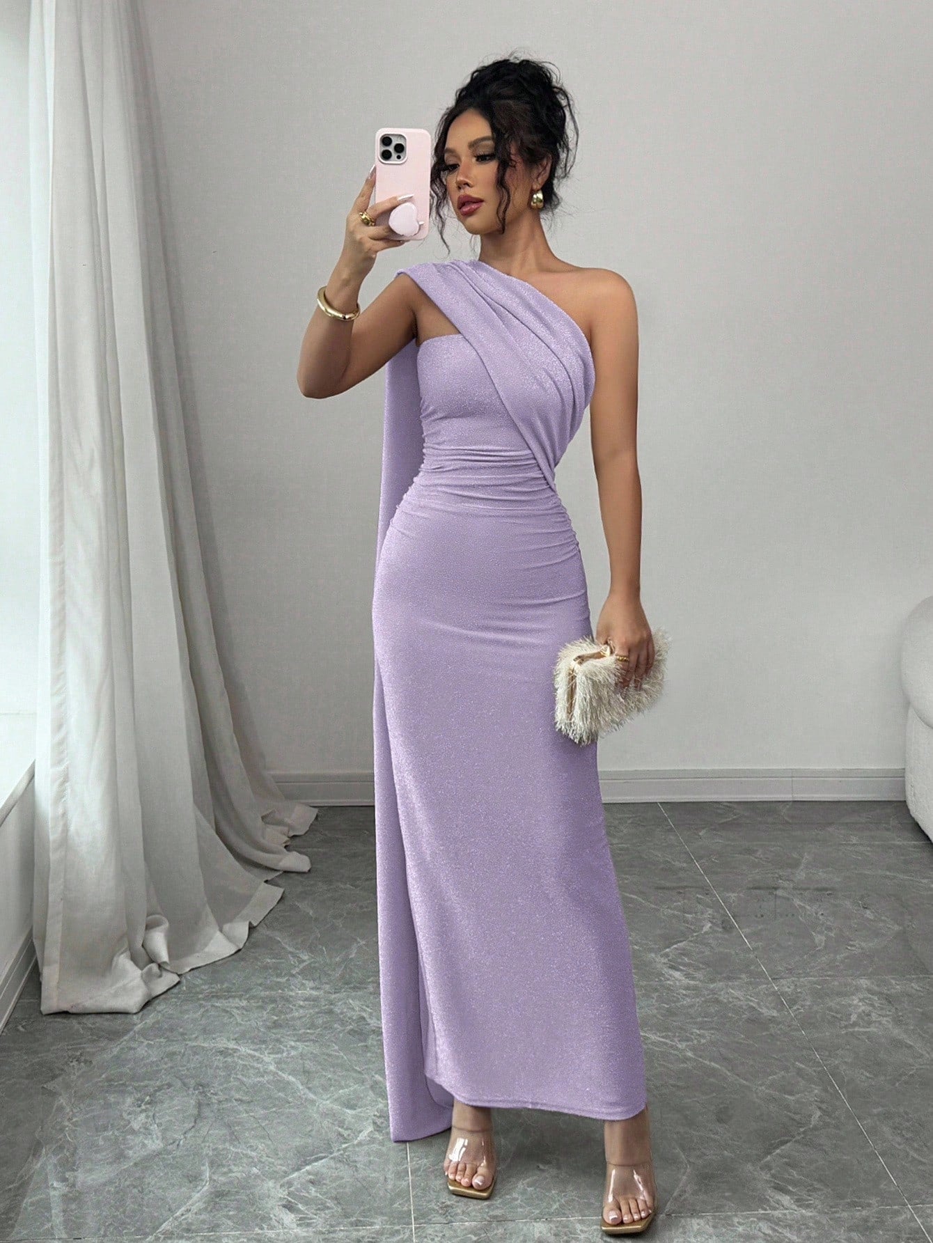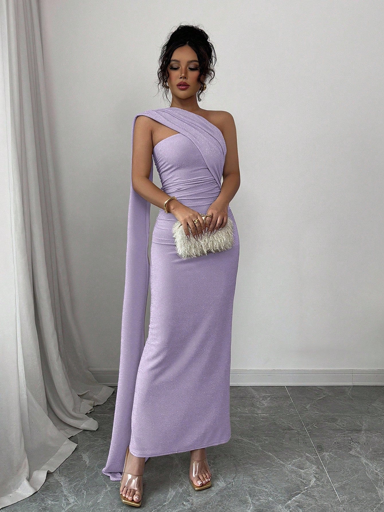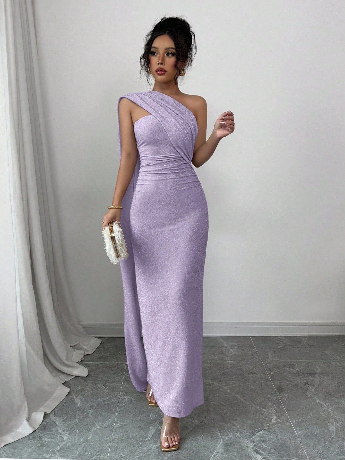 Elenzga Women's New Apricot Color European And American Fashion Elegant Party Lightweight High-End Oblique Shoulder Shawl Sexy Pleated Waist Fitted Bodycon Dress With Back Slit