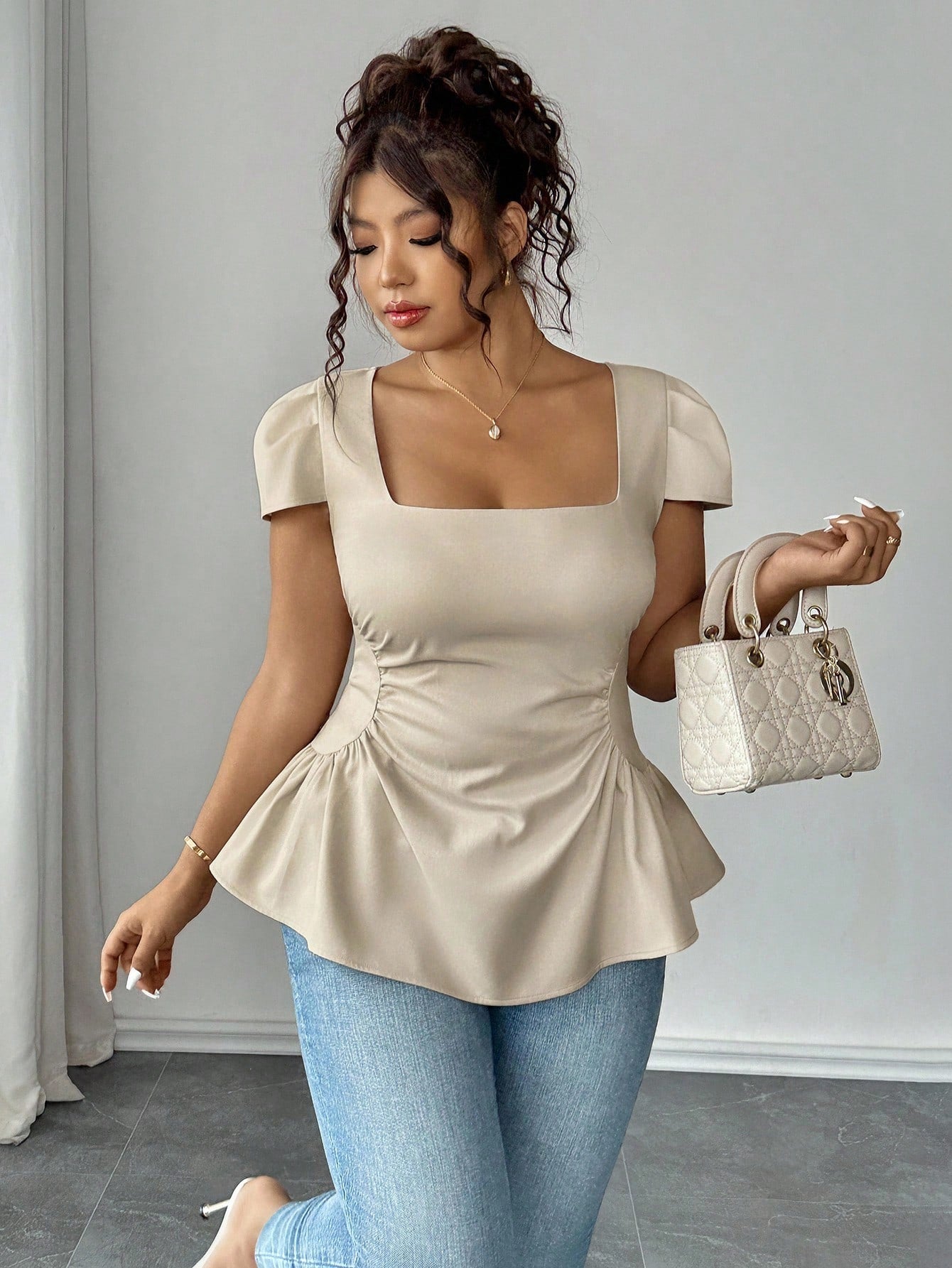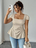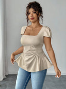 Elenzga Women's Plus Size Square Neck Waisted A-Line Short Sleeve Blouse