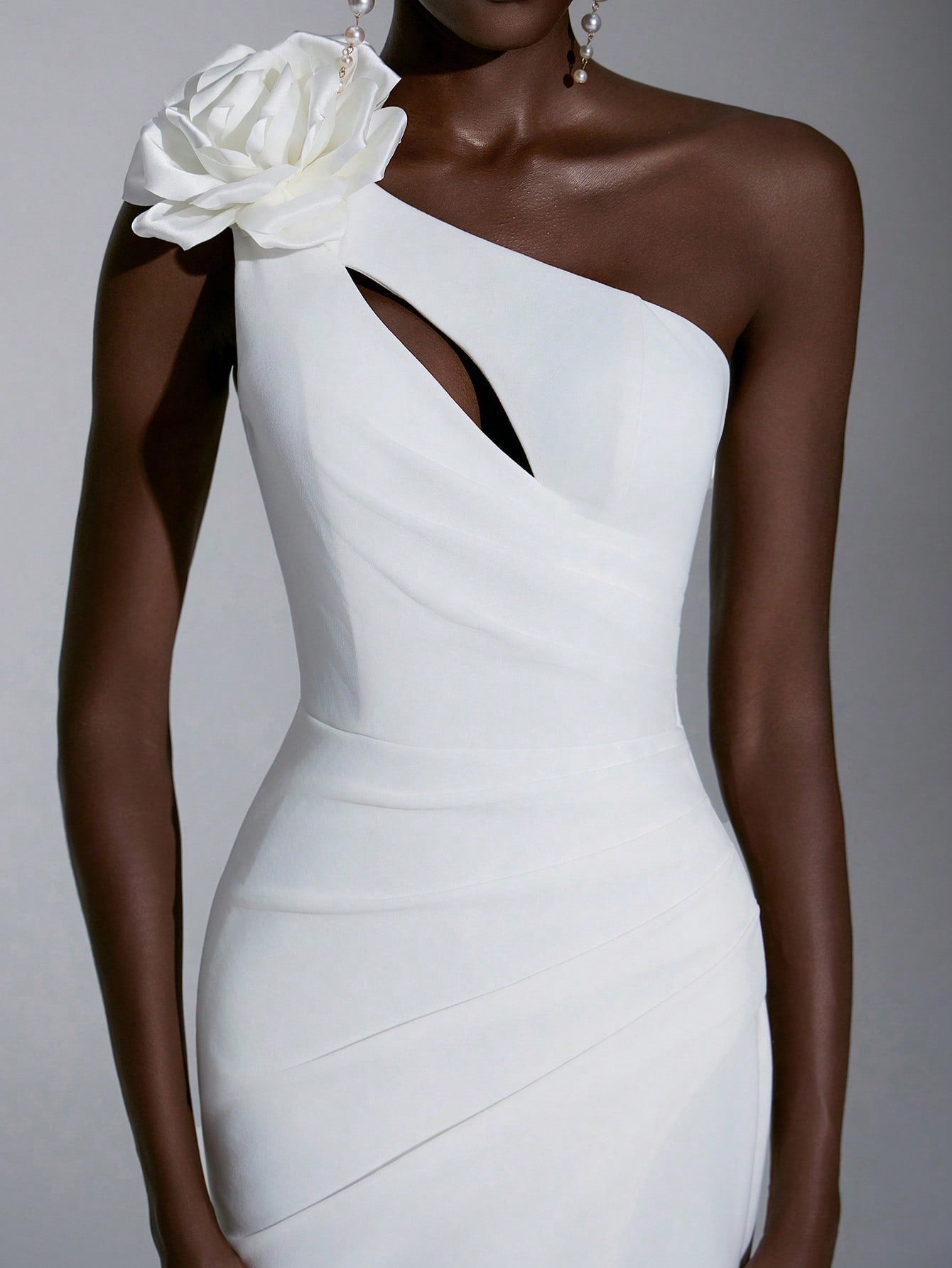 Elitara Elegant Glamorous Stretchy Knitted Asymmetric Shoulder Detachable 3D Floral Front Ruched Waist Fishtail High Slit Extra Long Bridal Train Dress Suitable For Wedding