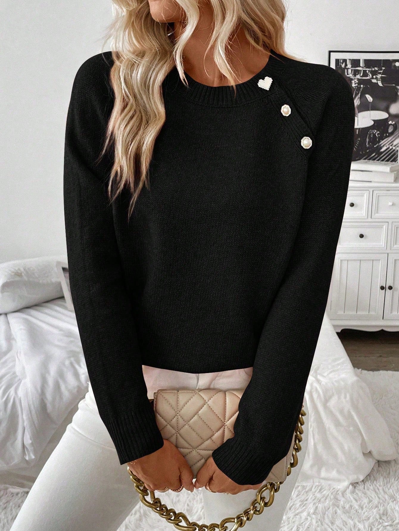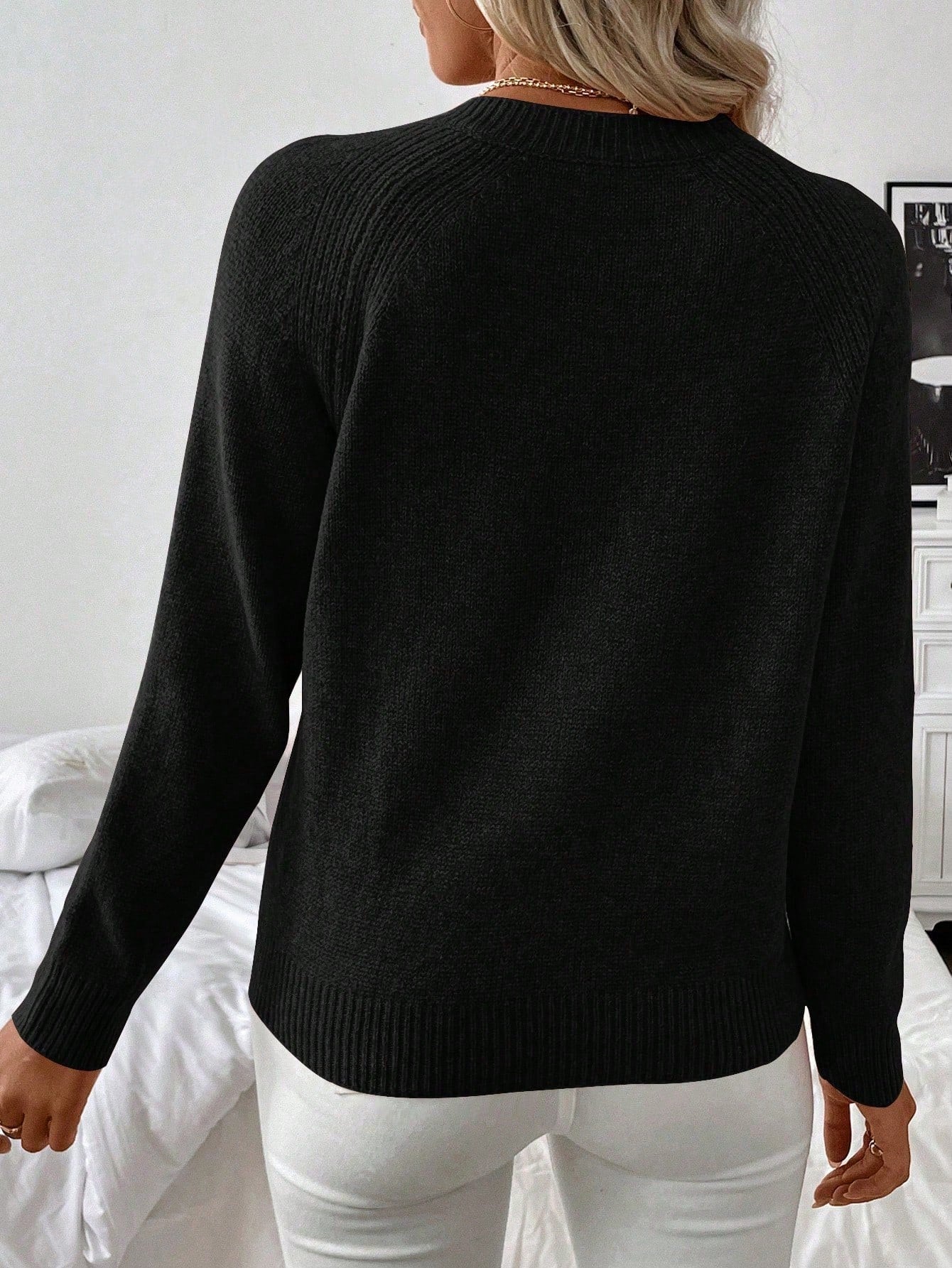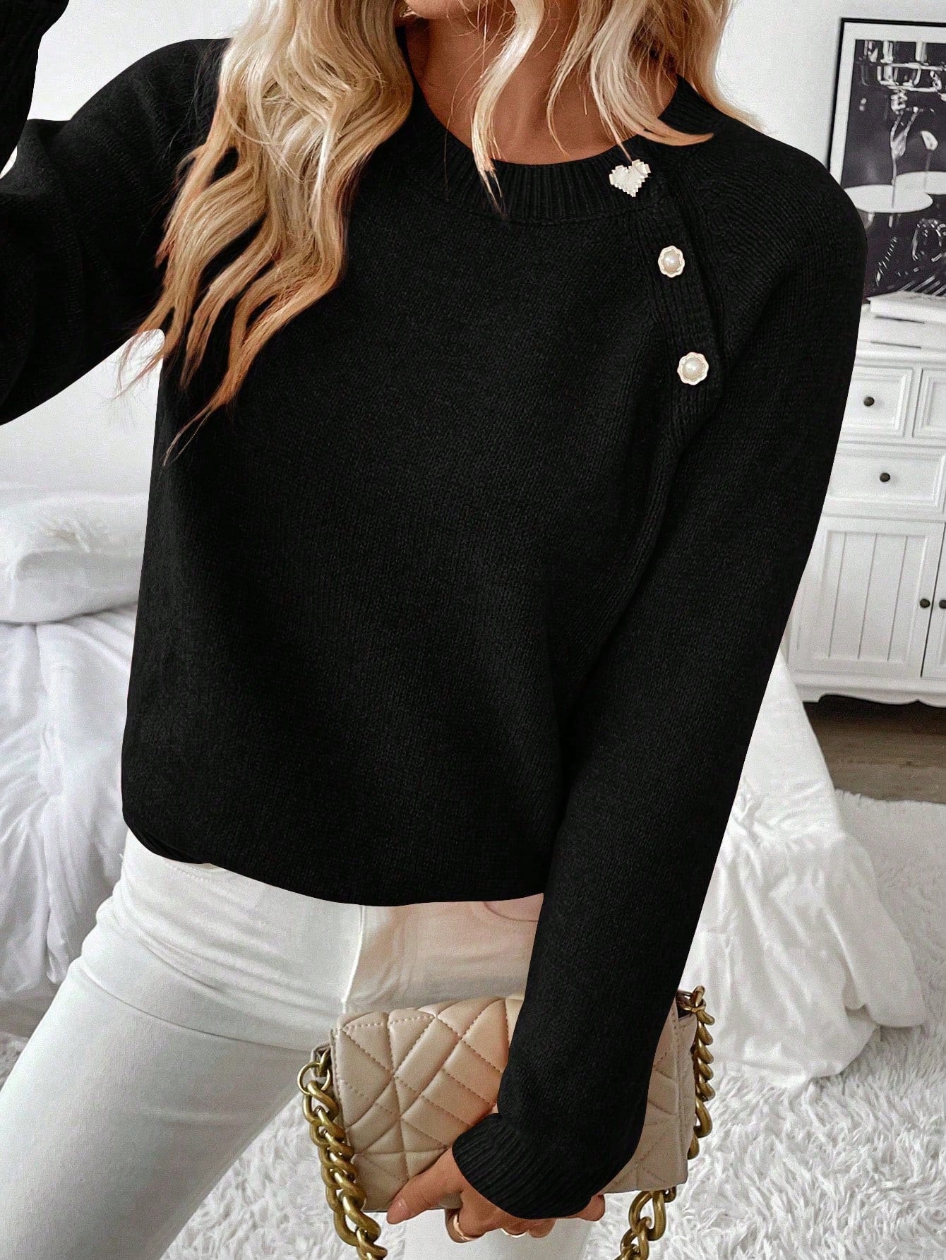 EMERY ROSE 1pc Women Oblique Placket Button Solid Color Casual Long Sleeve Sweater