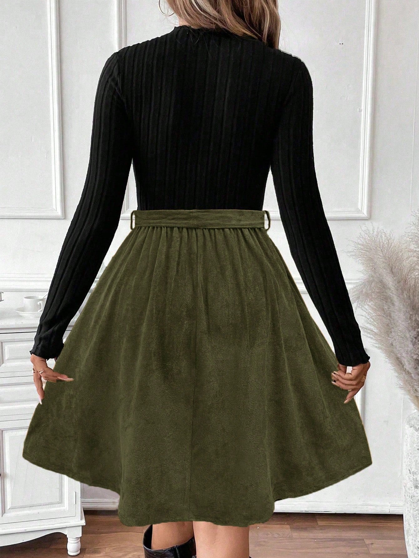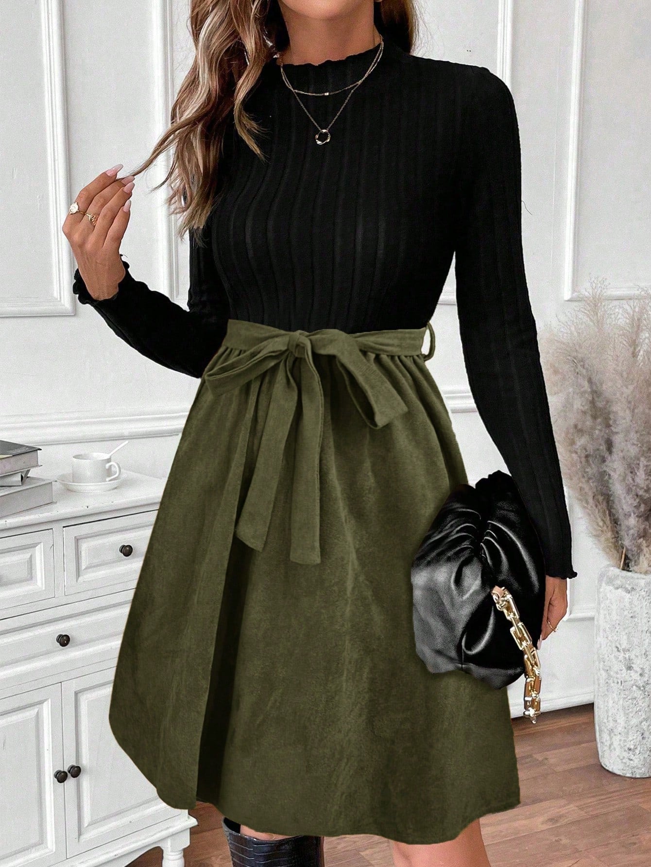 EMERY ROSE Women's Elegant Casual Knitted Patchwork Leopard Print Long Sleeve Dress Fall Cloth For Women