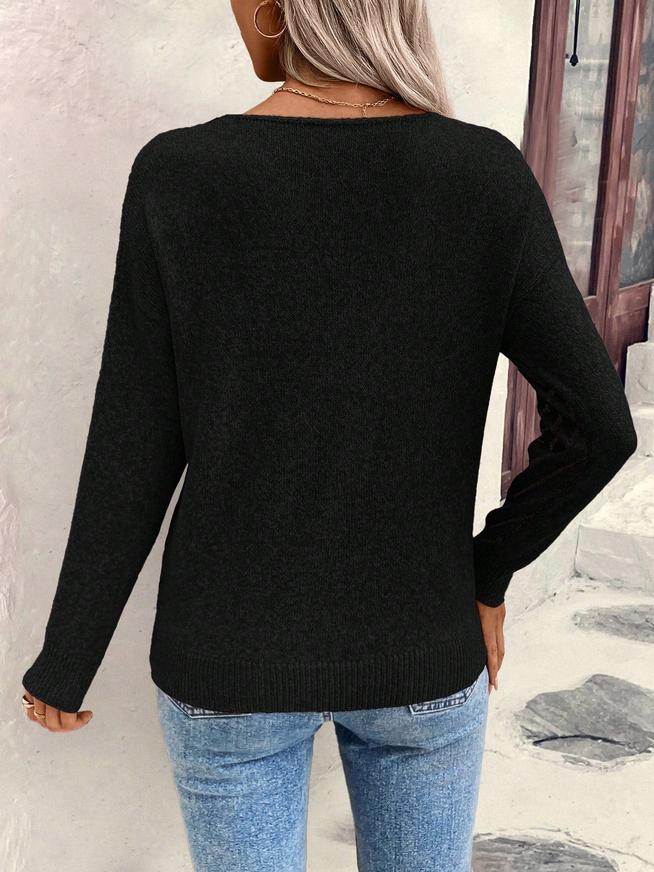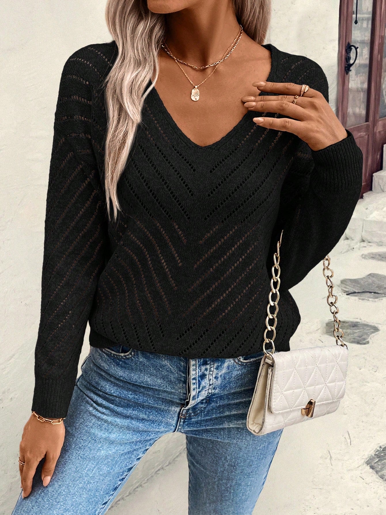 EMERY ROSE Women's Loose Casual Hollow Geometric Textured V-Neck Sweater