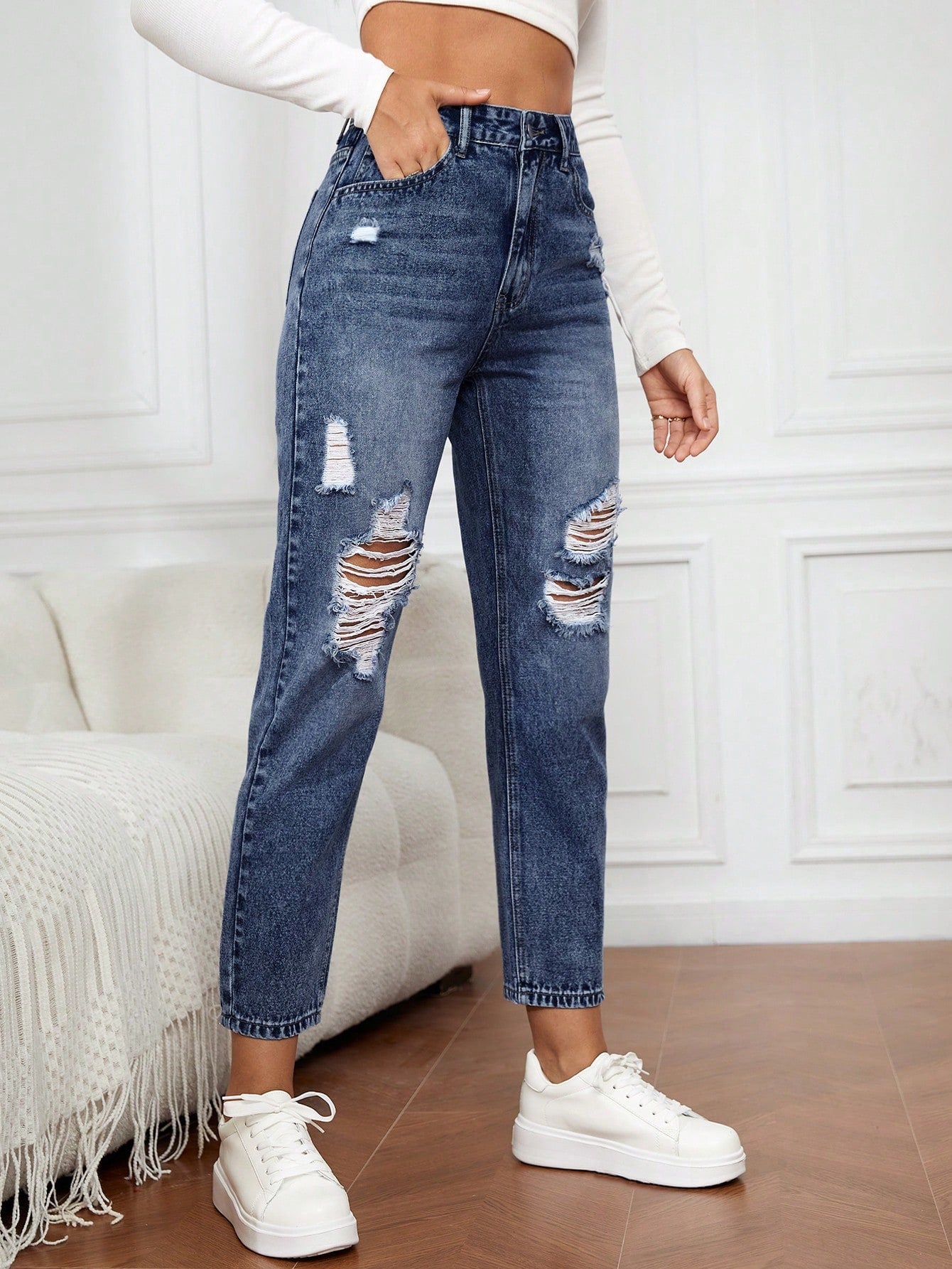 EMERY ROSE Women's Pocketed Distressed Tapered Casual Versatile Denim Jeans Women Jeans High Waisted