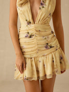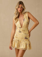 Enchnt X Gi Lancellotti Spring/Summer Romantic Women's Deep V-Neck Sleeveless Yellow Floral Print Waisted Summer Elegant Mini Dress