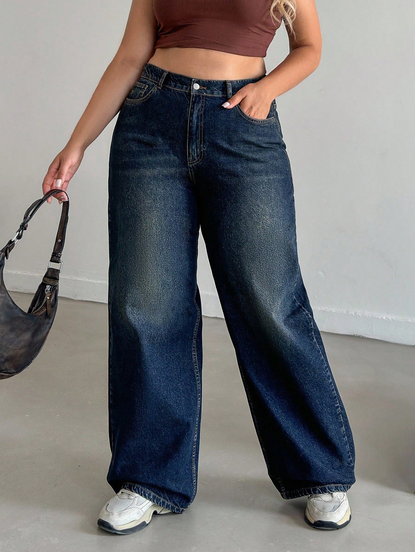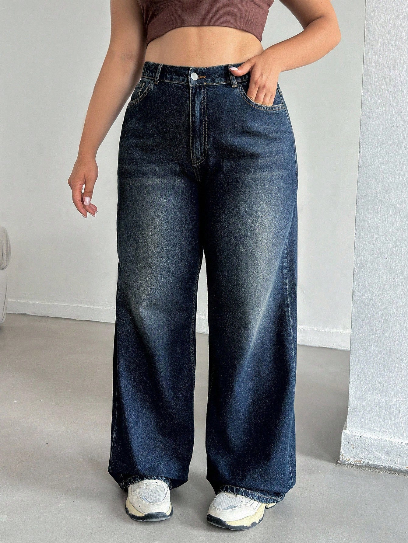 EURMUSE Plus Size Women's High-Waisted Wide-Leg Jeans With Washed And Retro Style