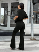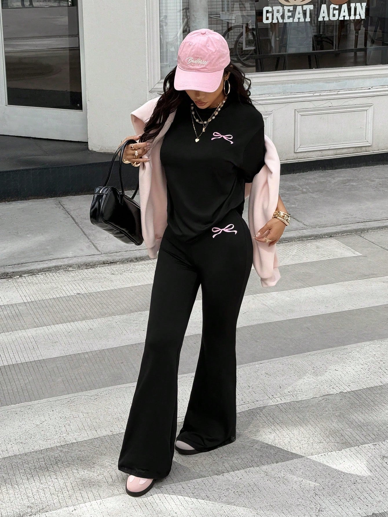 EZwear 2pcs Women Summer Casual Bow Decor Printed Short Sleeve T-Shirt And Flared Pants Set Women