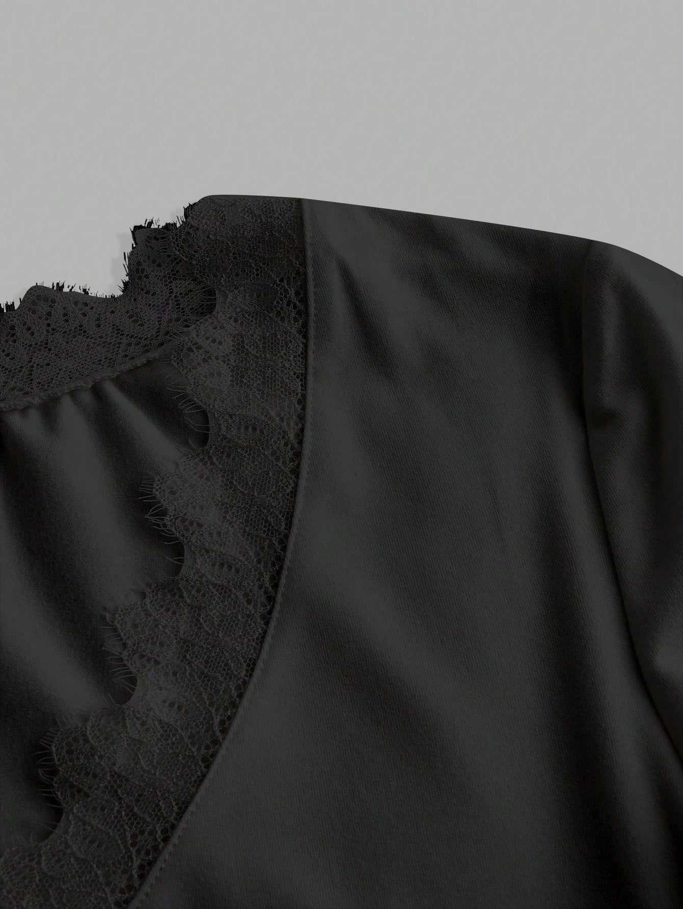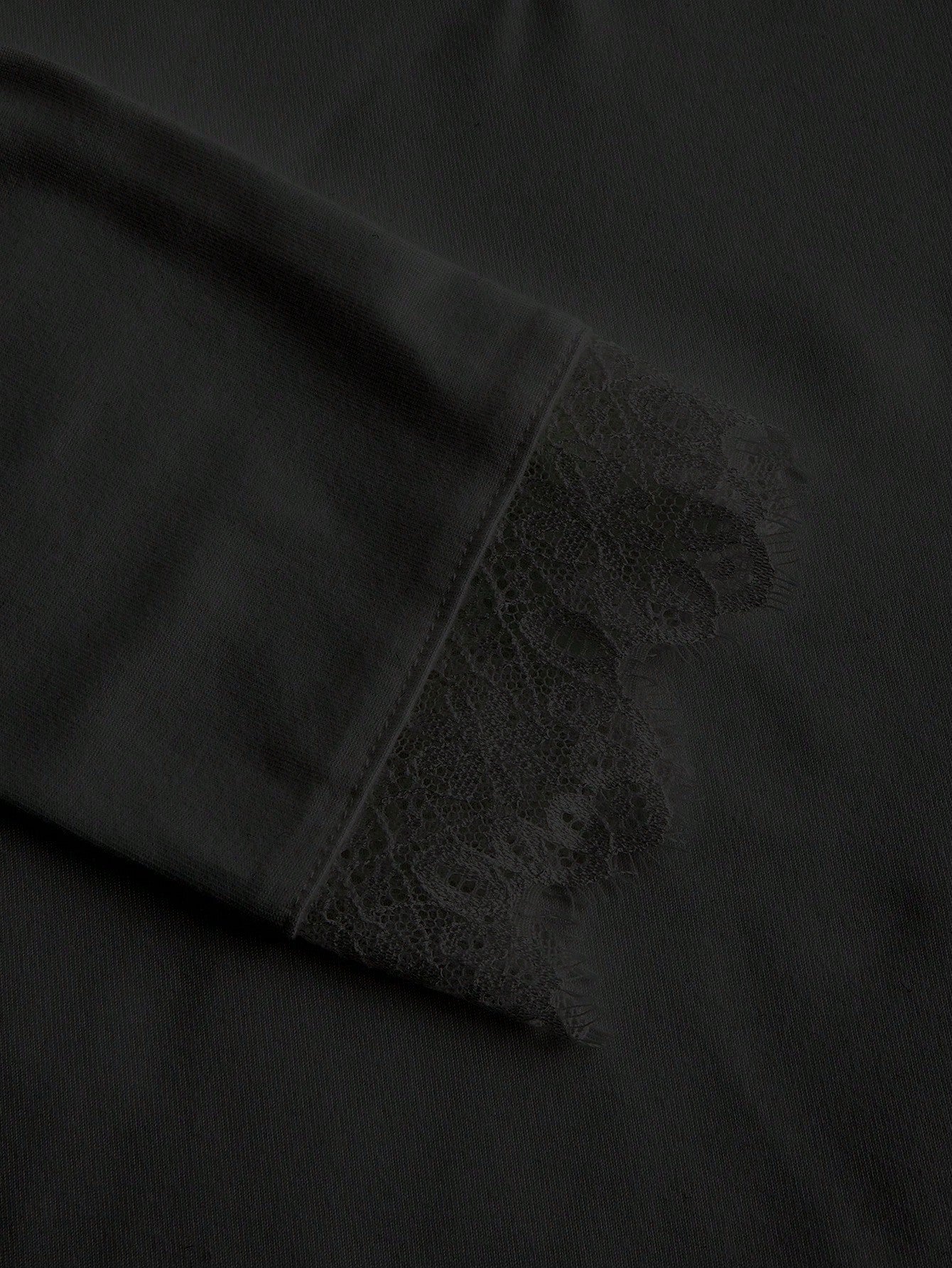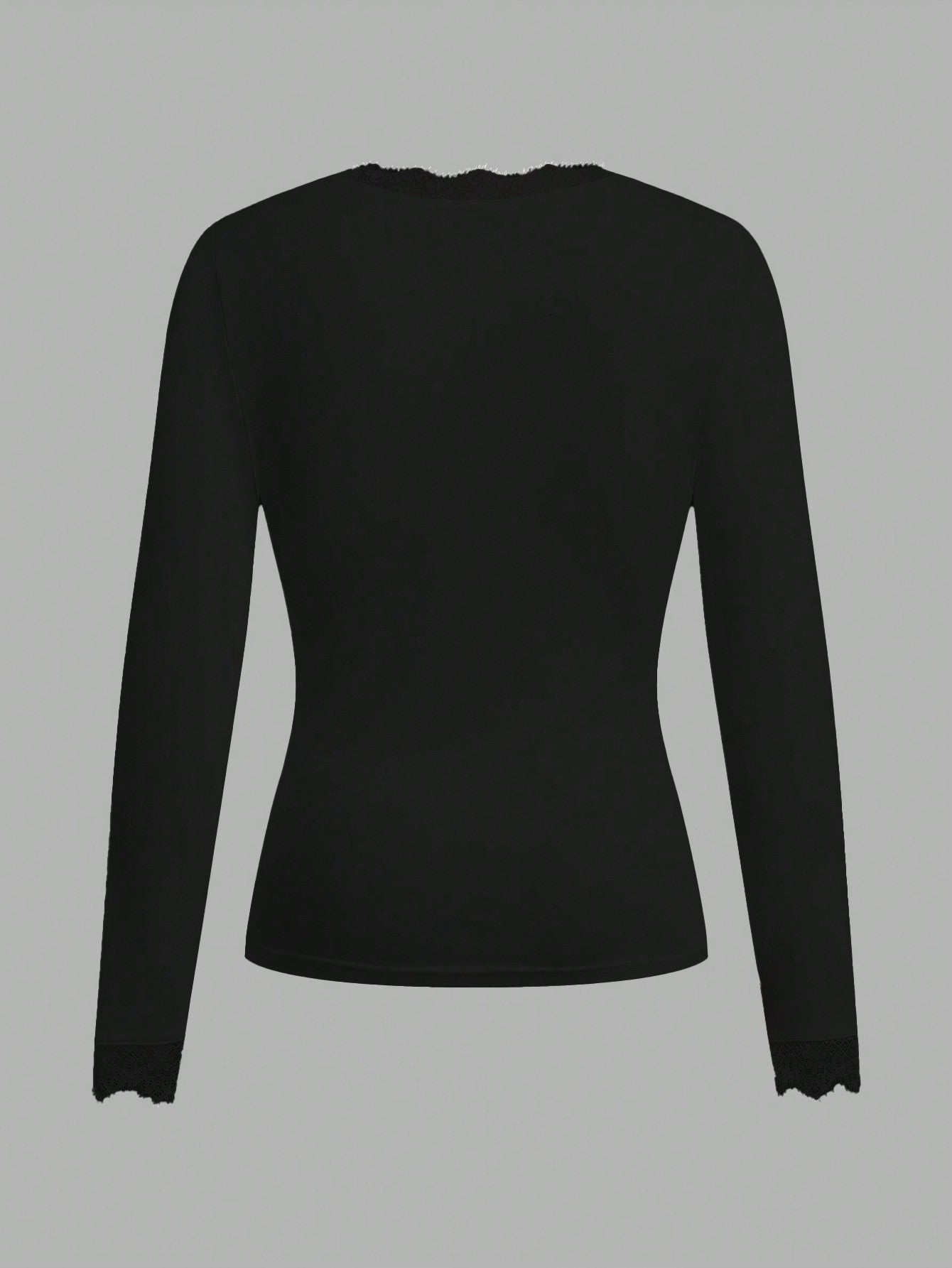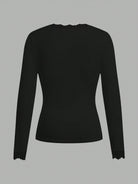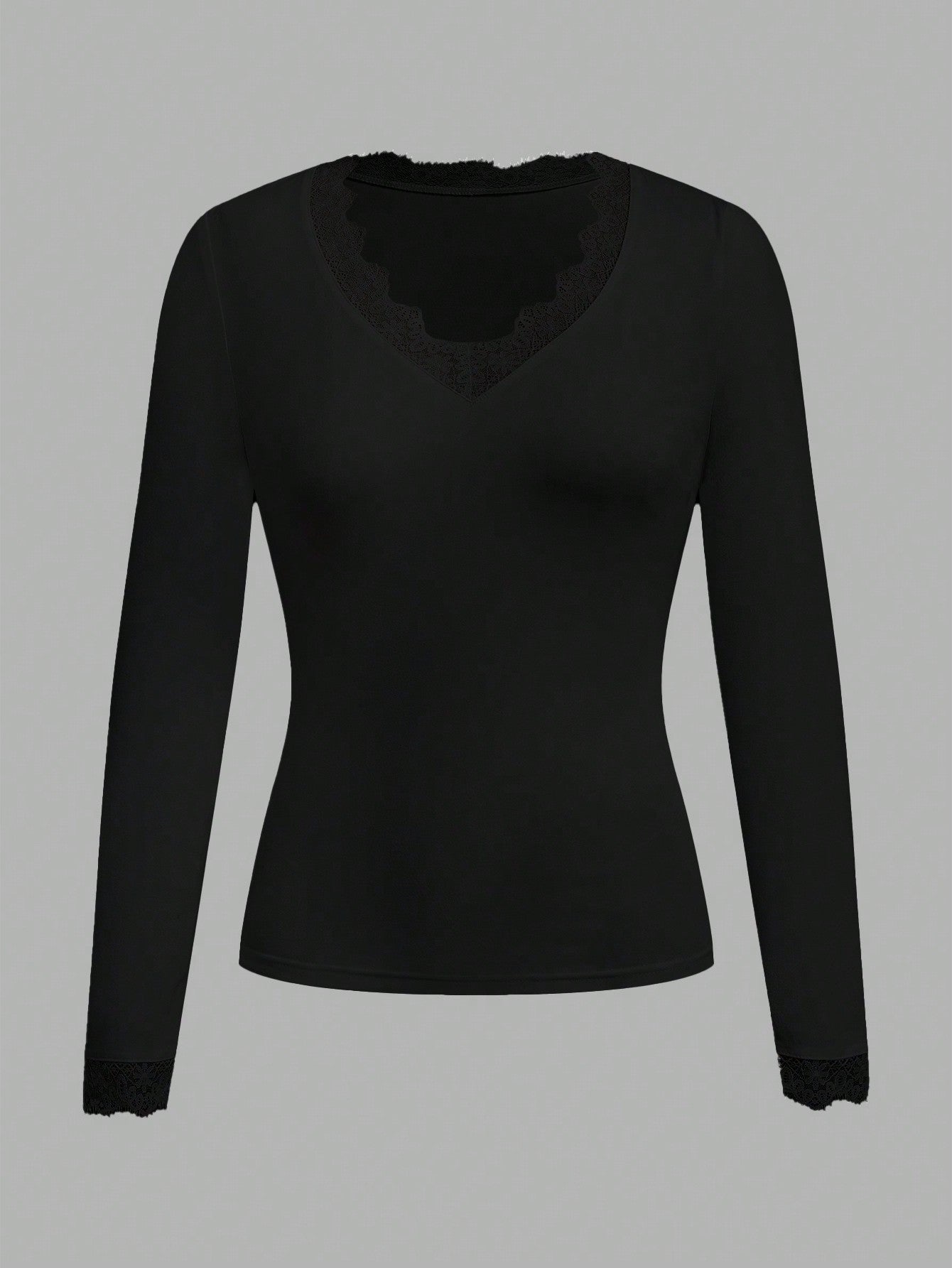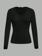 EZwear Casual Black Deep V-Neck Lace Trim Fitted Long Sleeve T-Shirt