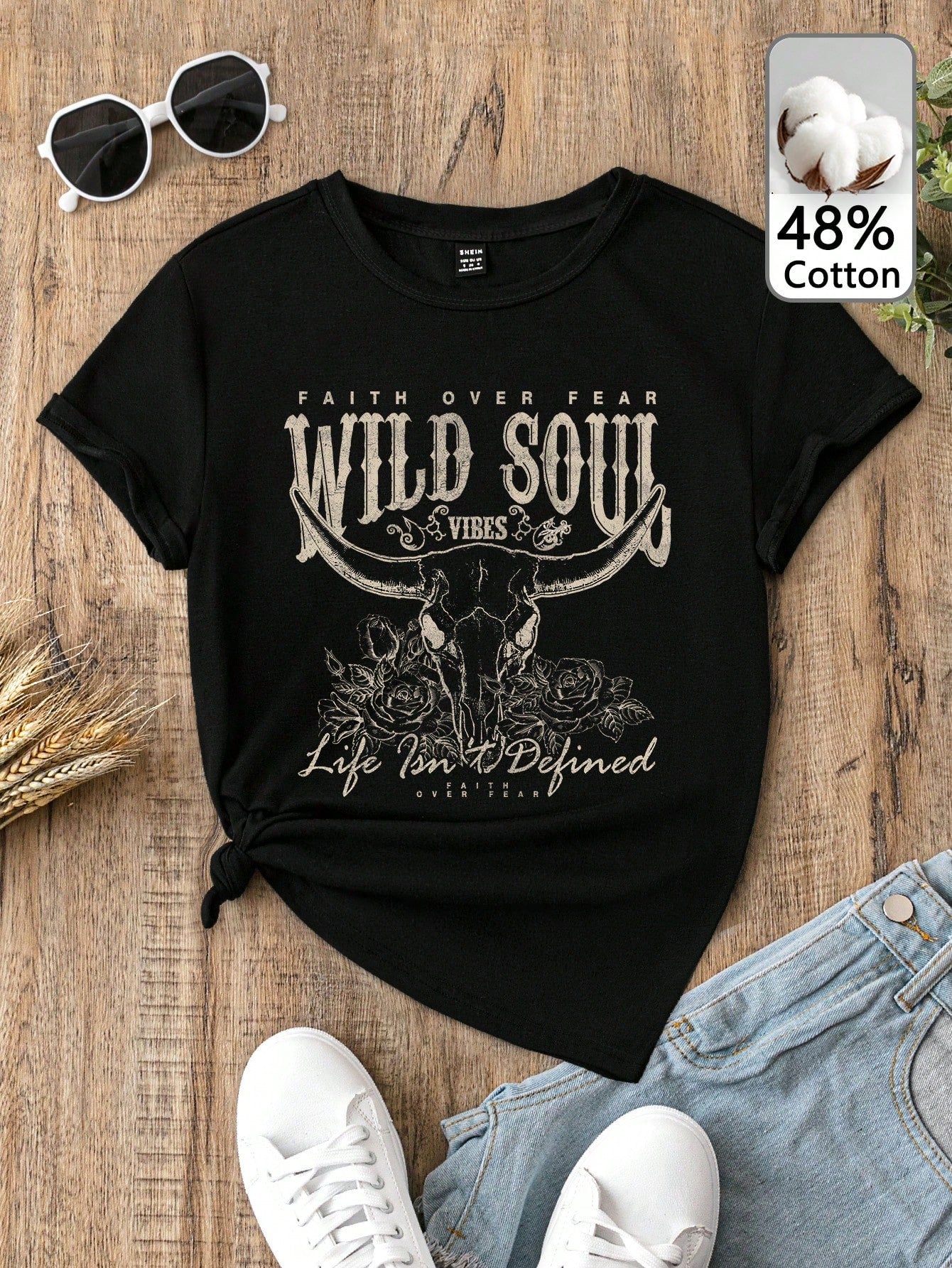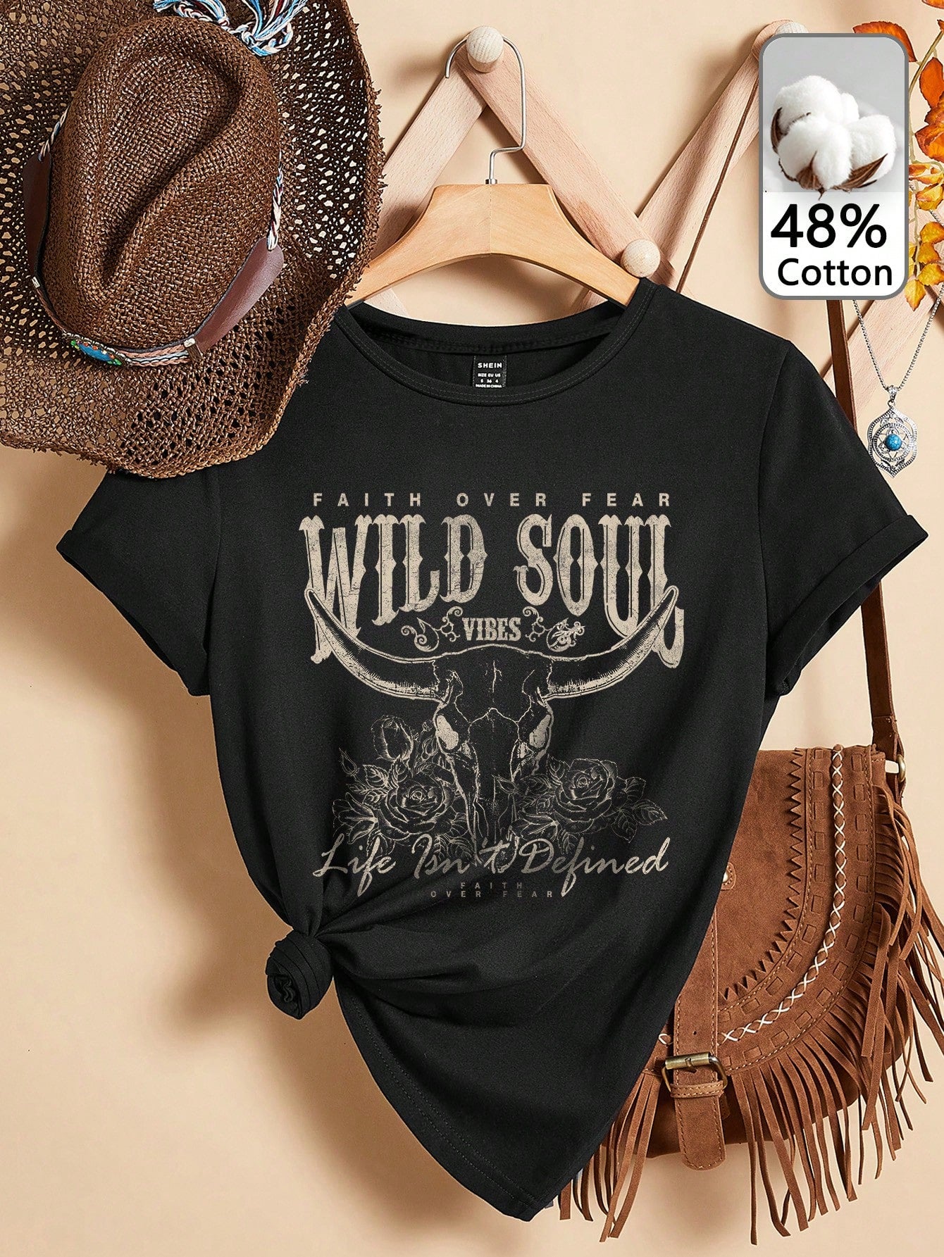 EZwear Casual Vintage Western Cowgirl "Wild Soul" Floral Graphic T-Shirt For Women