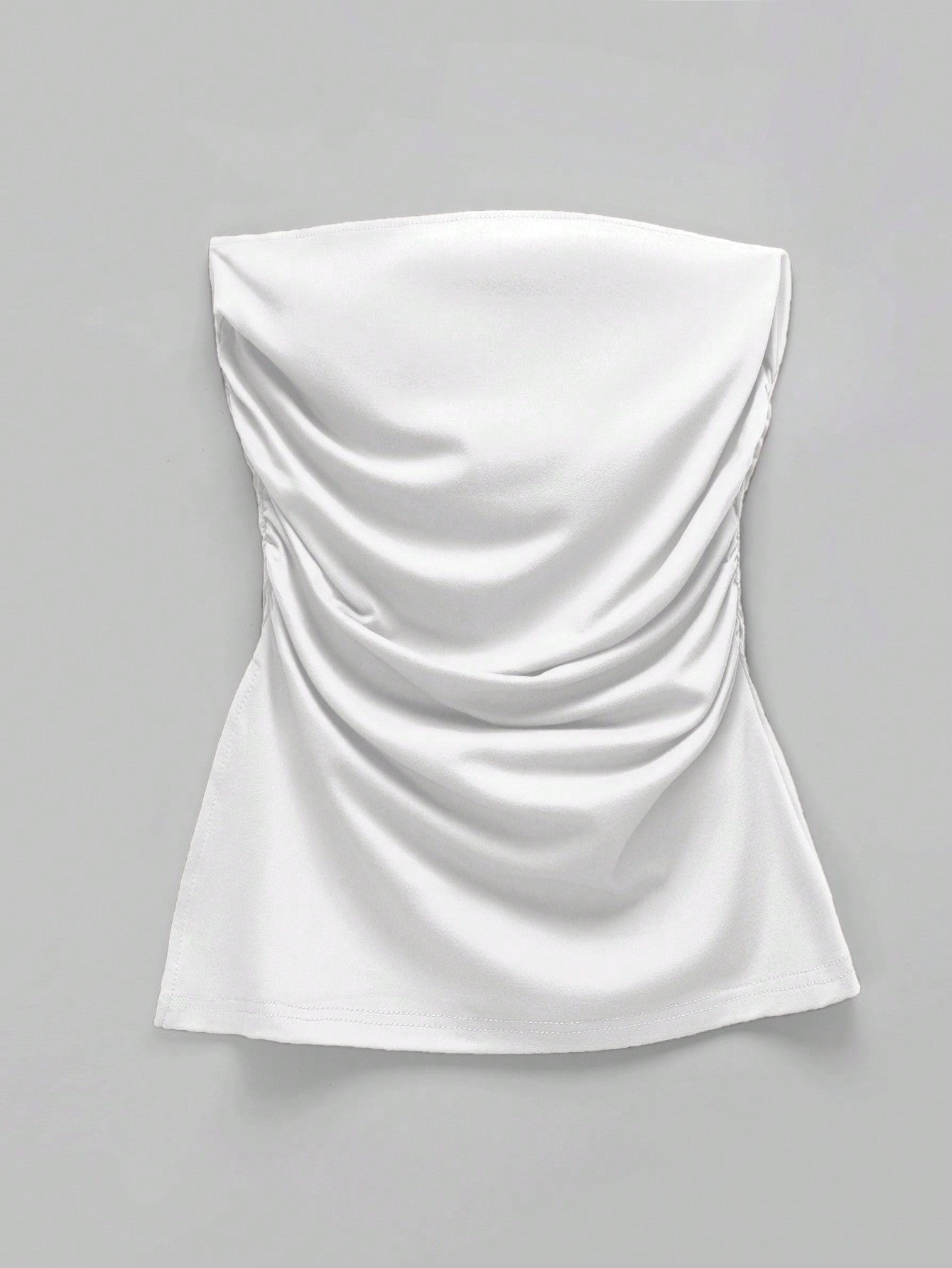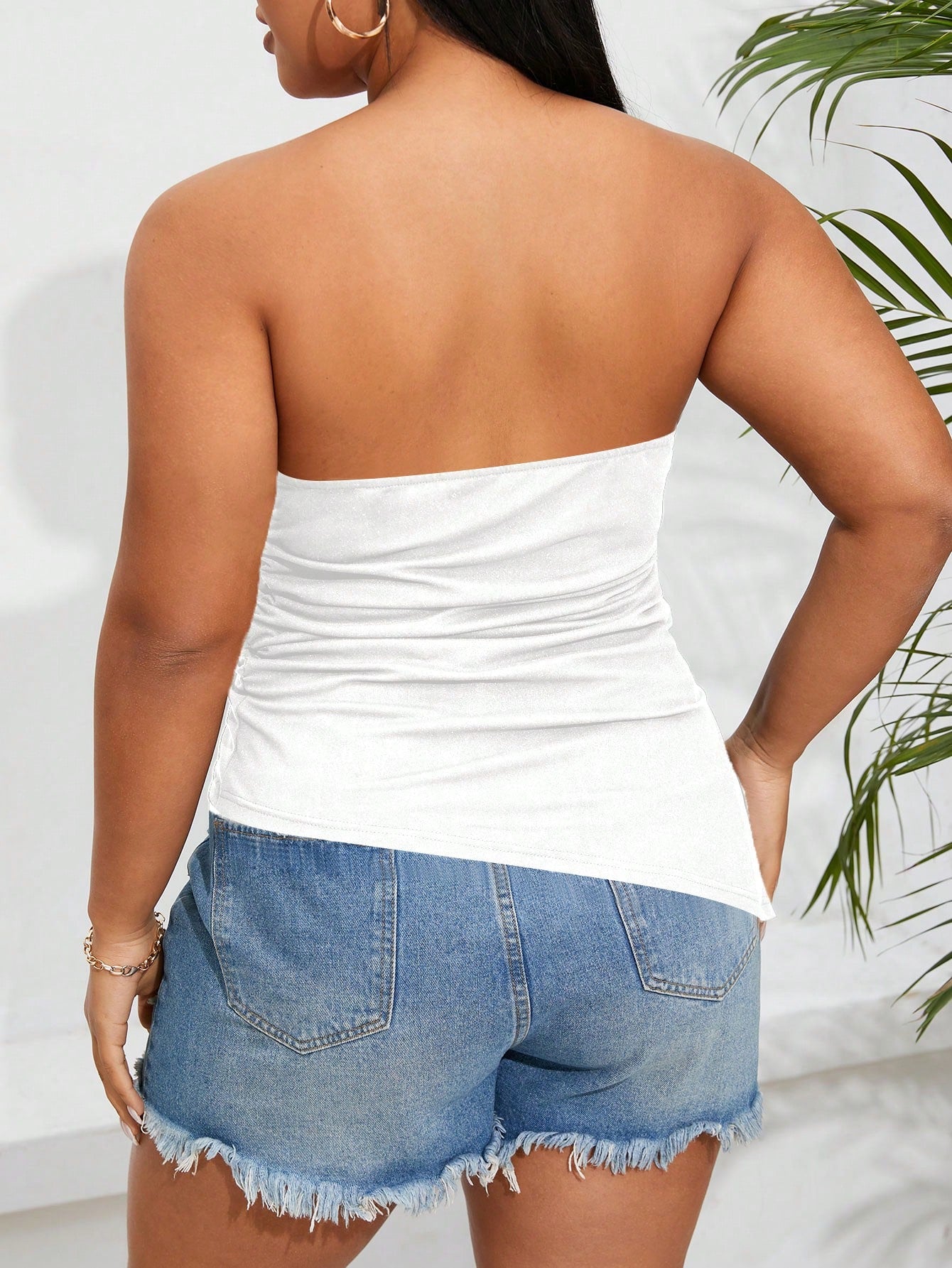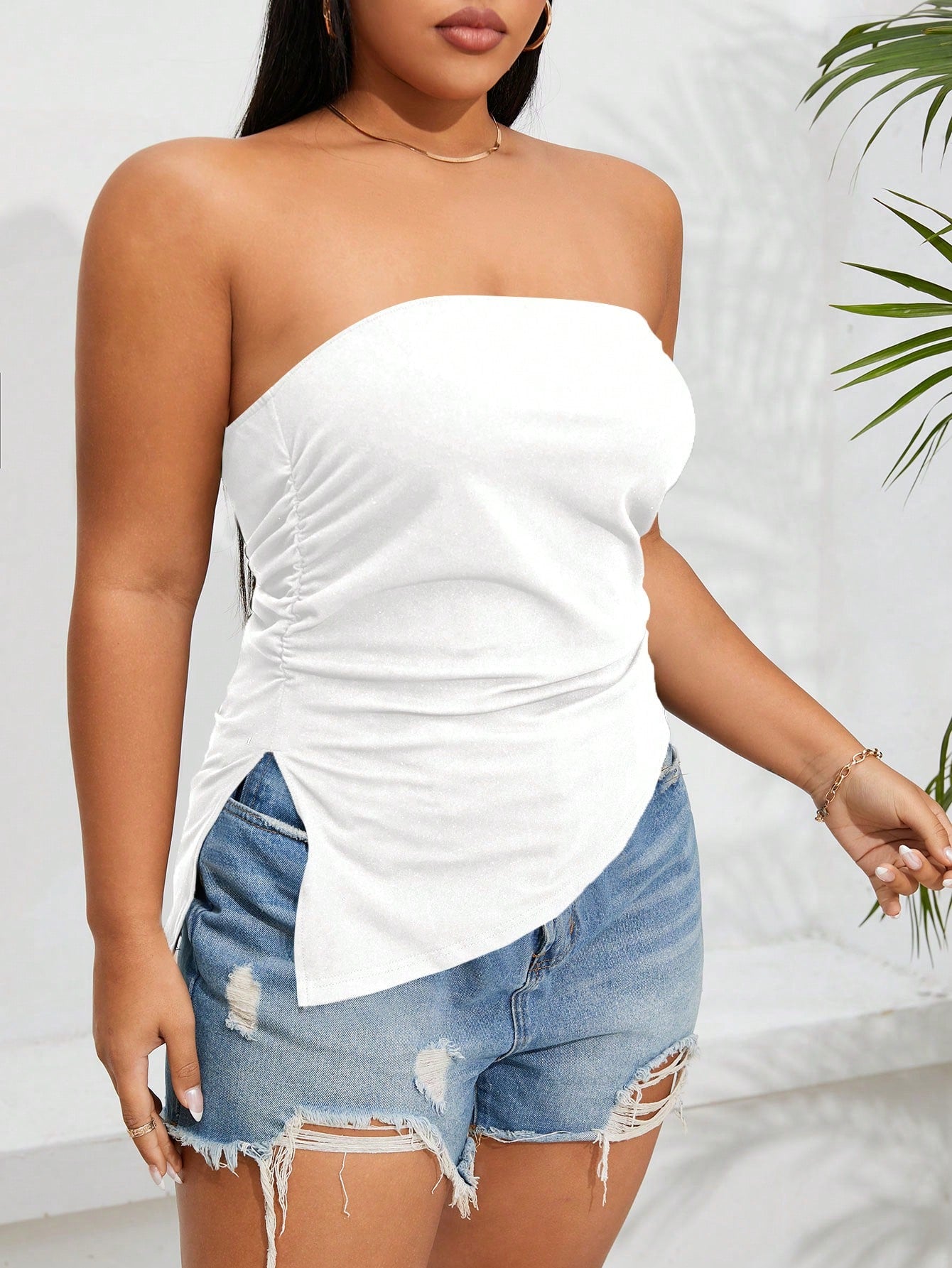 EZwear Plus Size Black Pleated Slit Strapless Knit Stretch Top