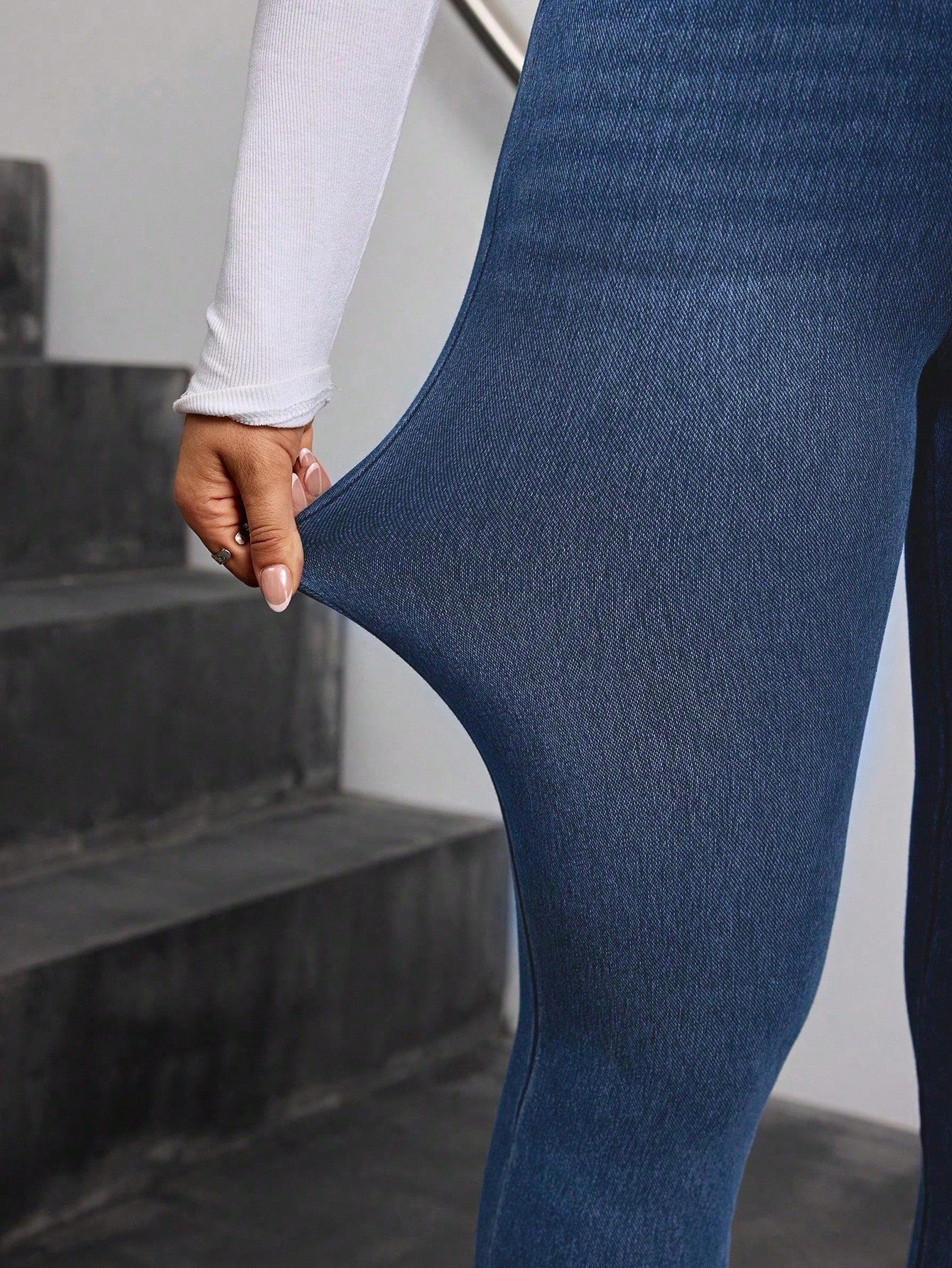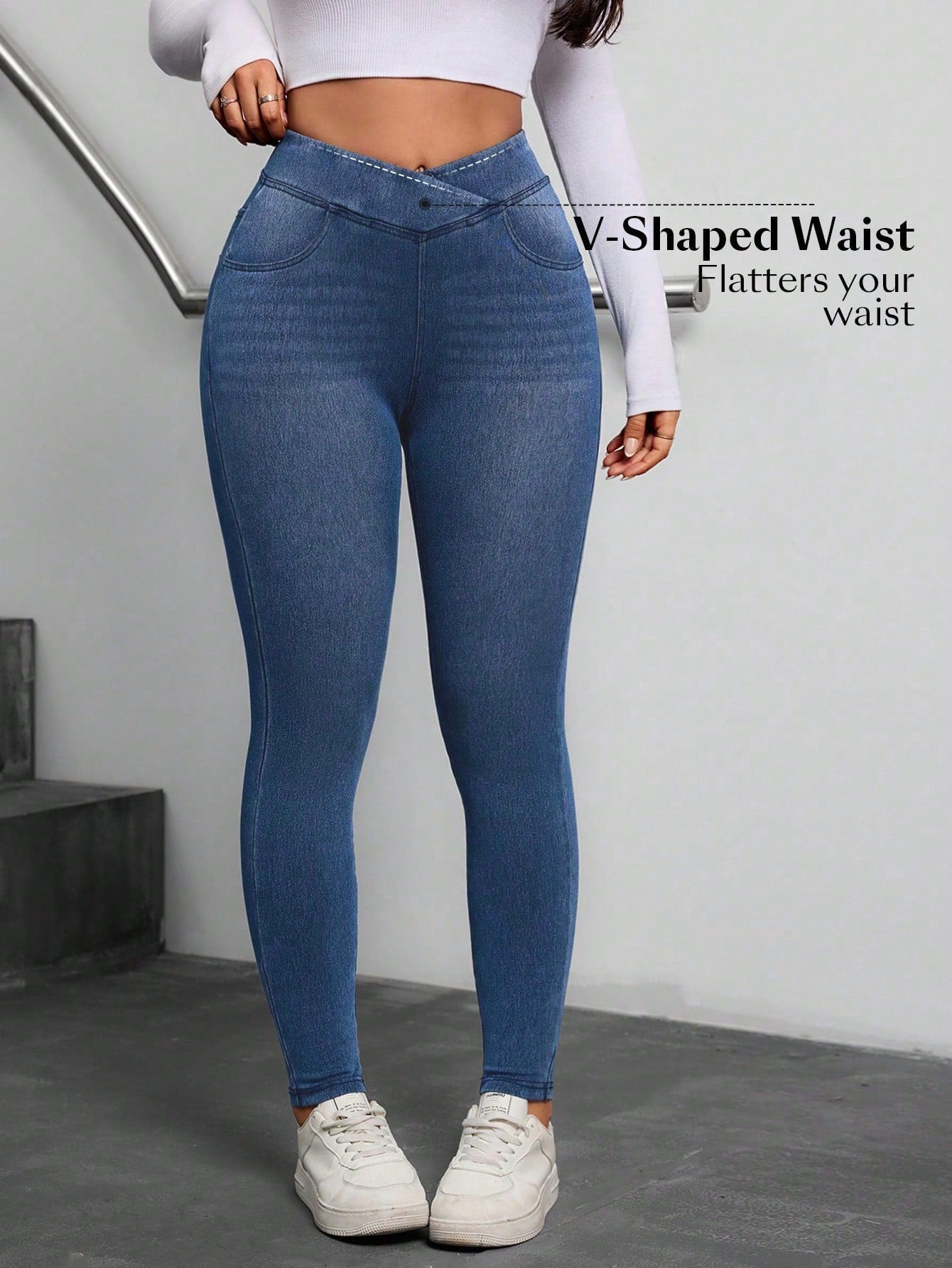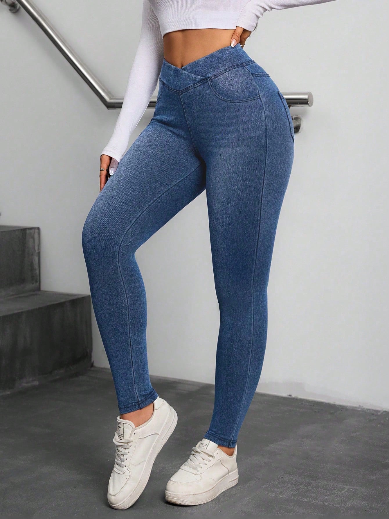 Flexra Women's Casual All-Match Cross Waistband Elastic Comfy Mid-Wash Stretch Denim Pants