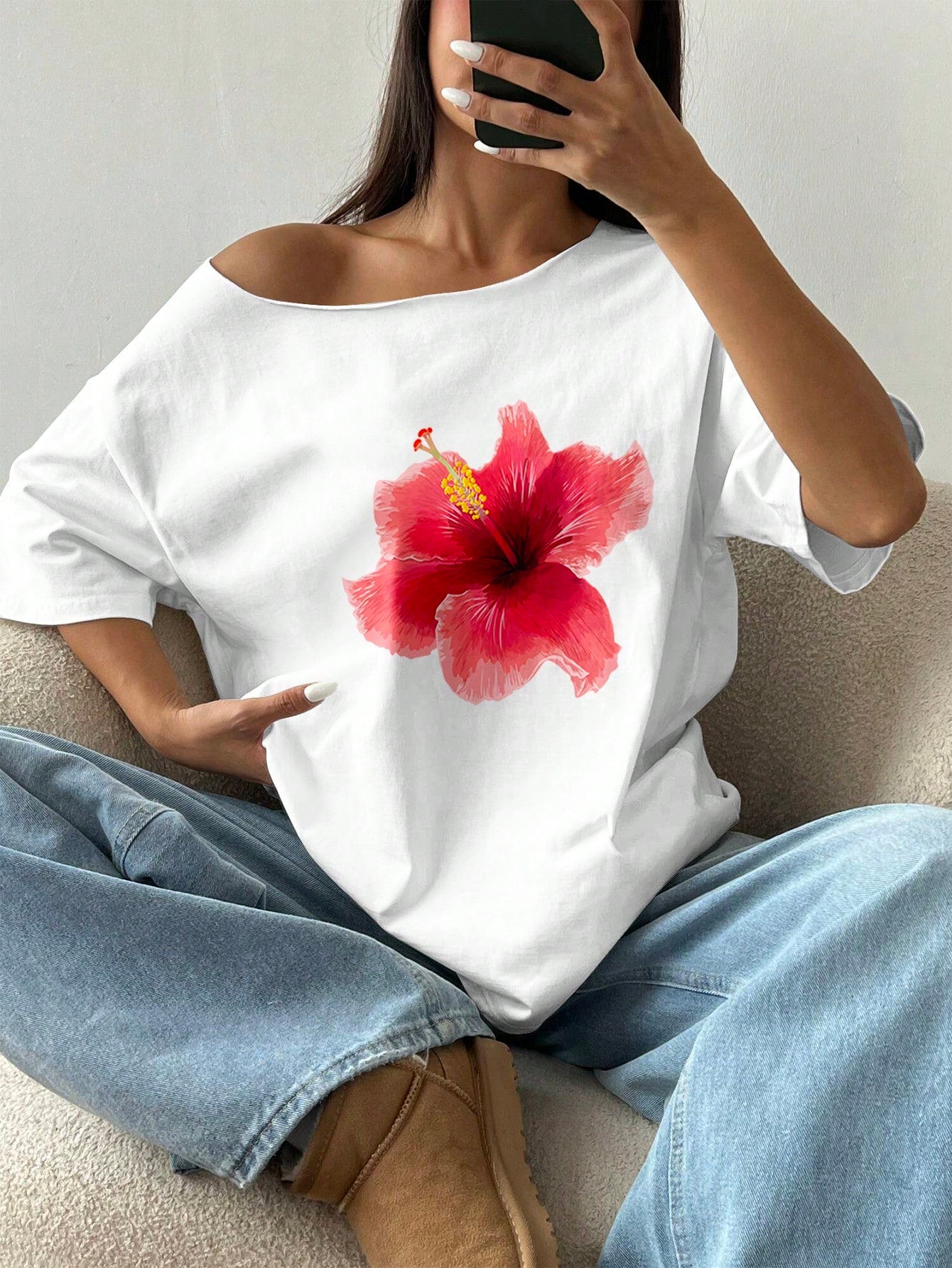 Flirla Plus Size Loose Asymmetrical Shoulder Floral Print Short Sleeve T-Shirt