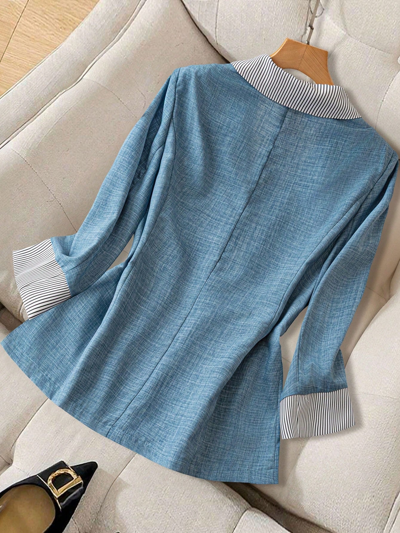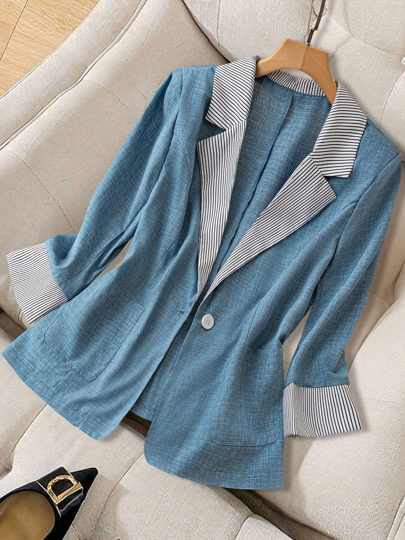 Flirla Plus Size Women Elegant Waist Cinching Black And White Stripe Collar Office Commute Simple Stylish Blazer
