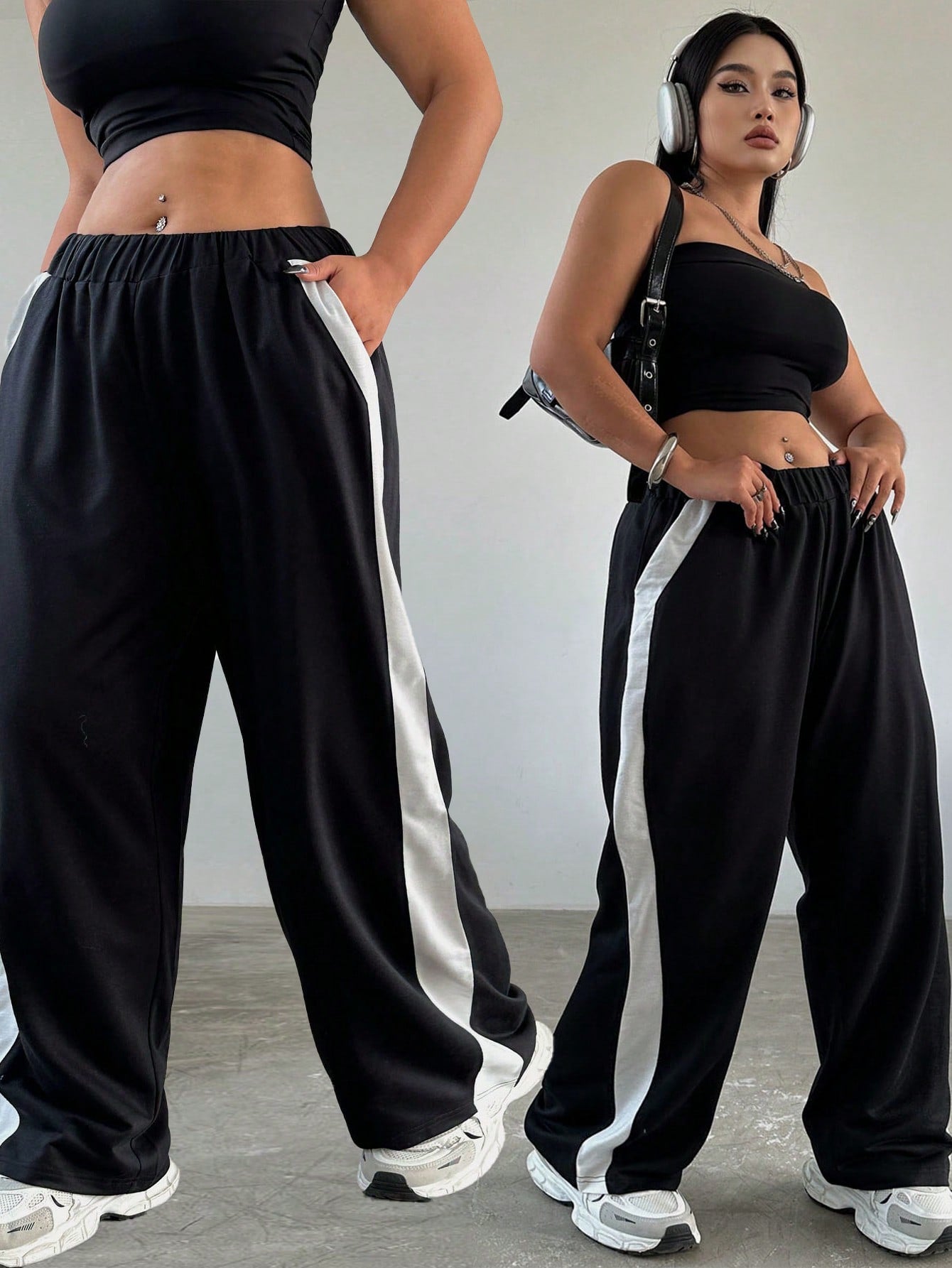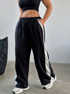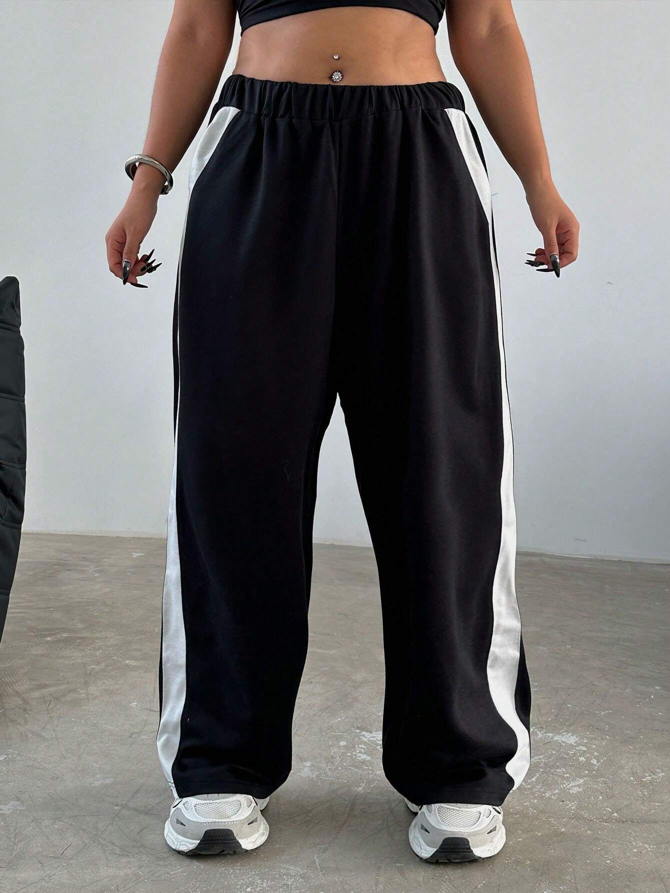 Flirla Plus Size Women's Fashionable Simple Loose Black & White Color Block Casual Pants Fall Cloth
