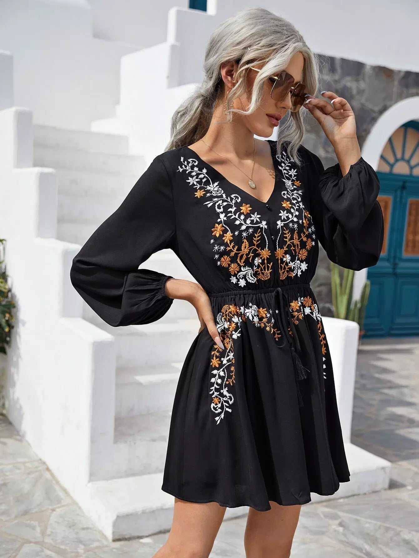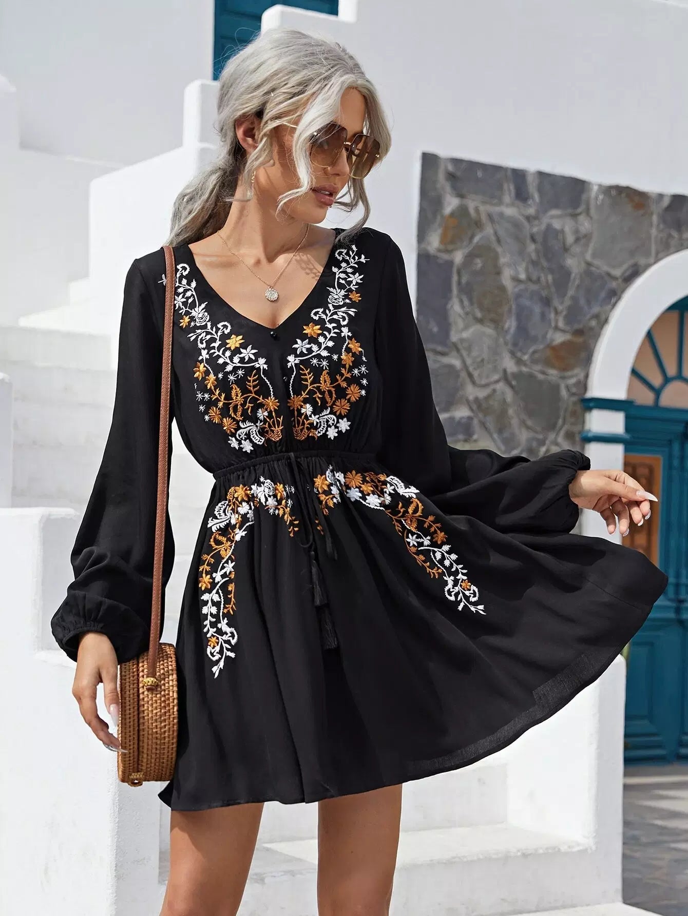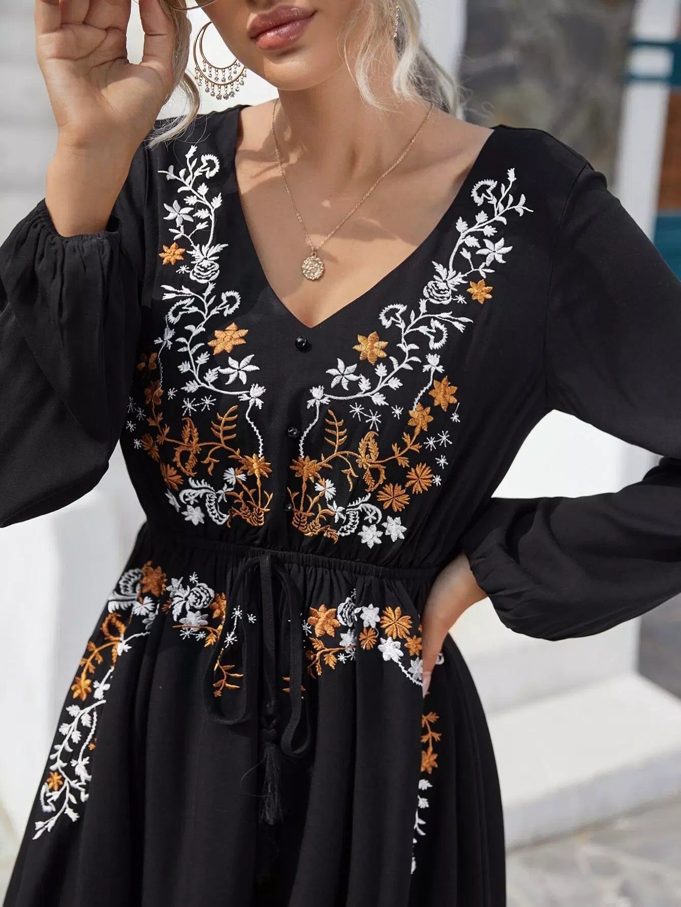 Women - Floral Embroidered Knot Front Dress