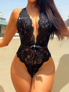 Floral Lace Plunging Neck Bow Front Teddy Bodysuit Lingerie Bow Tie