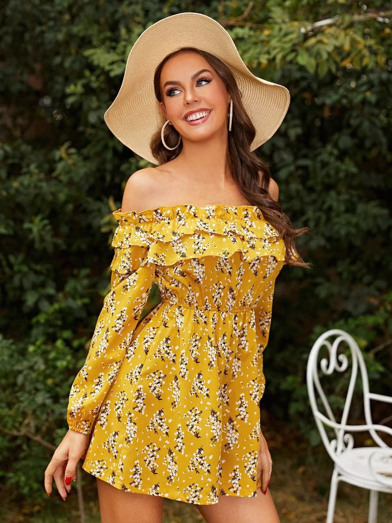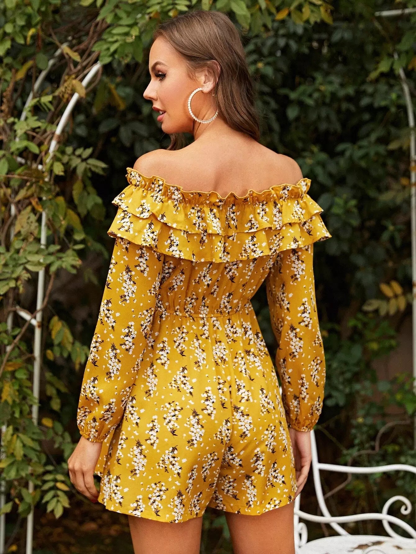 Women - Floral Layered Ruffle Trim Bardot Romper