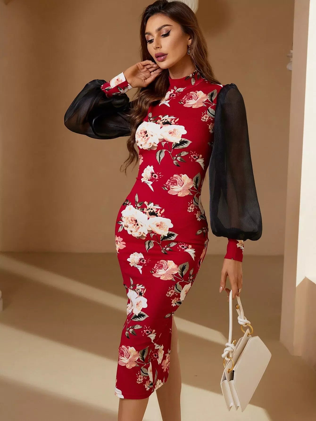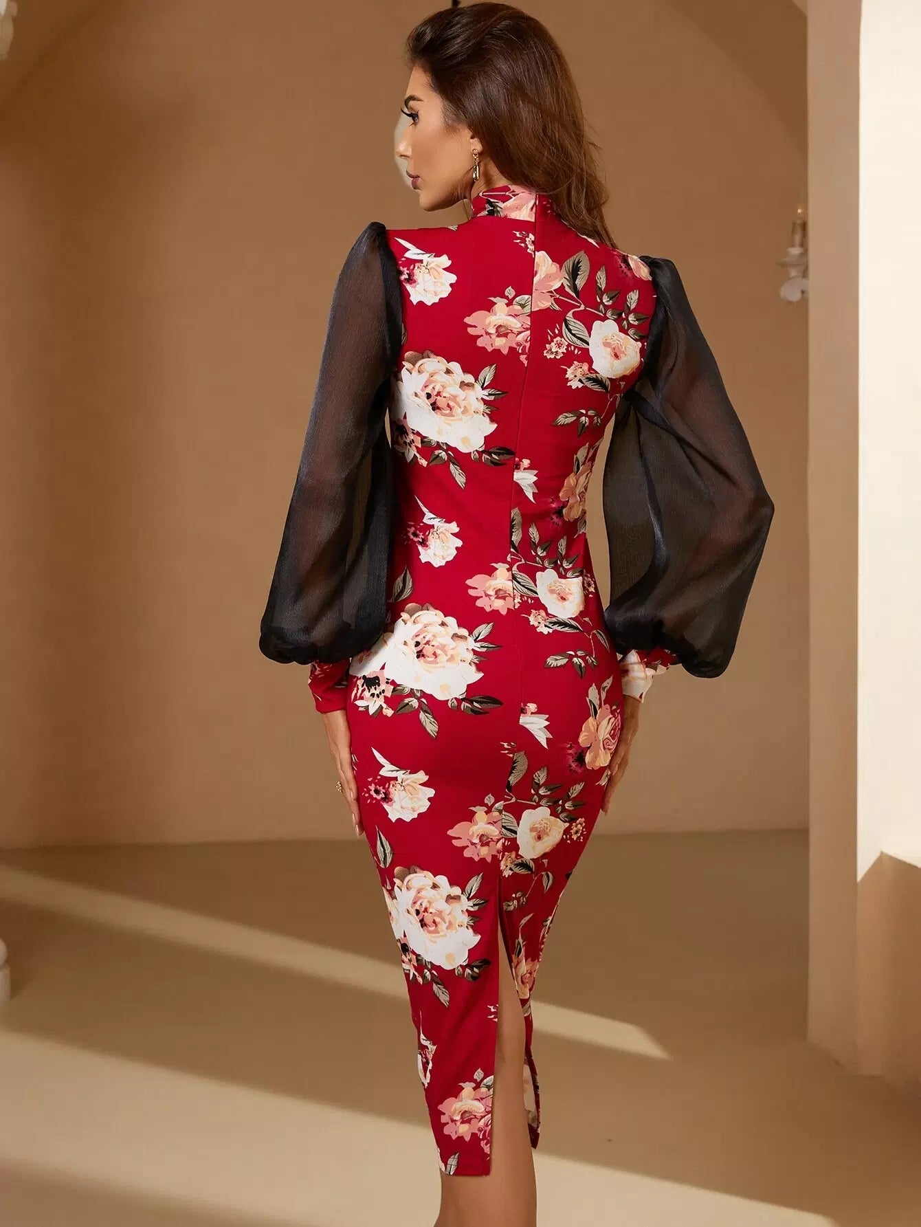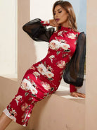 Floral Print Contrast Mesh Lantern Sleeve Slit Back Bodycon Dress