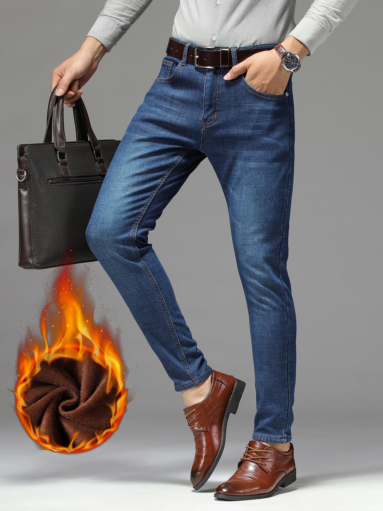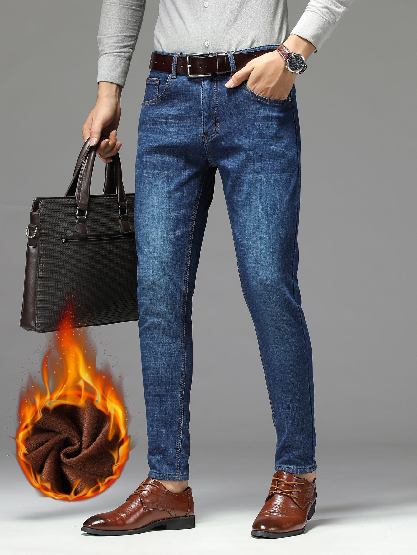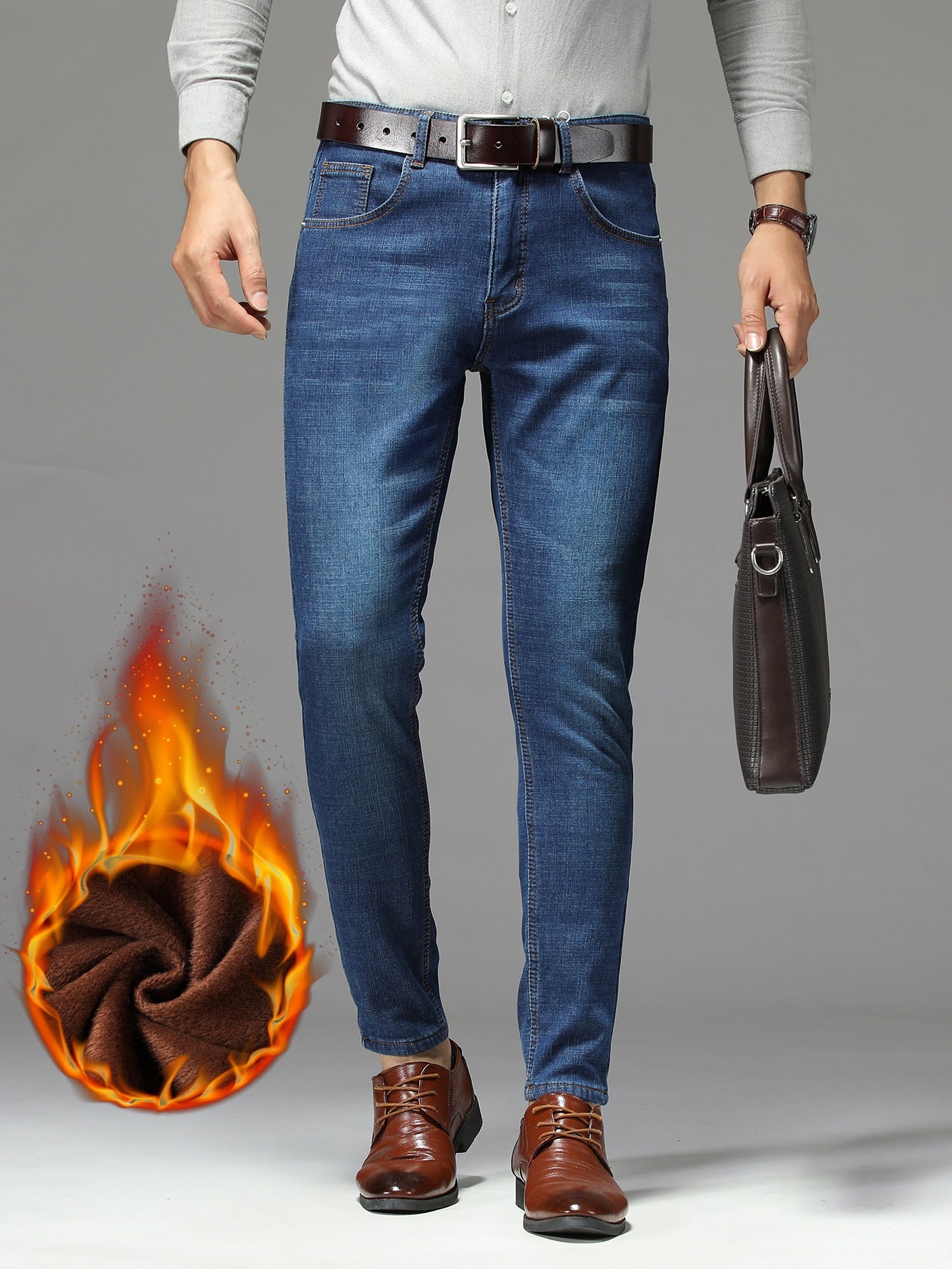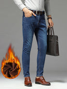 Men Bleach Wash Thermal Jeans Without Belt