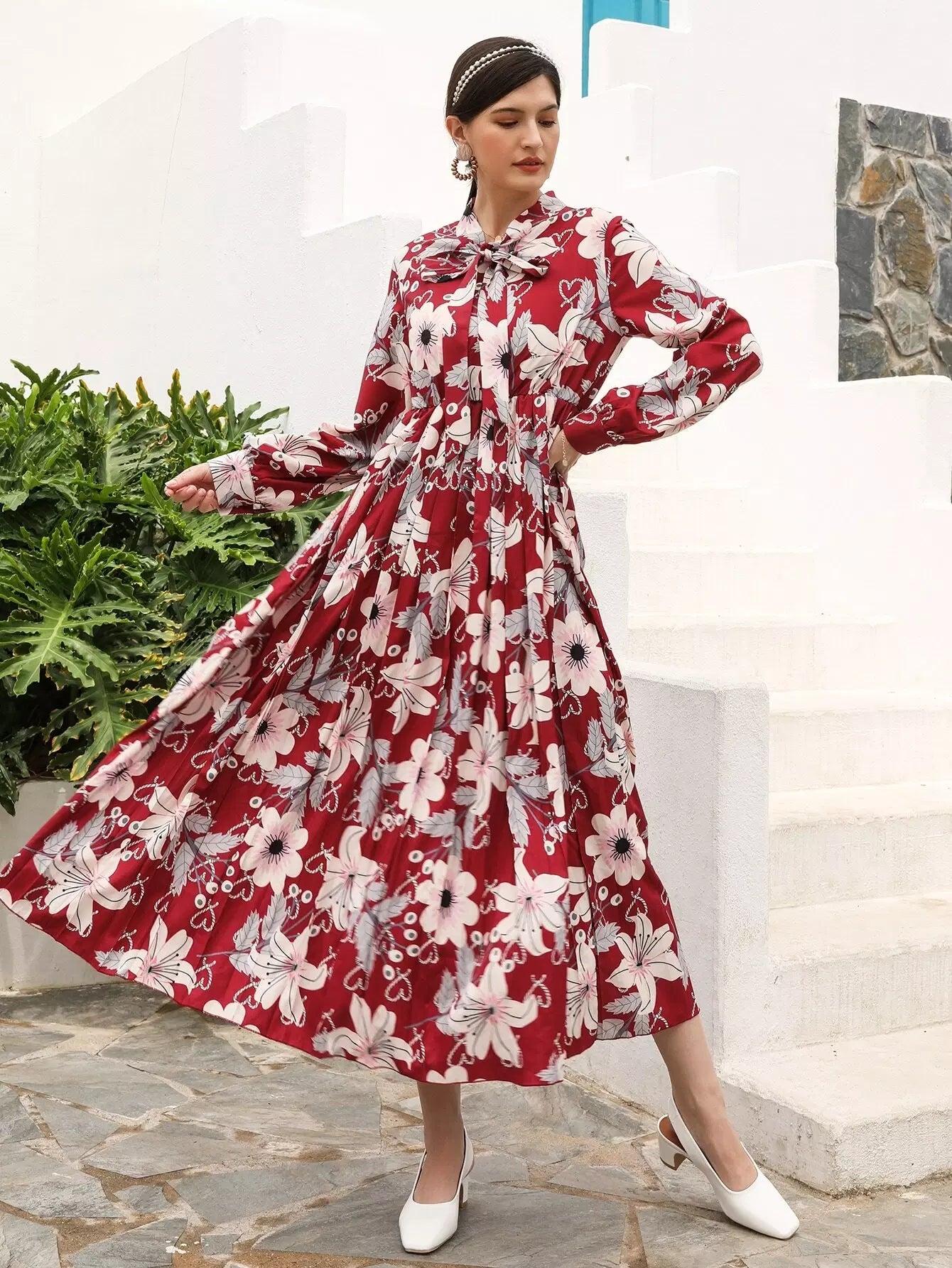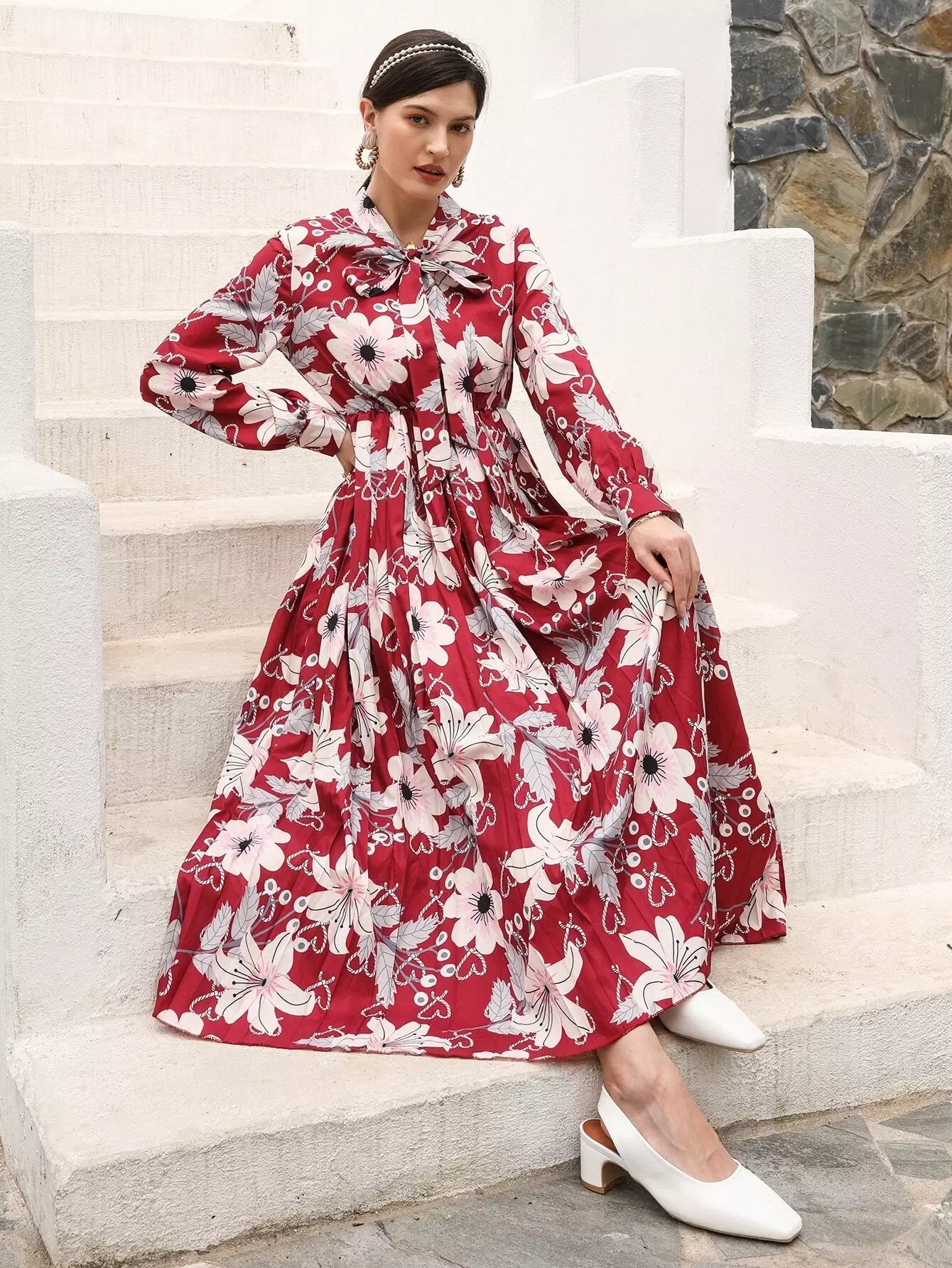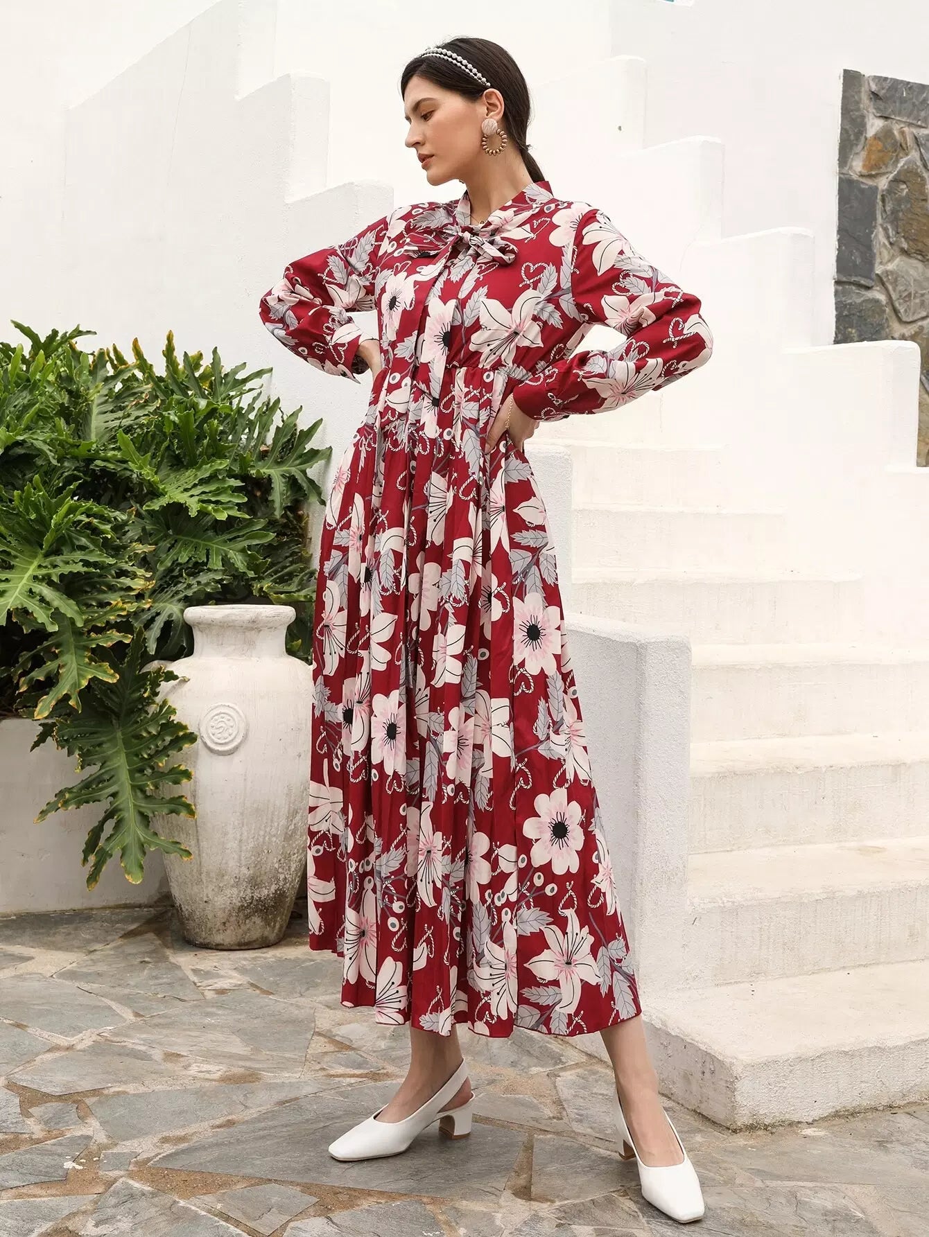 Floral Print Tie Neck Dress