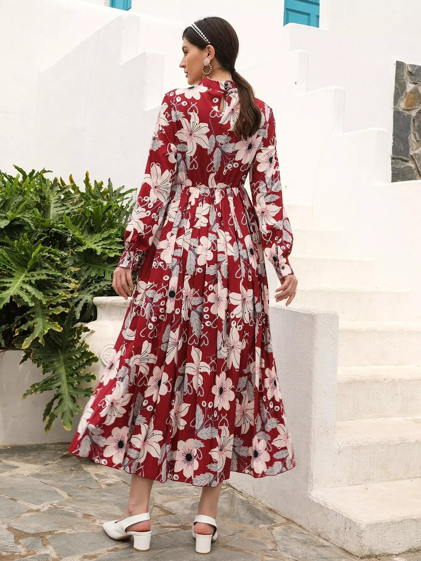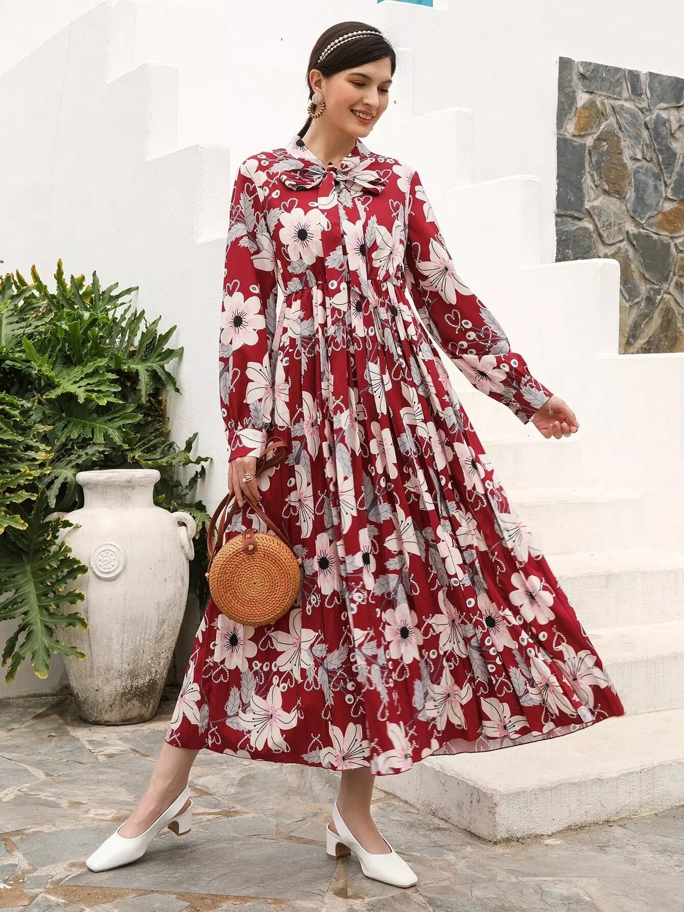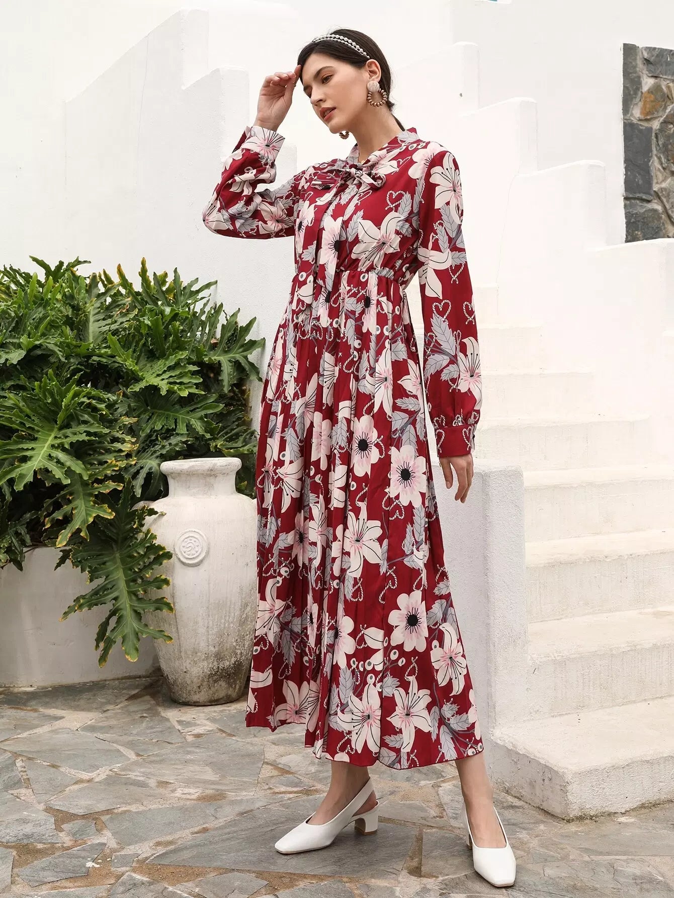 Floral Print Tie Neck Dress