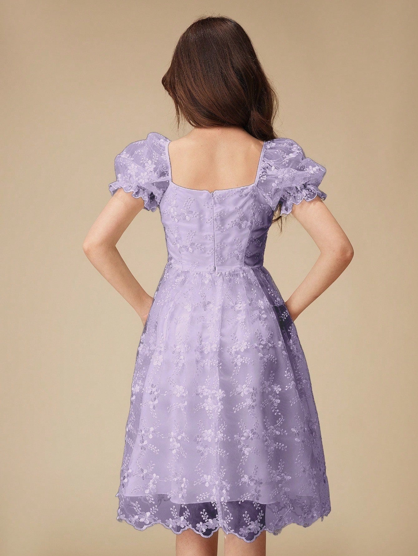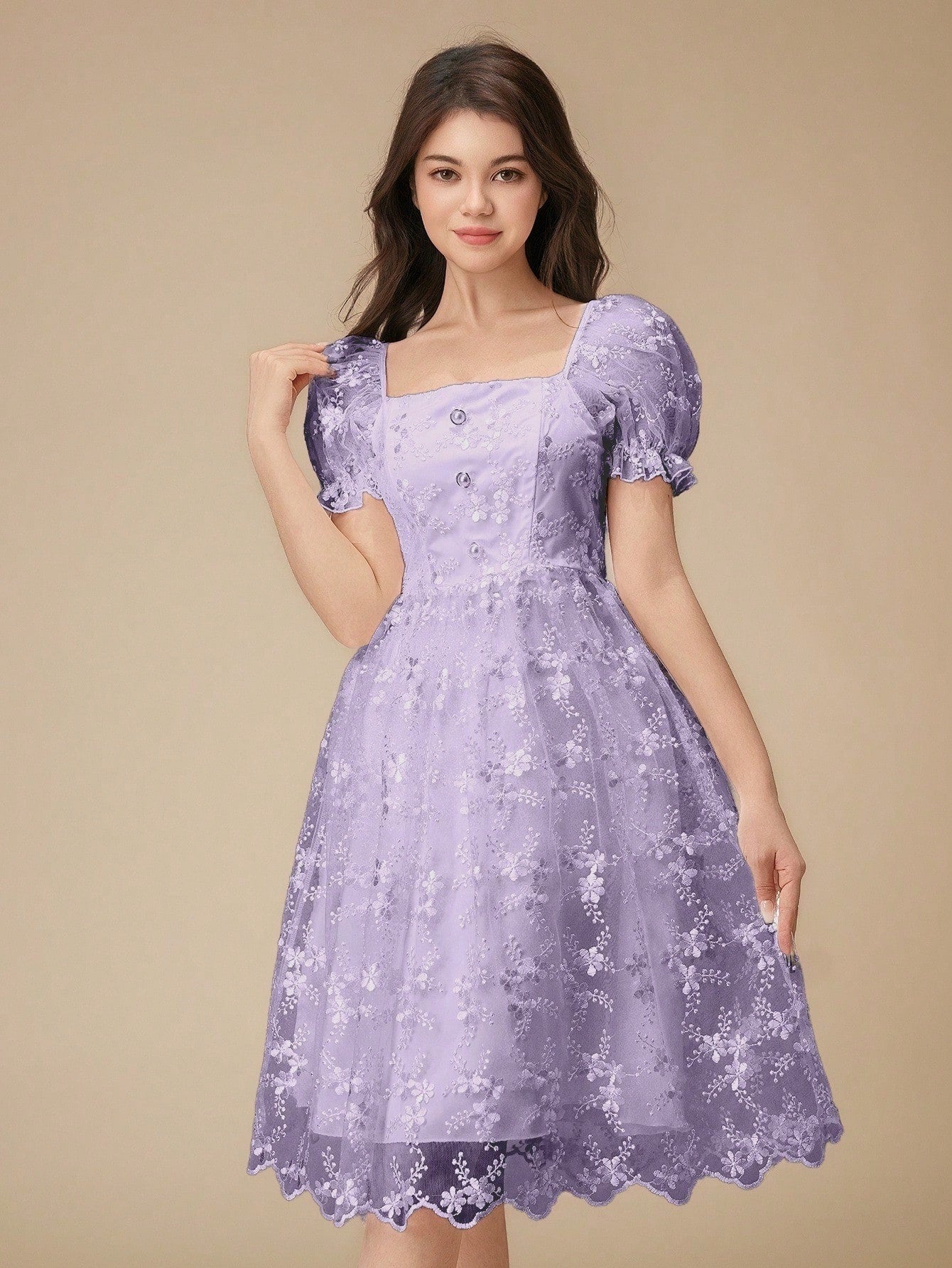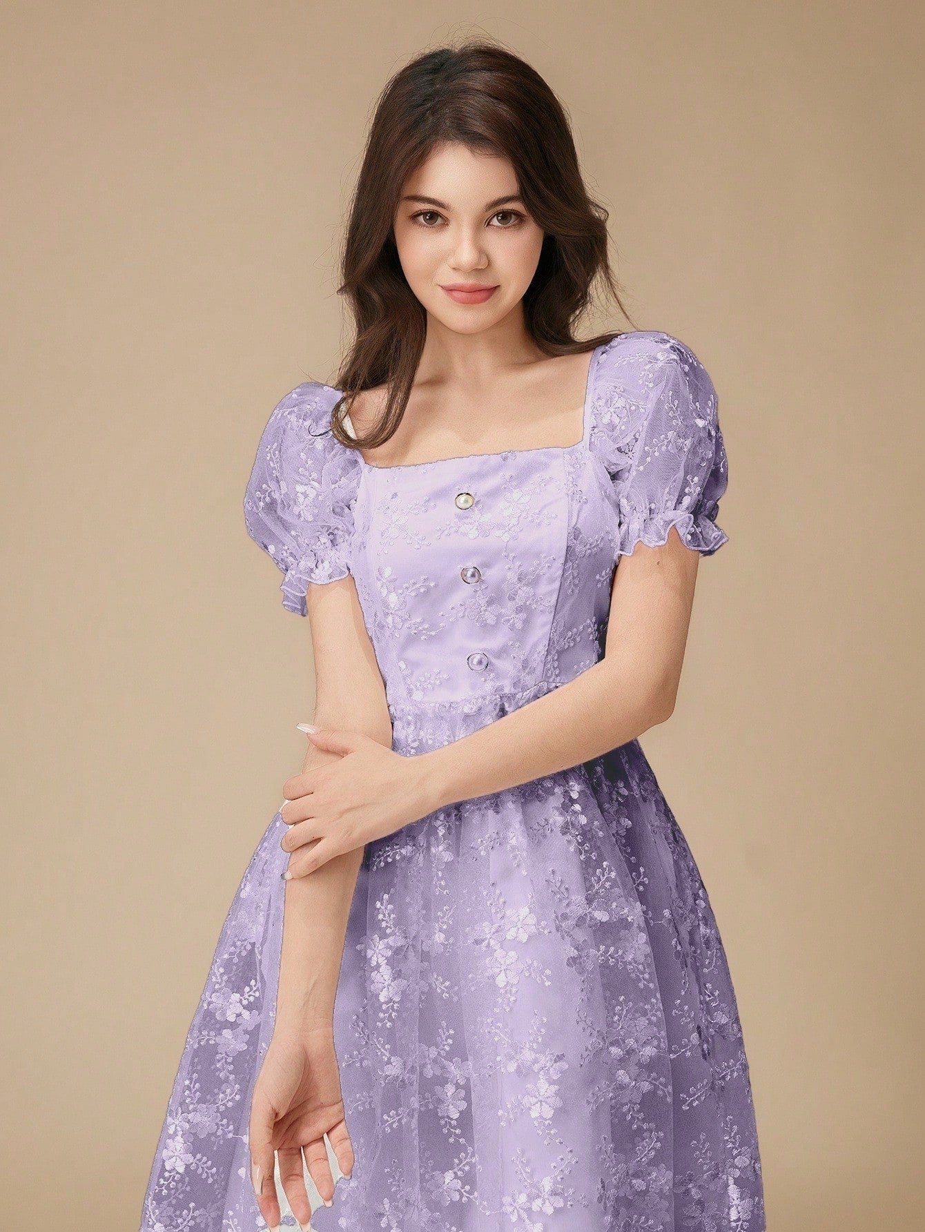 Floral Puff Sleeve Square Neck Dress With Pearl Buttons And Mesh Embroidery, Suitable For Flower Girls,