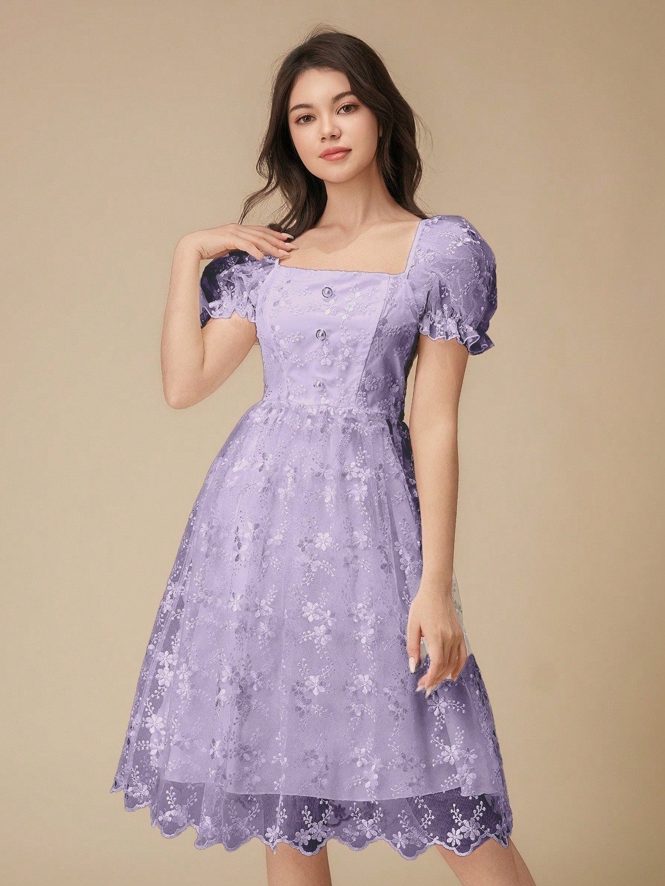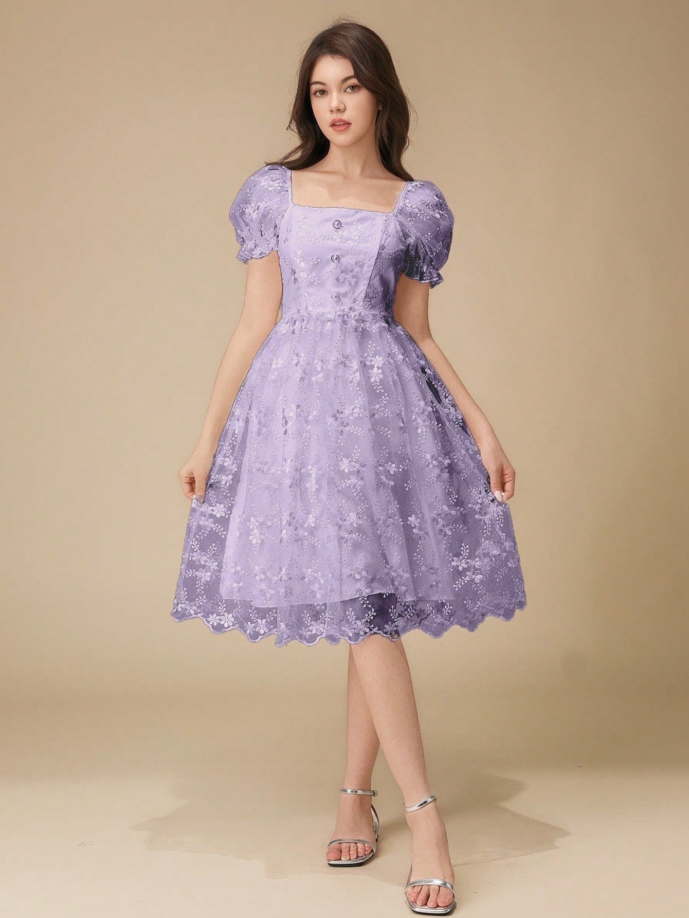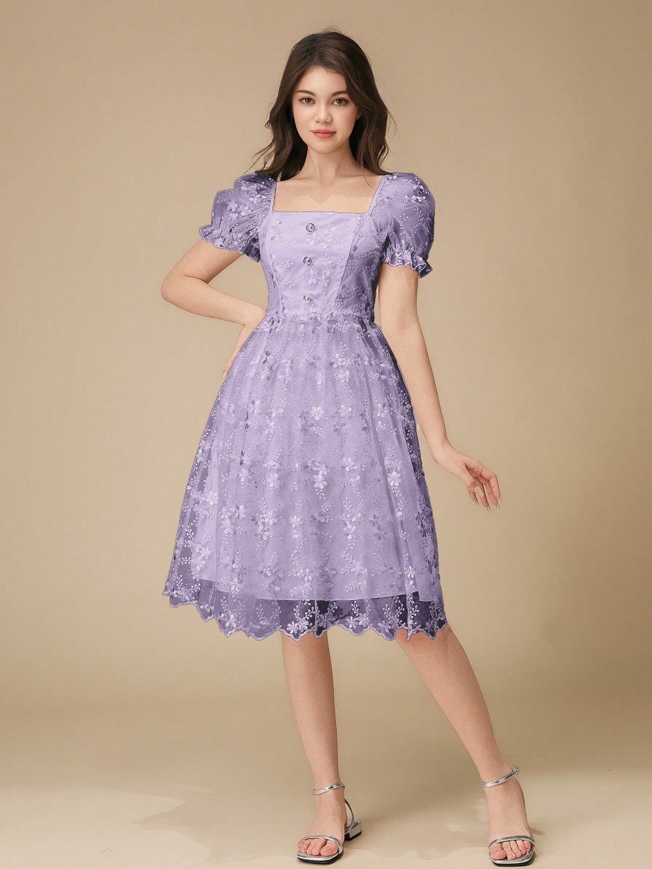 Floral Puff Sleeve Square Neck Dress With Pearl Buttons And Mesh Embroidery, Suitable For Flower Girls,
