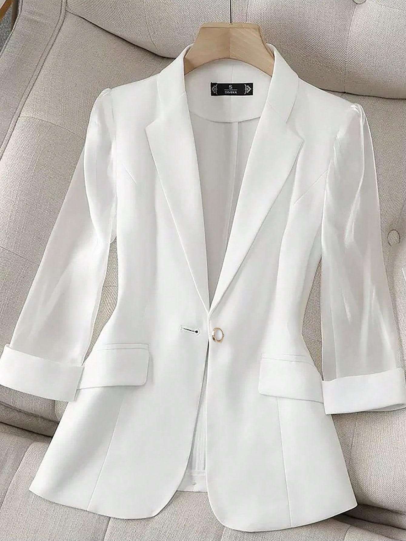 Franclia Casual Chiffon White 3/4 Sleeve Blazer, Graceful Jacket