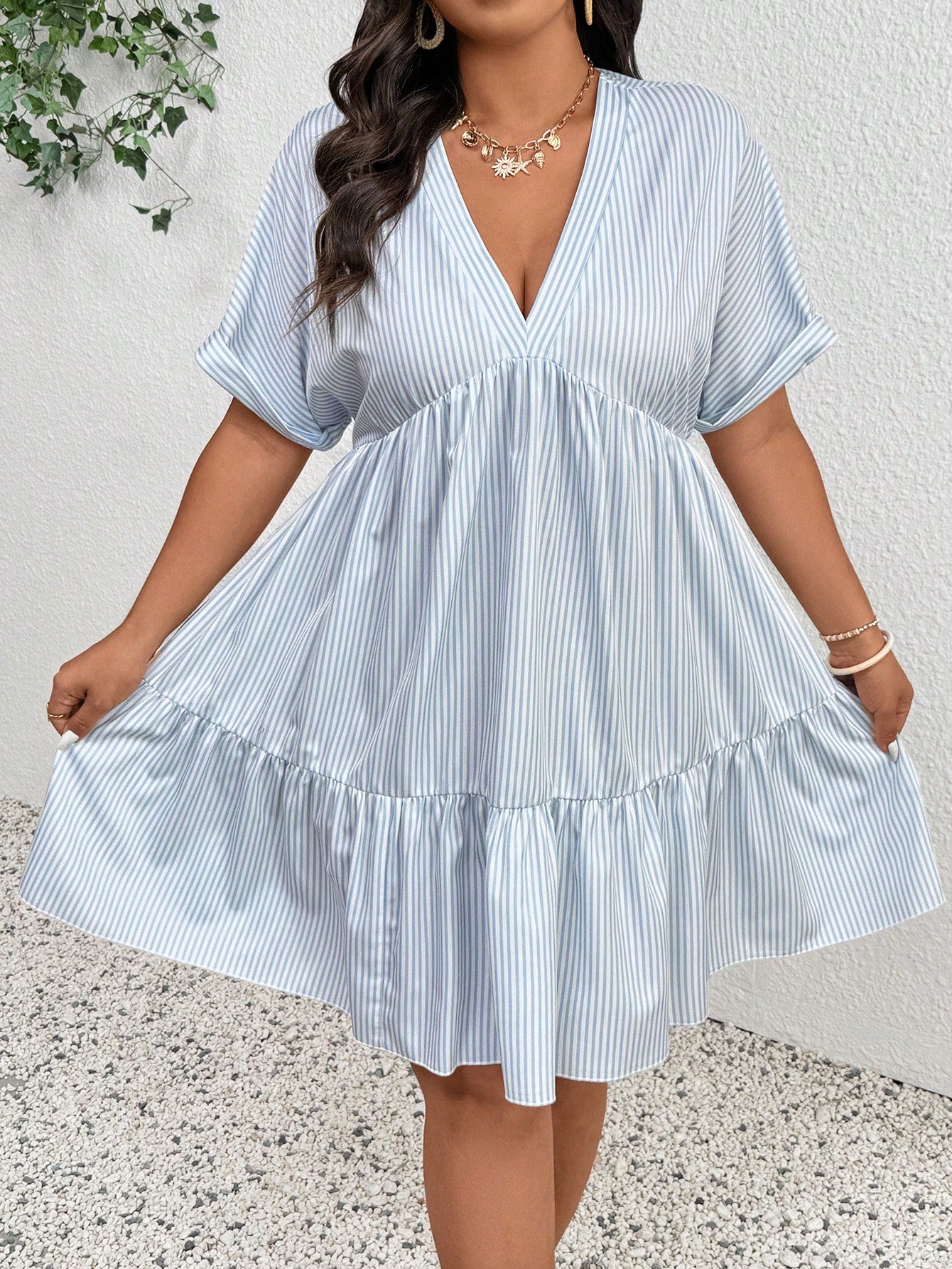 Frenchy Plus Size Casual Simple Vacation Blue & White Striped V-Neck Babydoll Dress