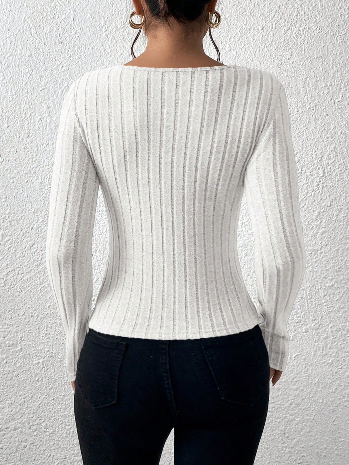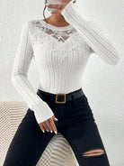 Frenchy Solid Color Lace Patchwork Ribbed Crew Neck Long Sleeve T-Shirt Winter White Casual Spring