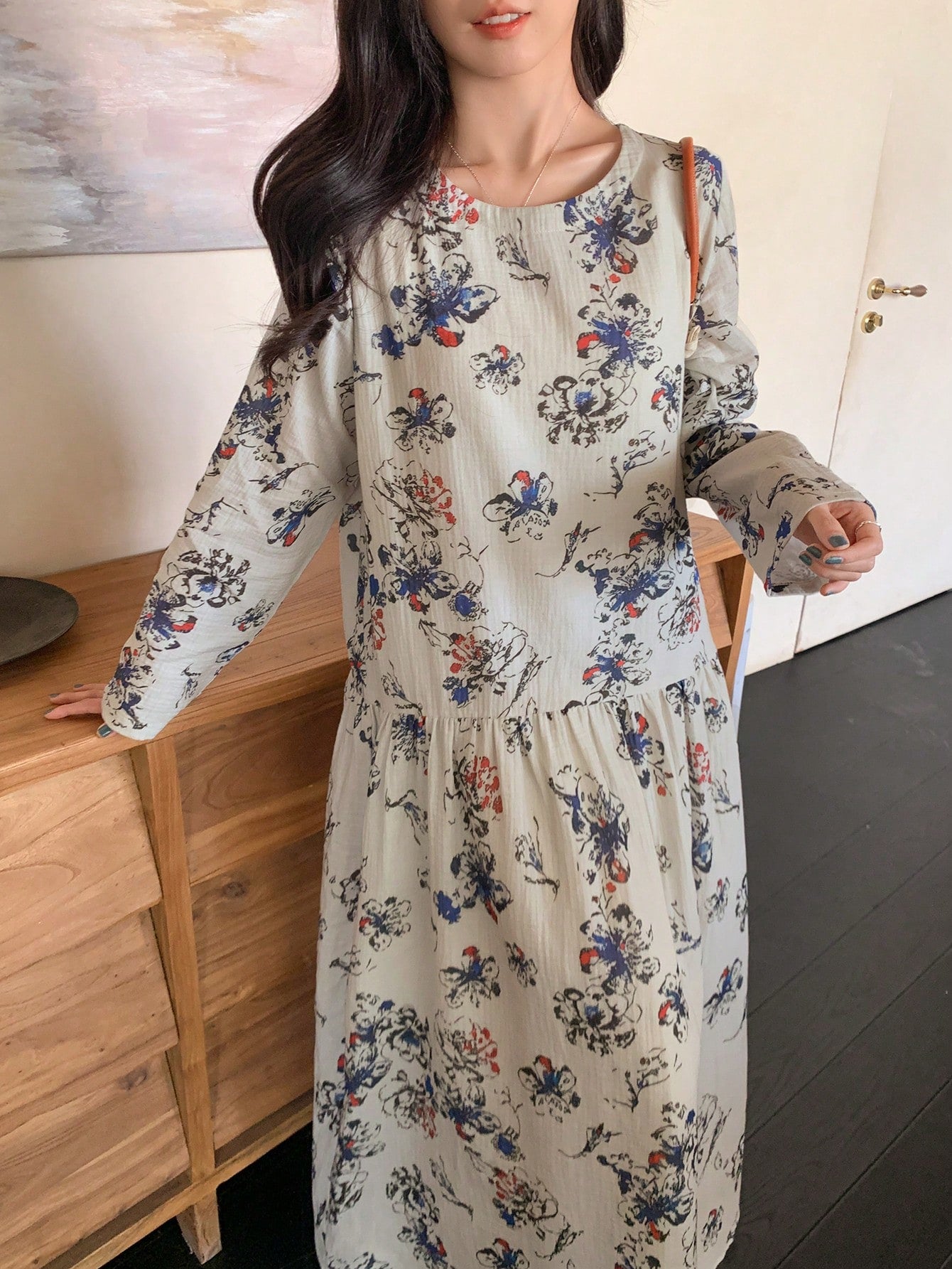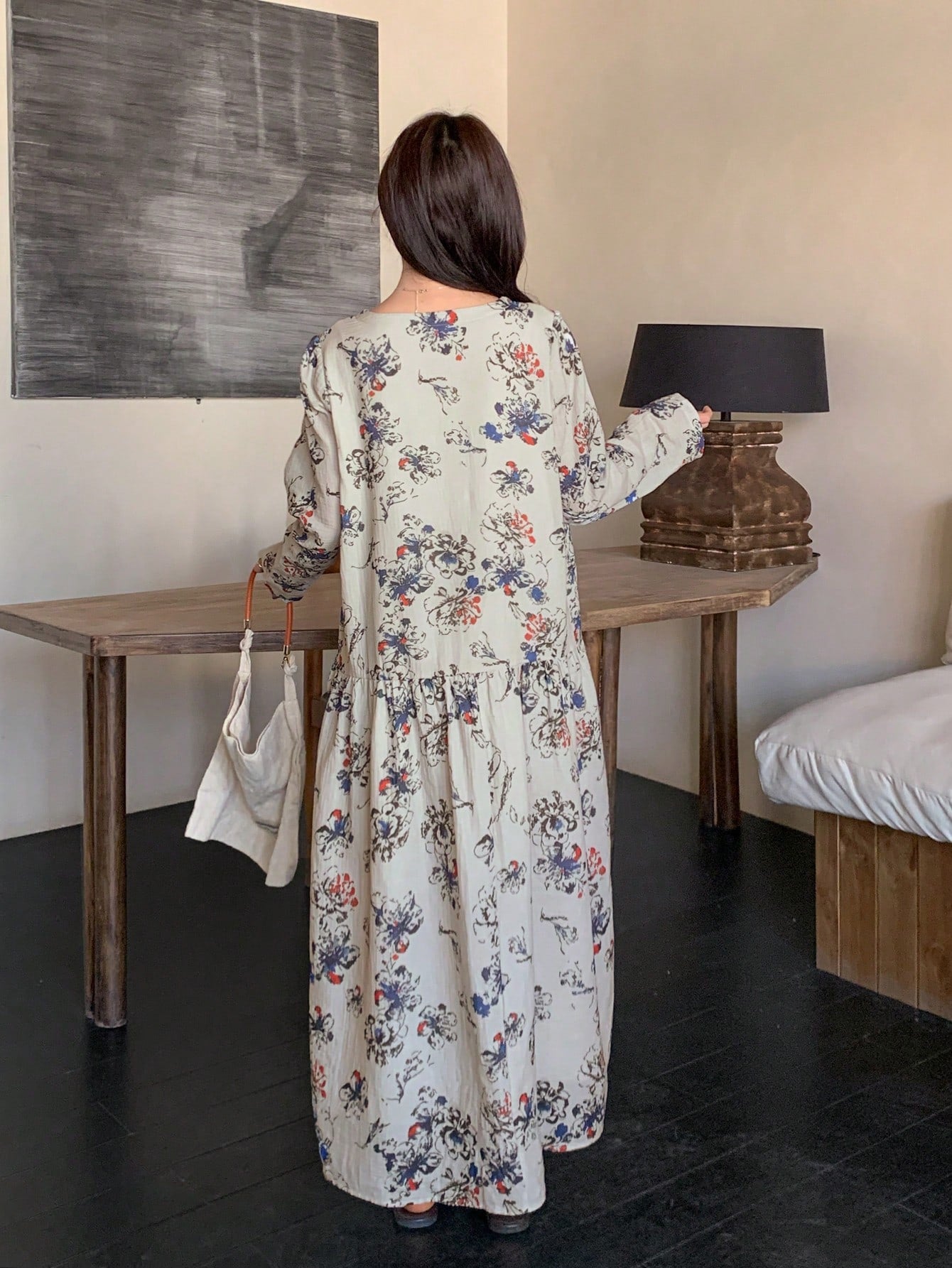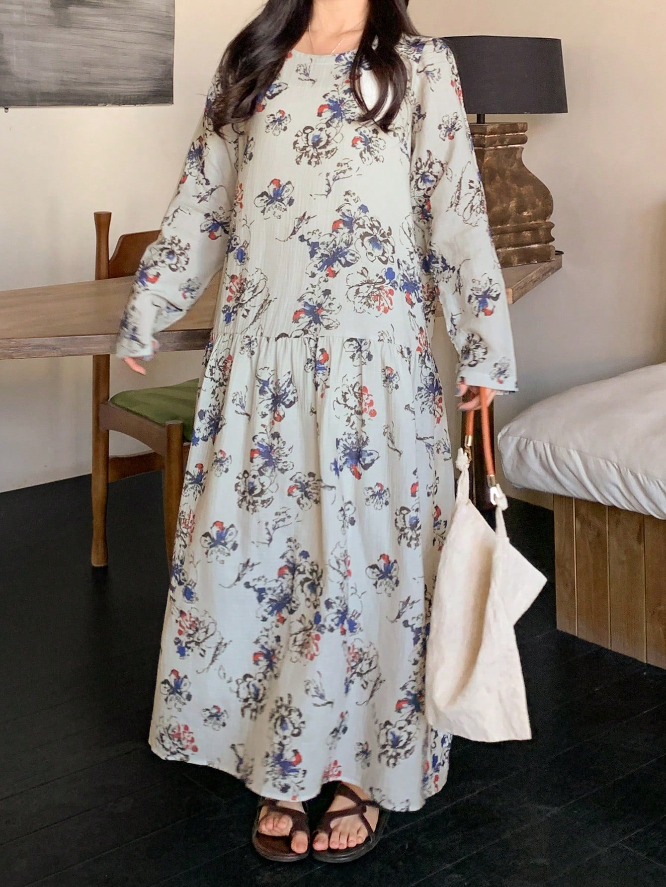 FRIFUL Women Ditsy Floral Linen Dress, Spring Fashion,Fall Dress Long Sleeve Dress