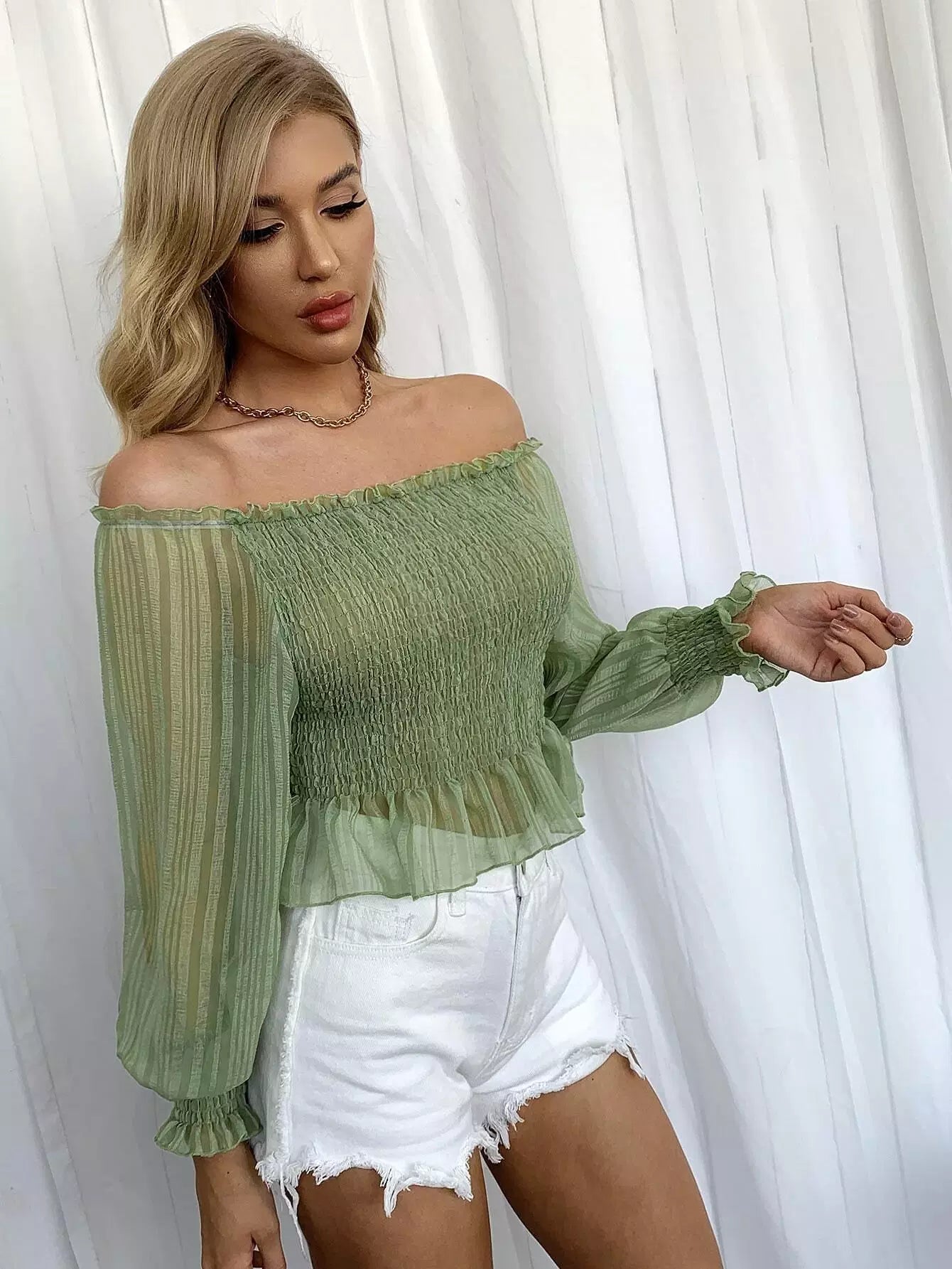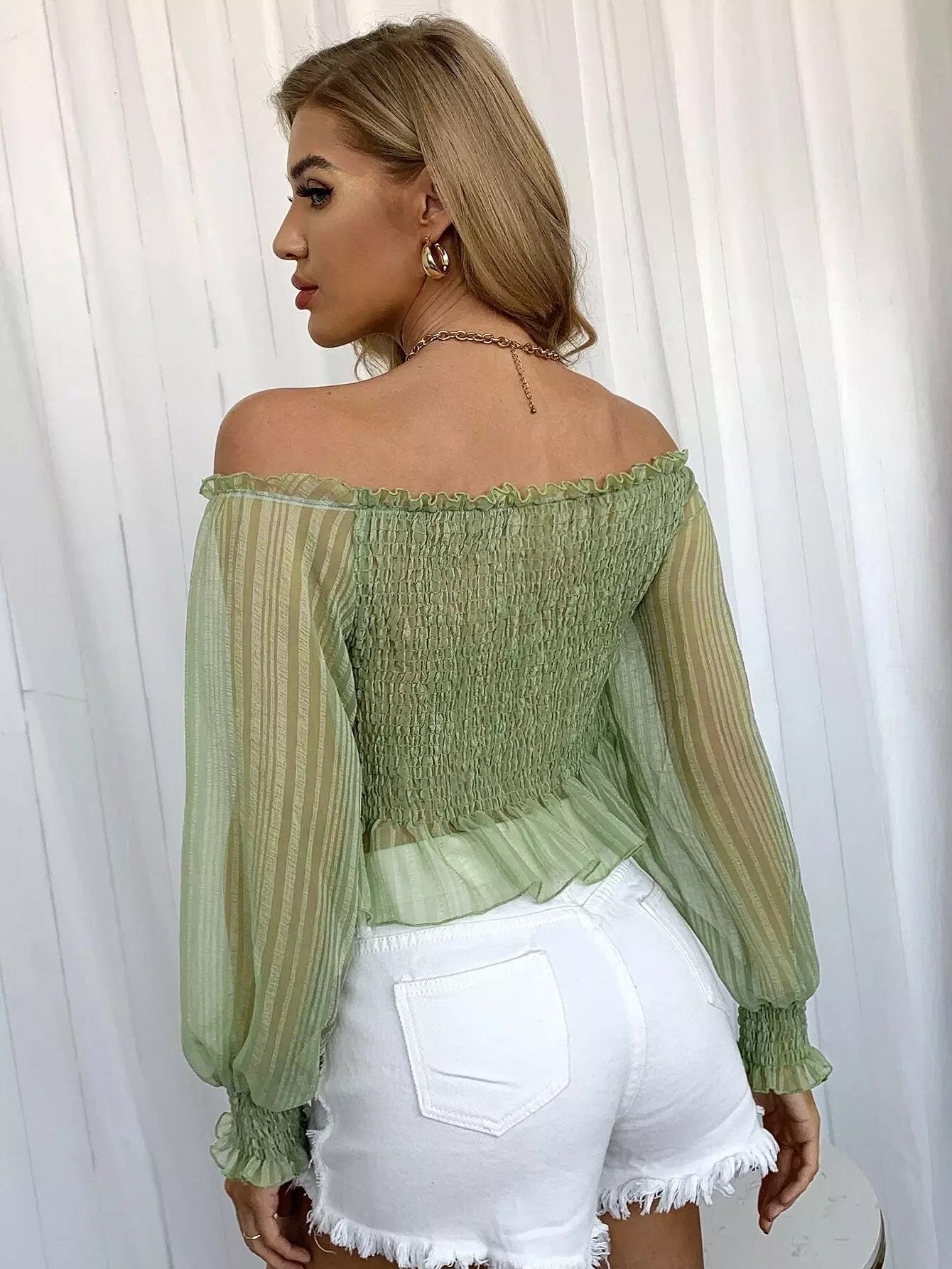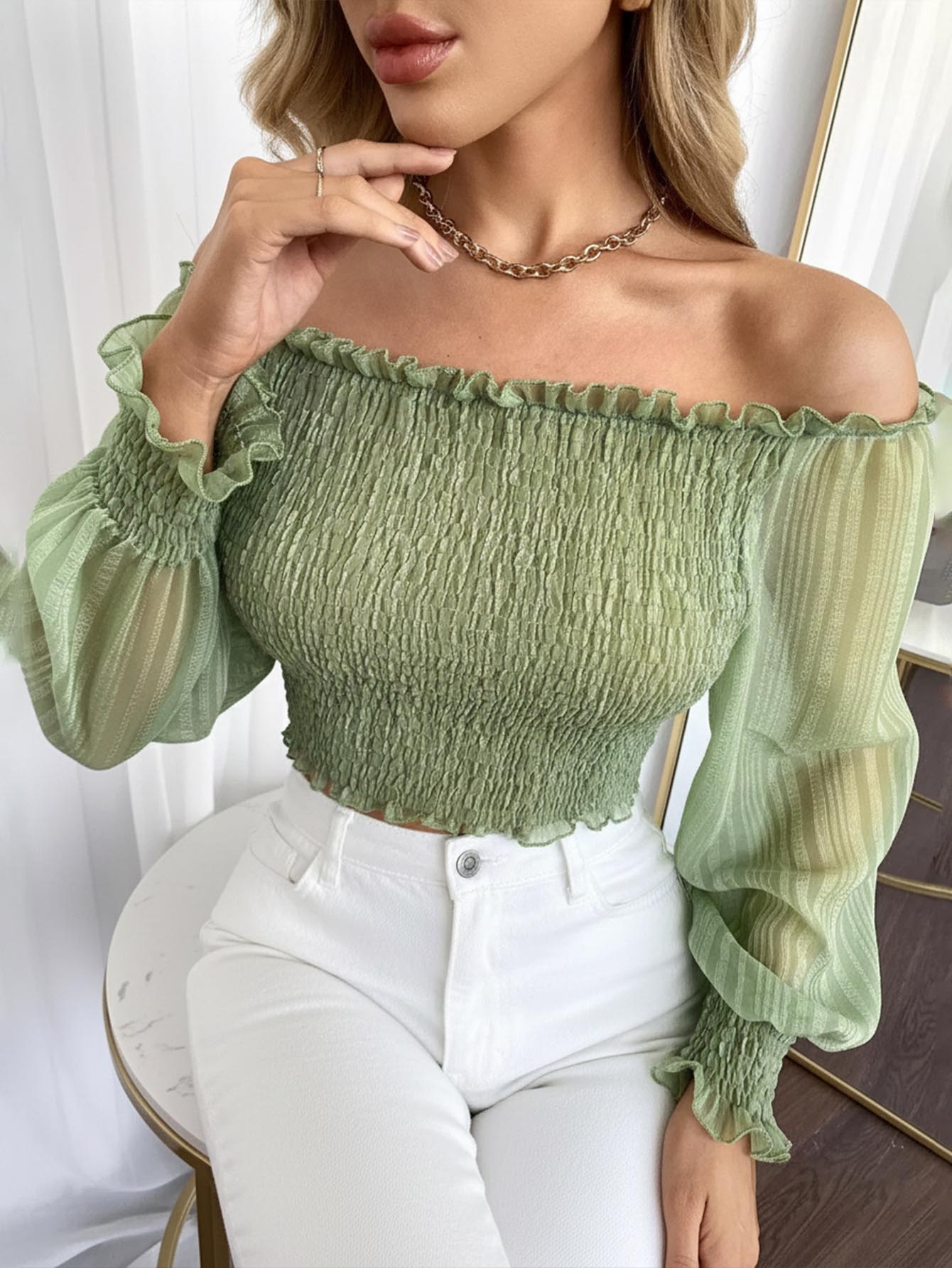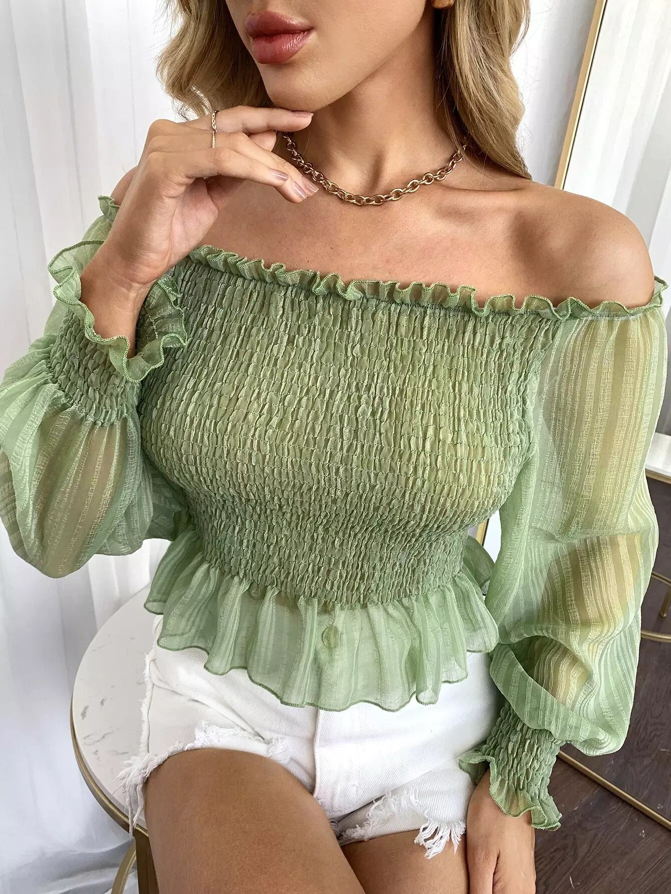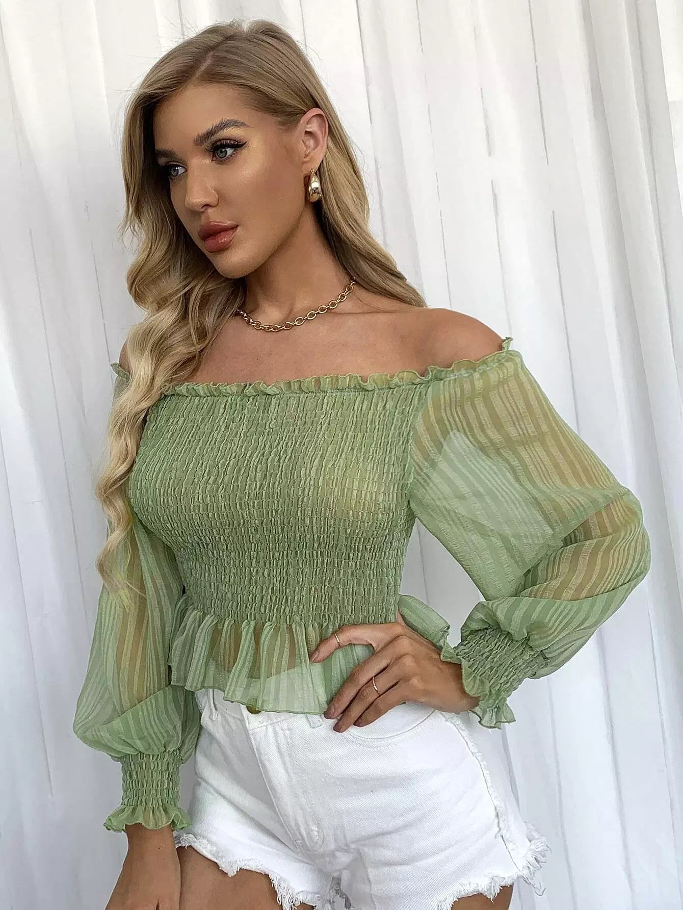 Frill Off Shoulder Lantern Sleeve Shirred Peplum Top